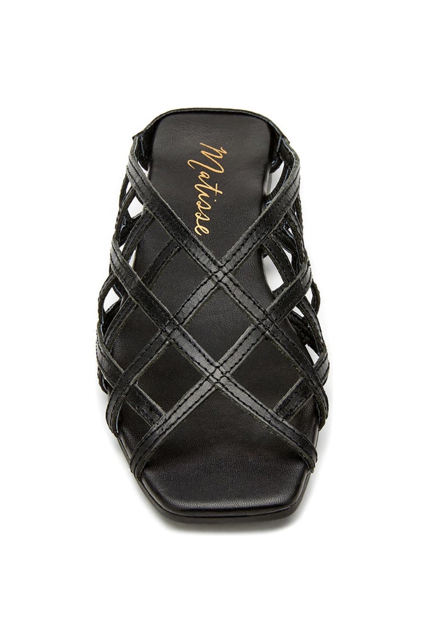 Leather slides featuring a caged leather upper and a modern square toe.
