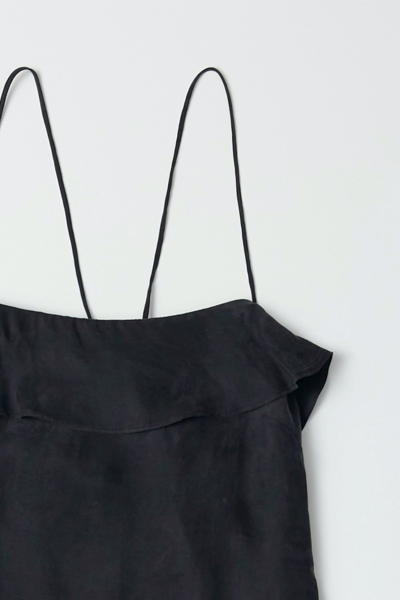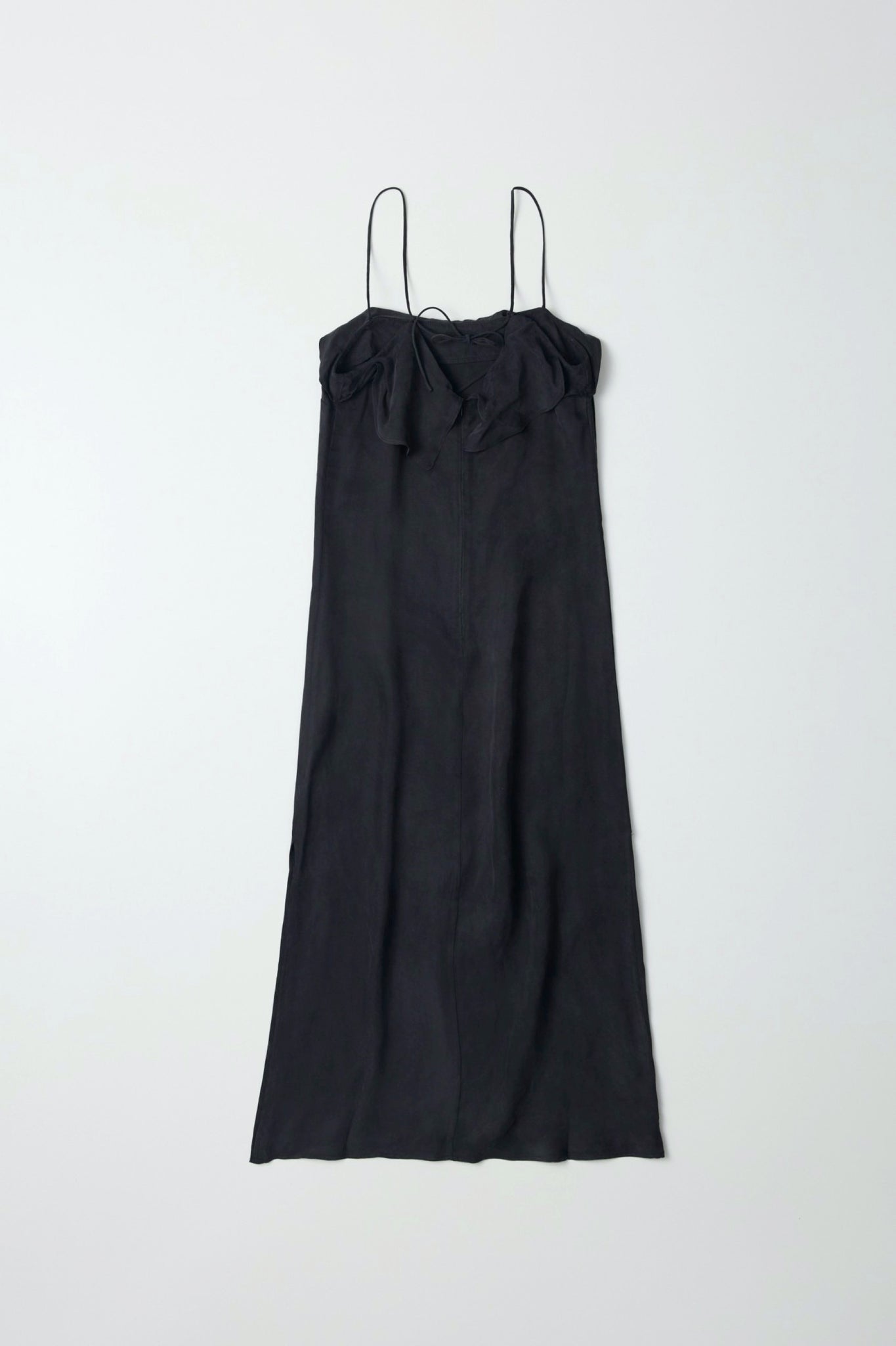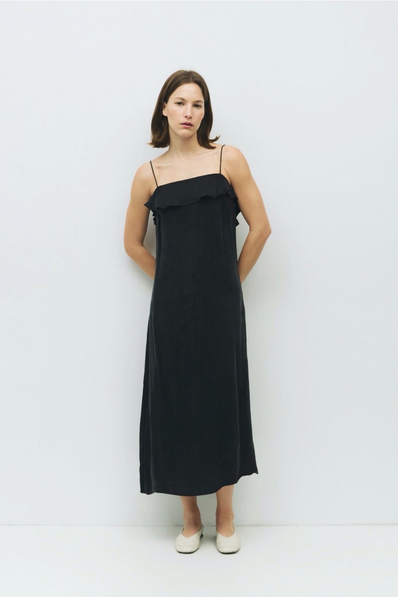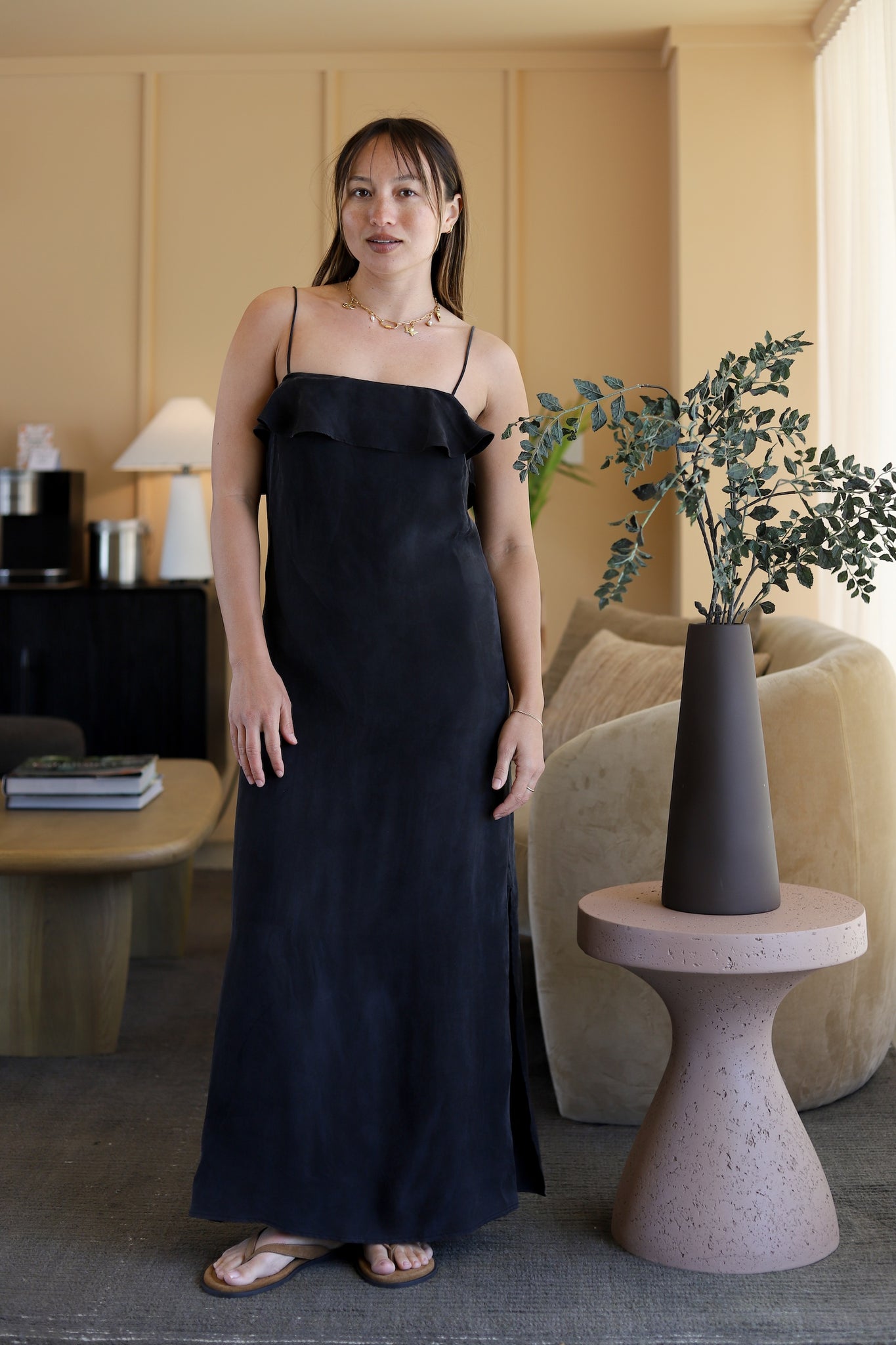 The Zaire Dress is a soft modal maxi with delicate straps and a ruffled front neckline for a feminine touch. A back tie ensures an adjustable fit and the bias cut blends elegance and all-day comfort.