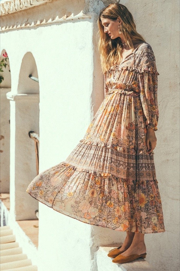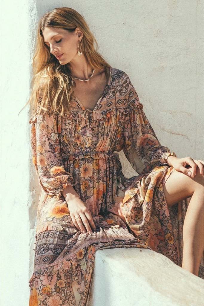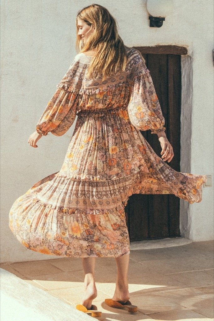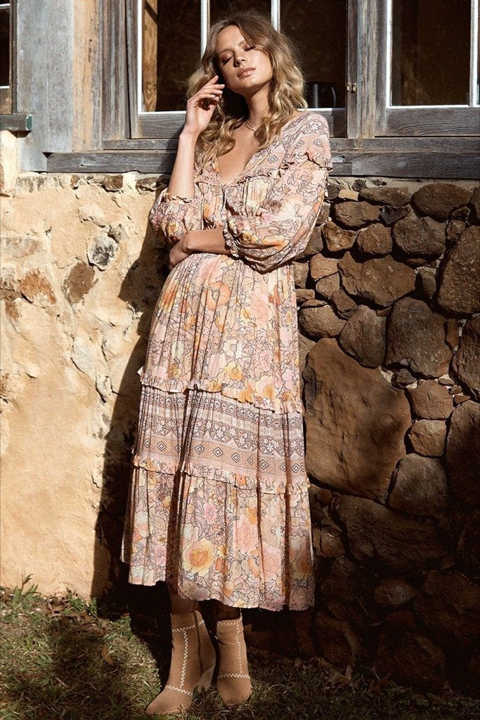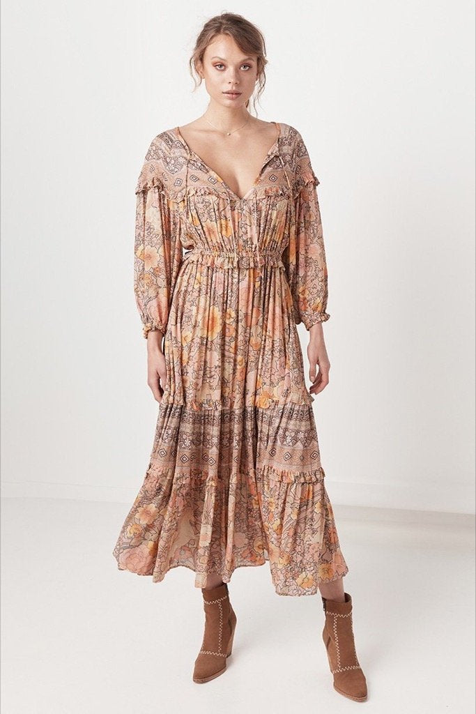 Enchanting Amethyst Gown with with a full elastic waist. Gently billowed sleeves created by an elasticated cuff and three gorgeous cascading tiers, go hand in hand to create a dazzling silhouette, perfectly adorned with an intricate necktie, finished with Rouleau ties and antique brass beads. The warm blushing tones of this gown are heavenly, offering a soft, romantic vibe with a modern muse feel. An instant Spell Classic.