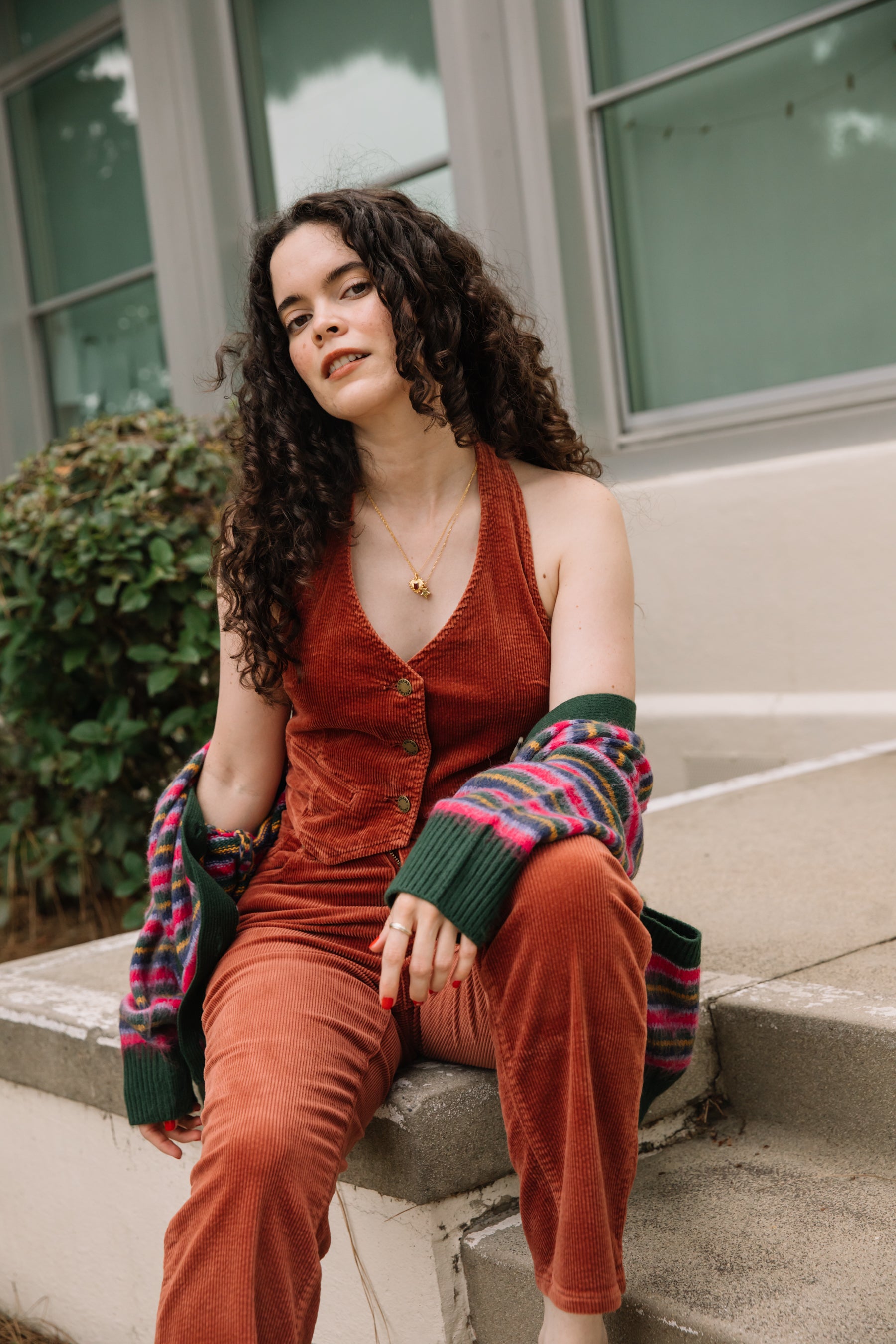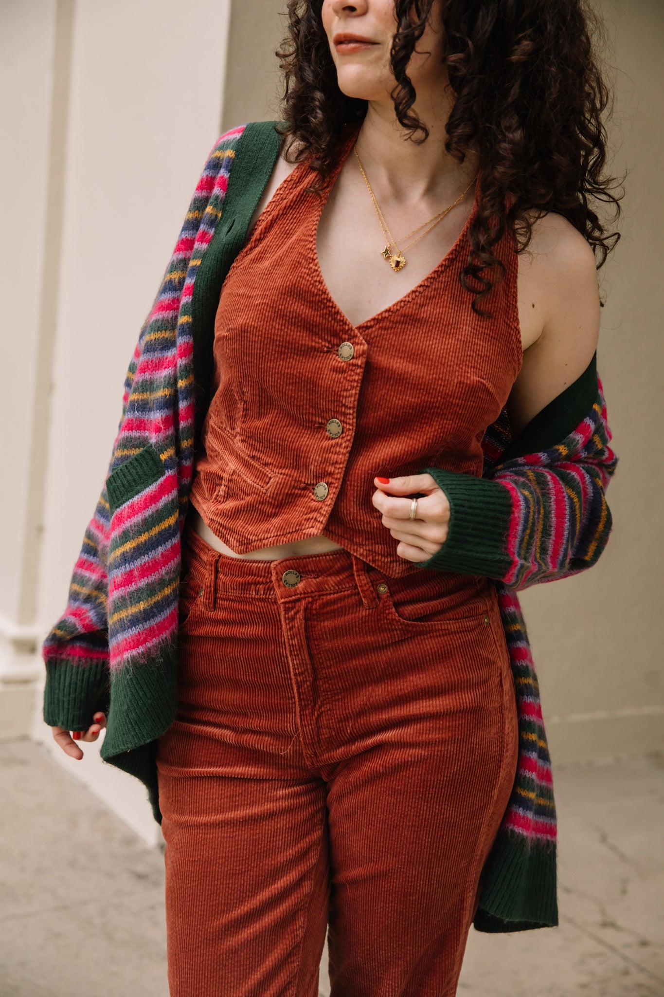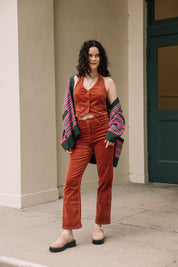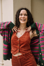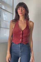 The Halter Vest is a slim fitting waistcoat style top with a button through front opening and adjustable halter neck.