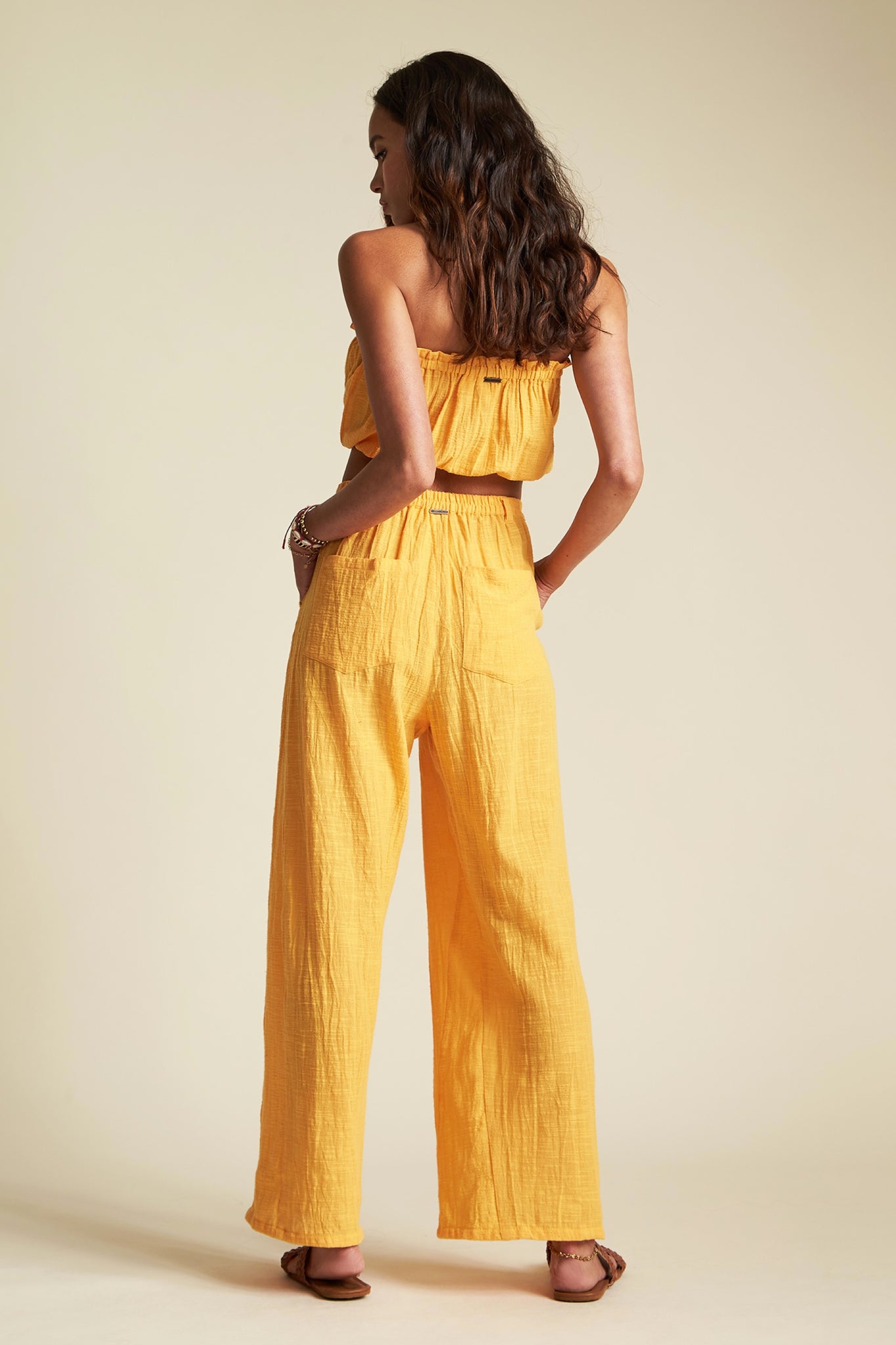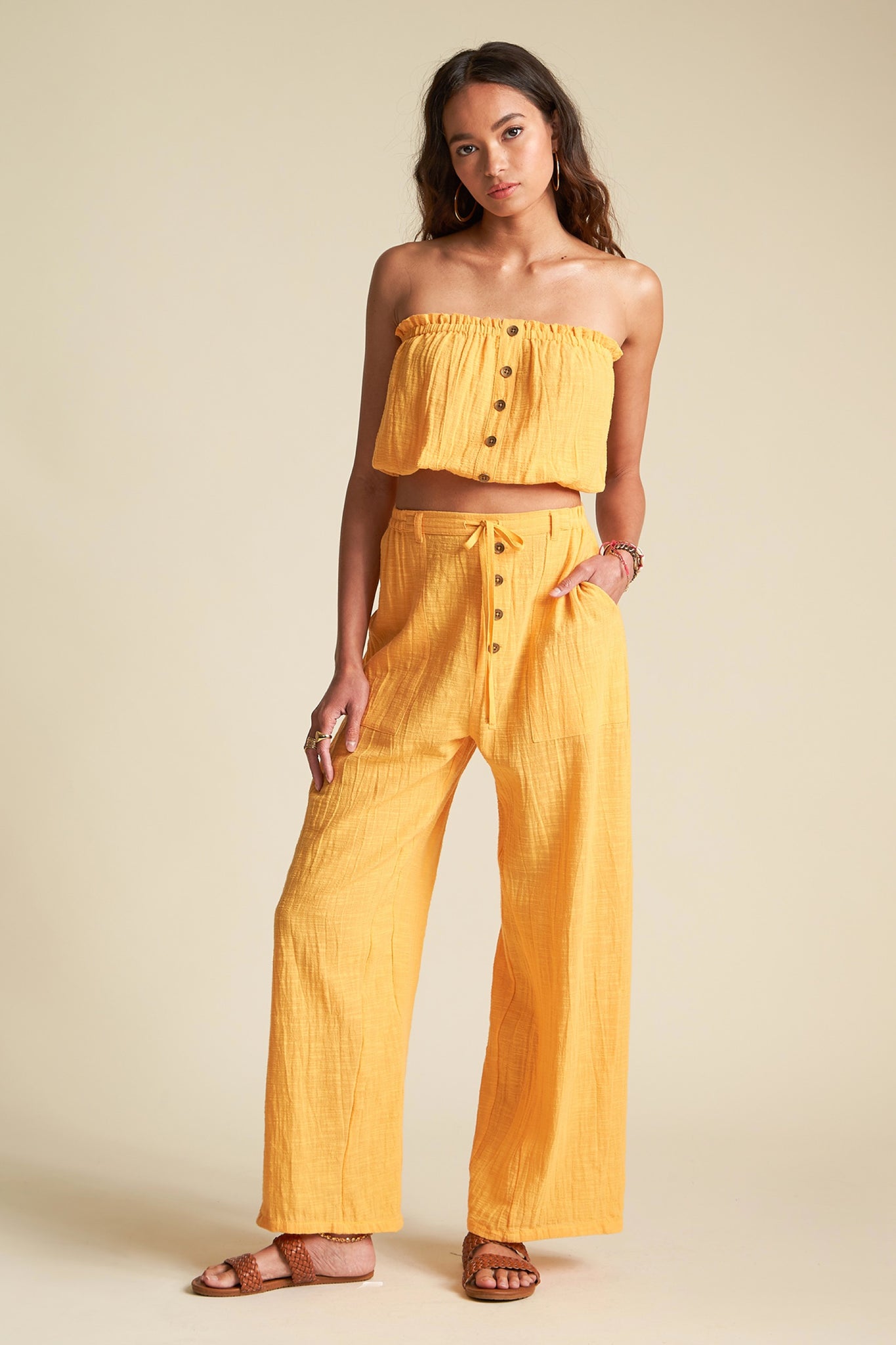 The best mango colored bottoms that will add a little pop of color to your wardrobe. Features a tie waist and buttons with elastic waist. Pairs perfectly with the Spring Rays top.