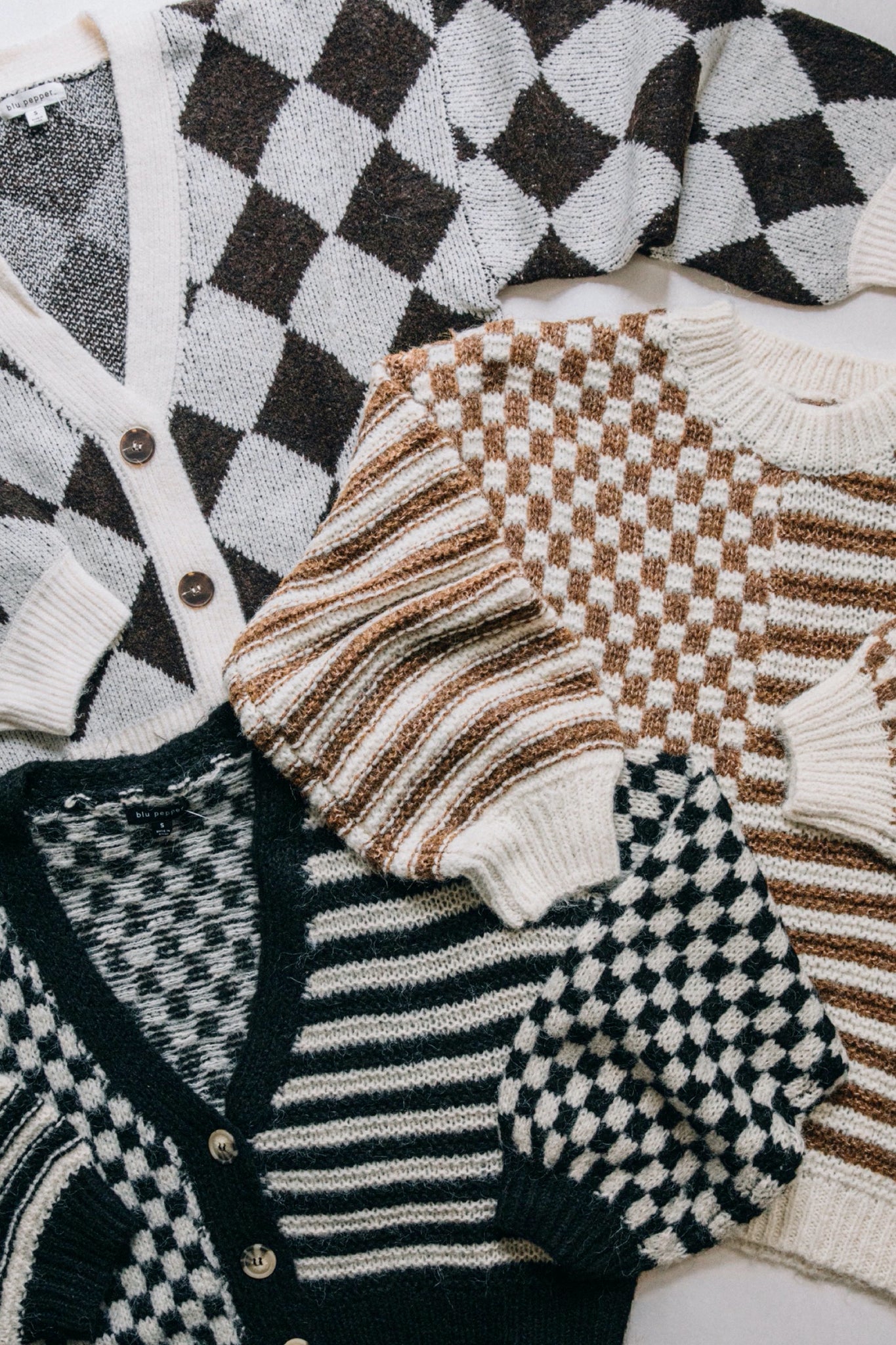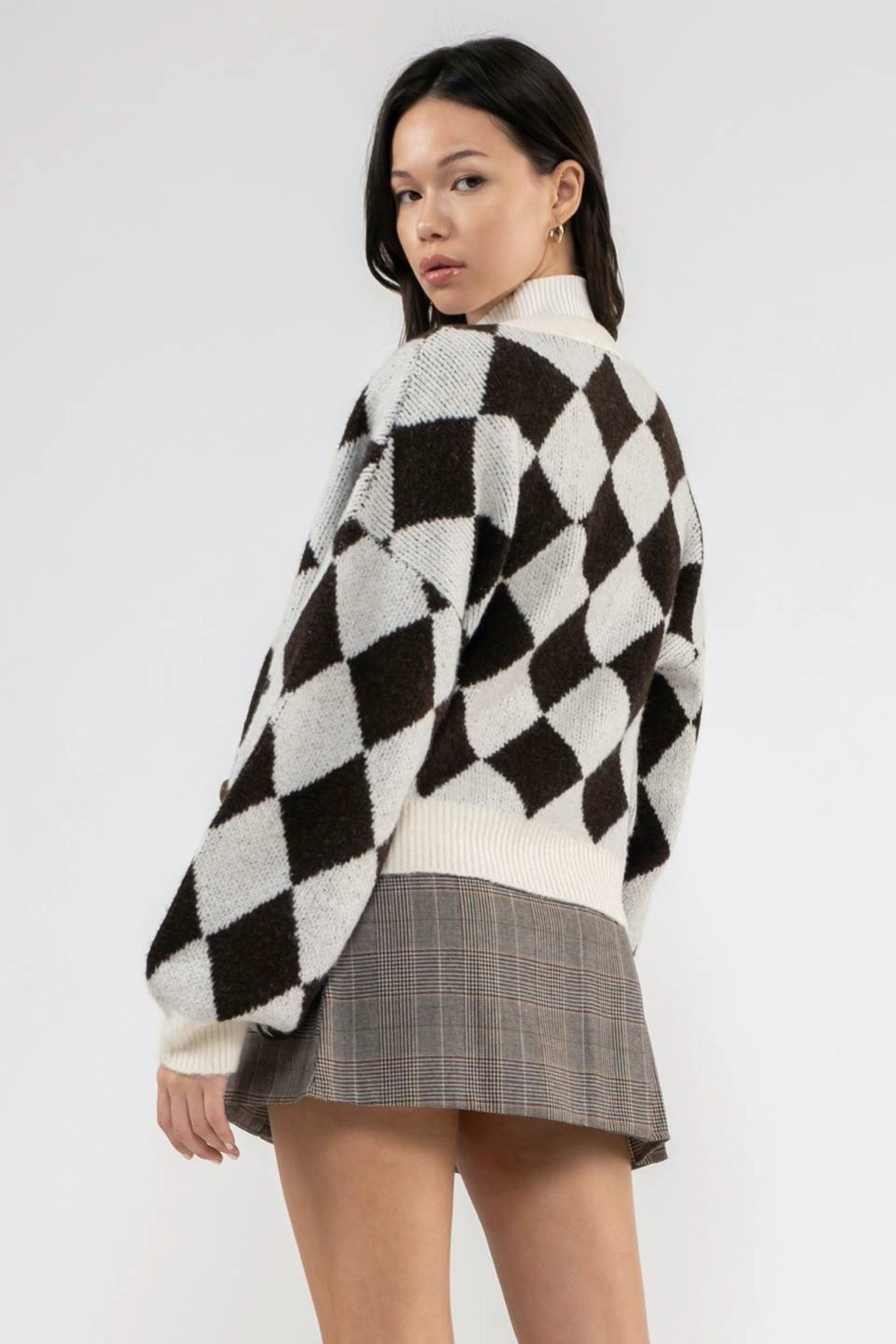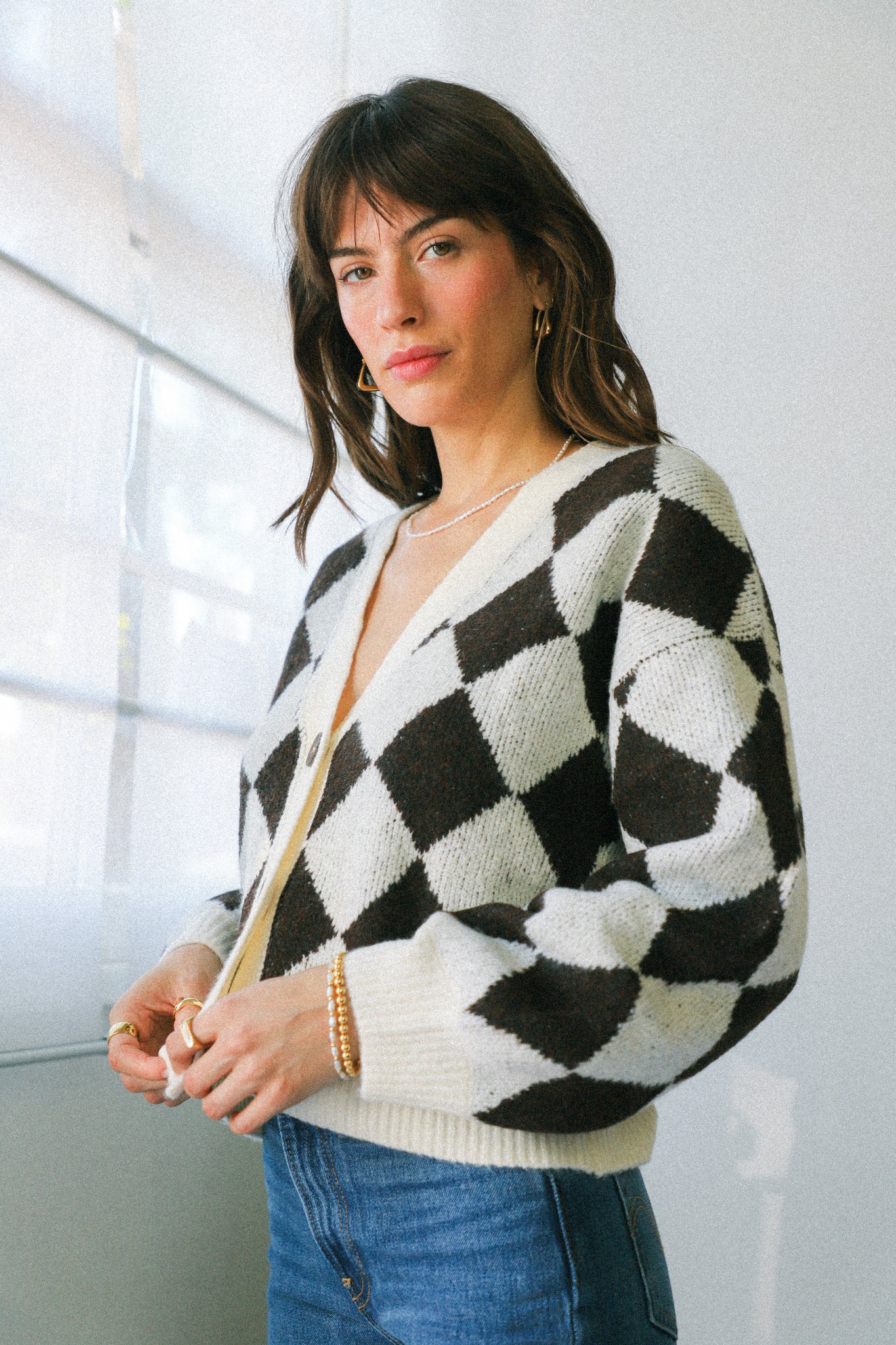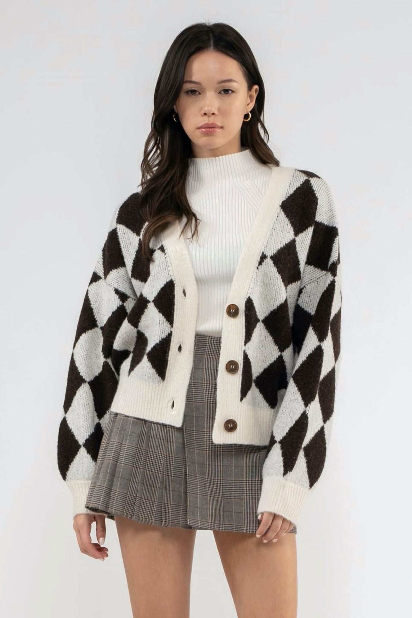 V-neck cardigan featuring an oversized balloon sleeve in a dark brown argyle pattern with tortoise buttons.