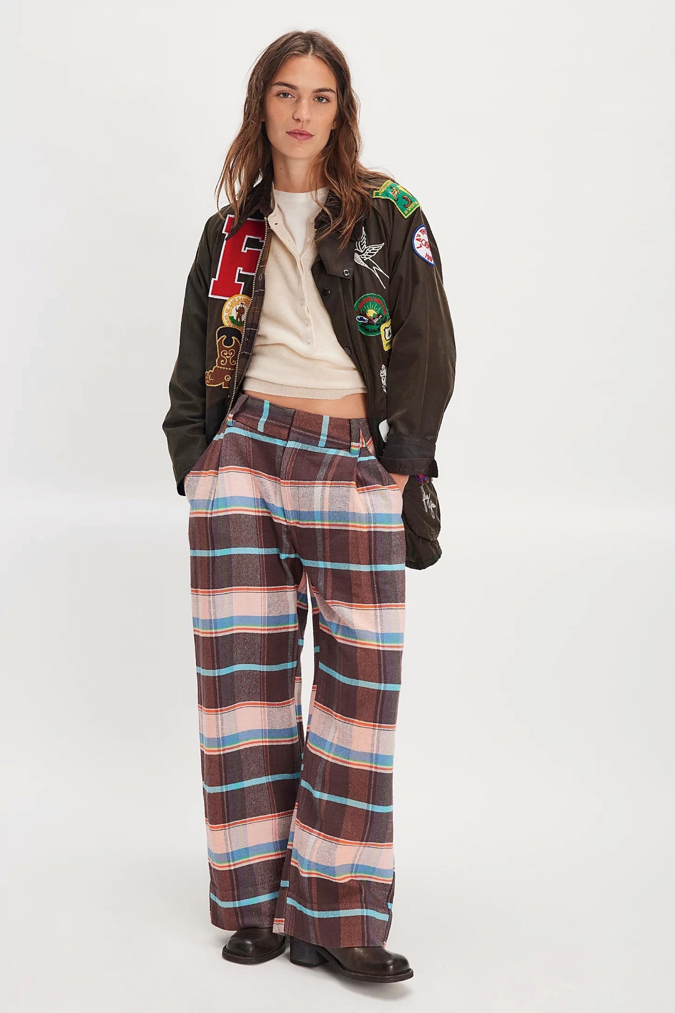 Perfect in plaid, these bold trousers feature a slouchy, wide-leg fit with a herringbone fabrication and adjustable buckle tab at the back.