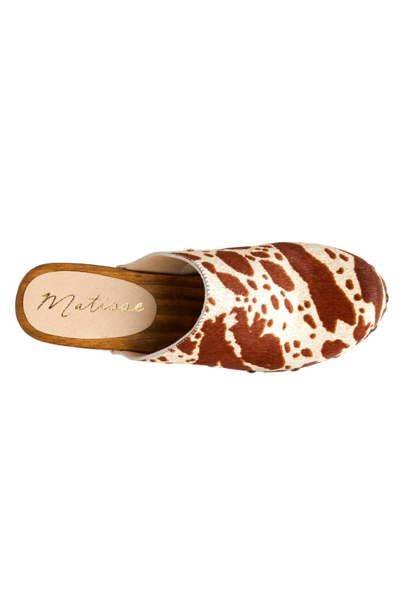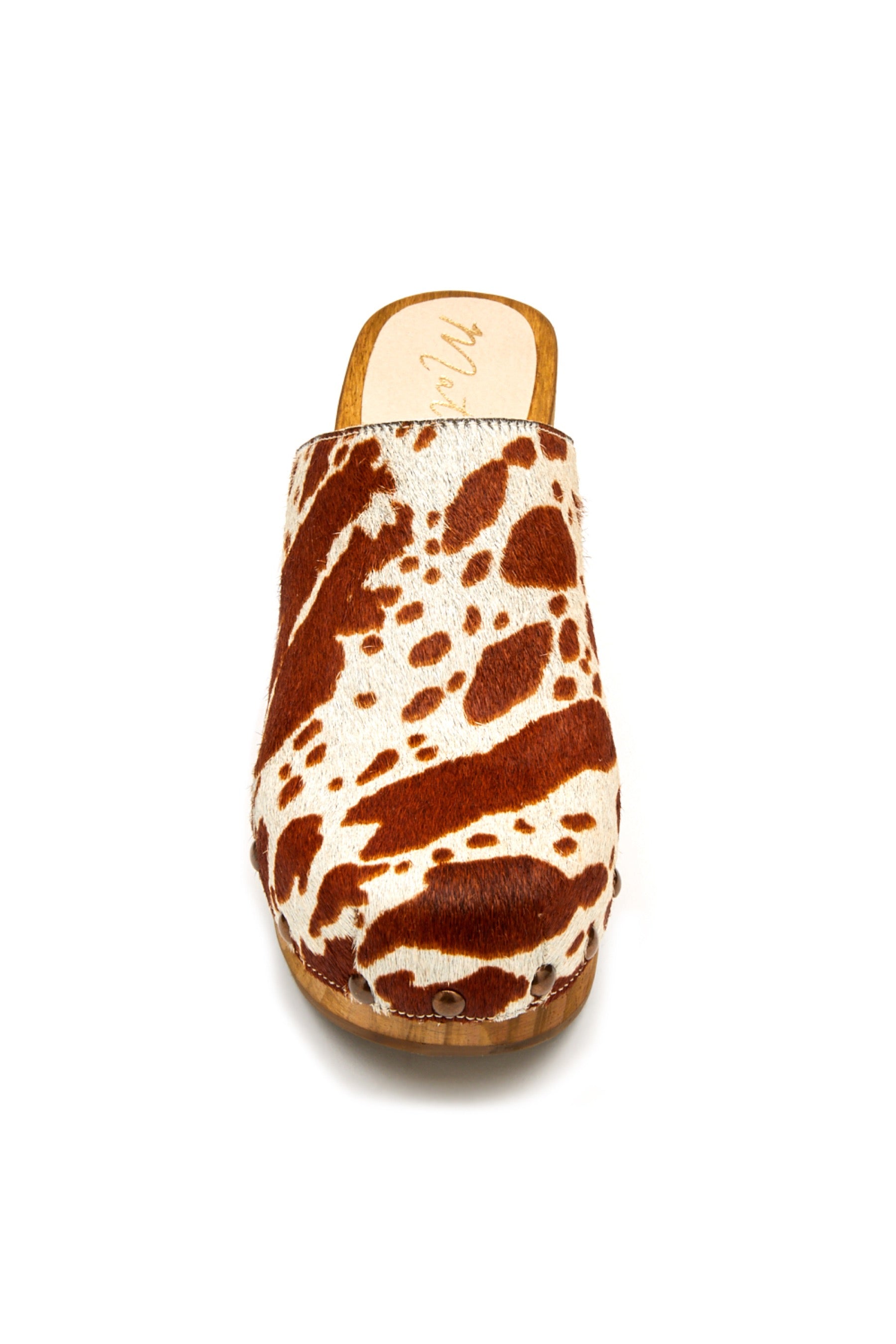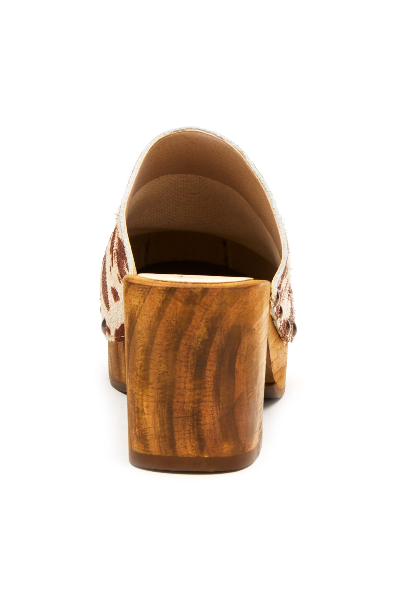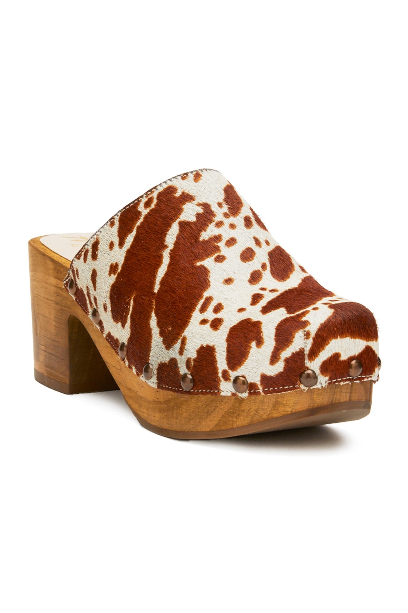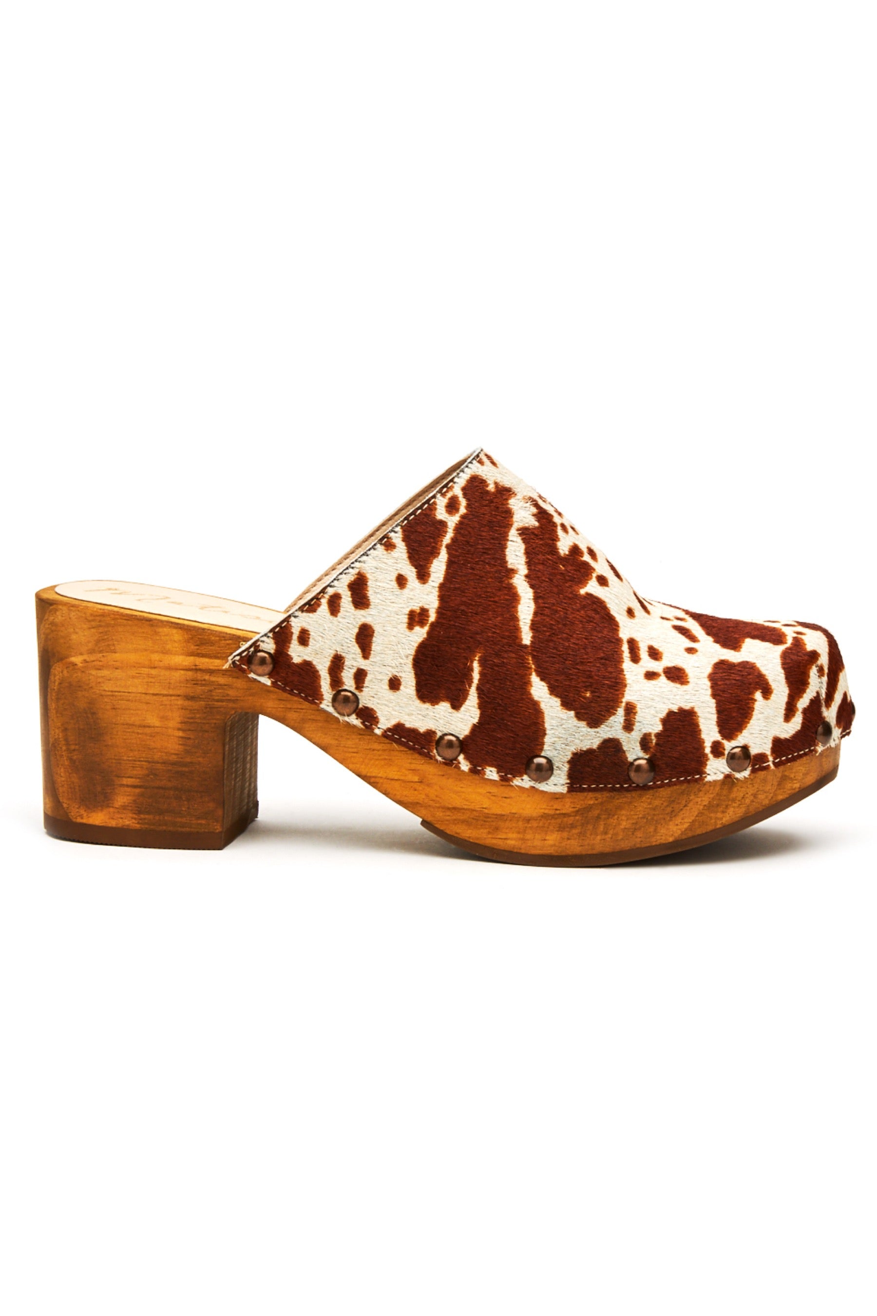 Classic clog featuring a chunky wood heel metal grommet details and updated with a unique cow print.