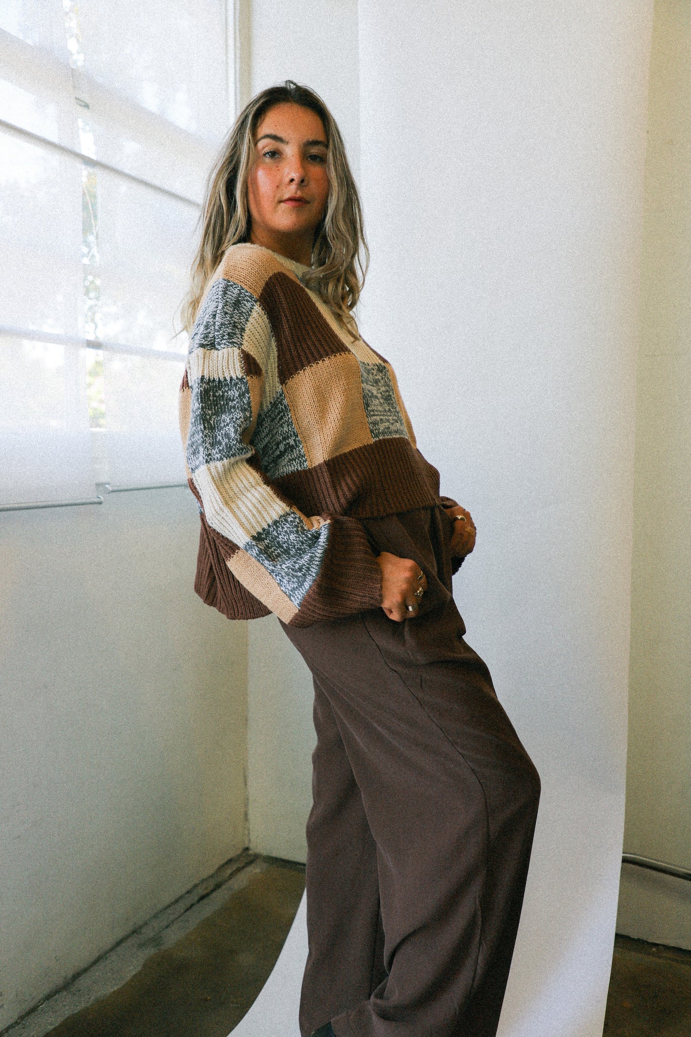 Oversized checker boxy pullover sweater with drop shoulders and bell sleeves.