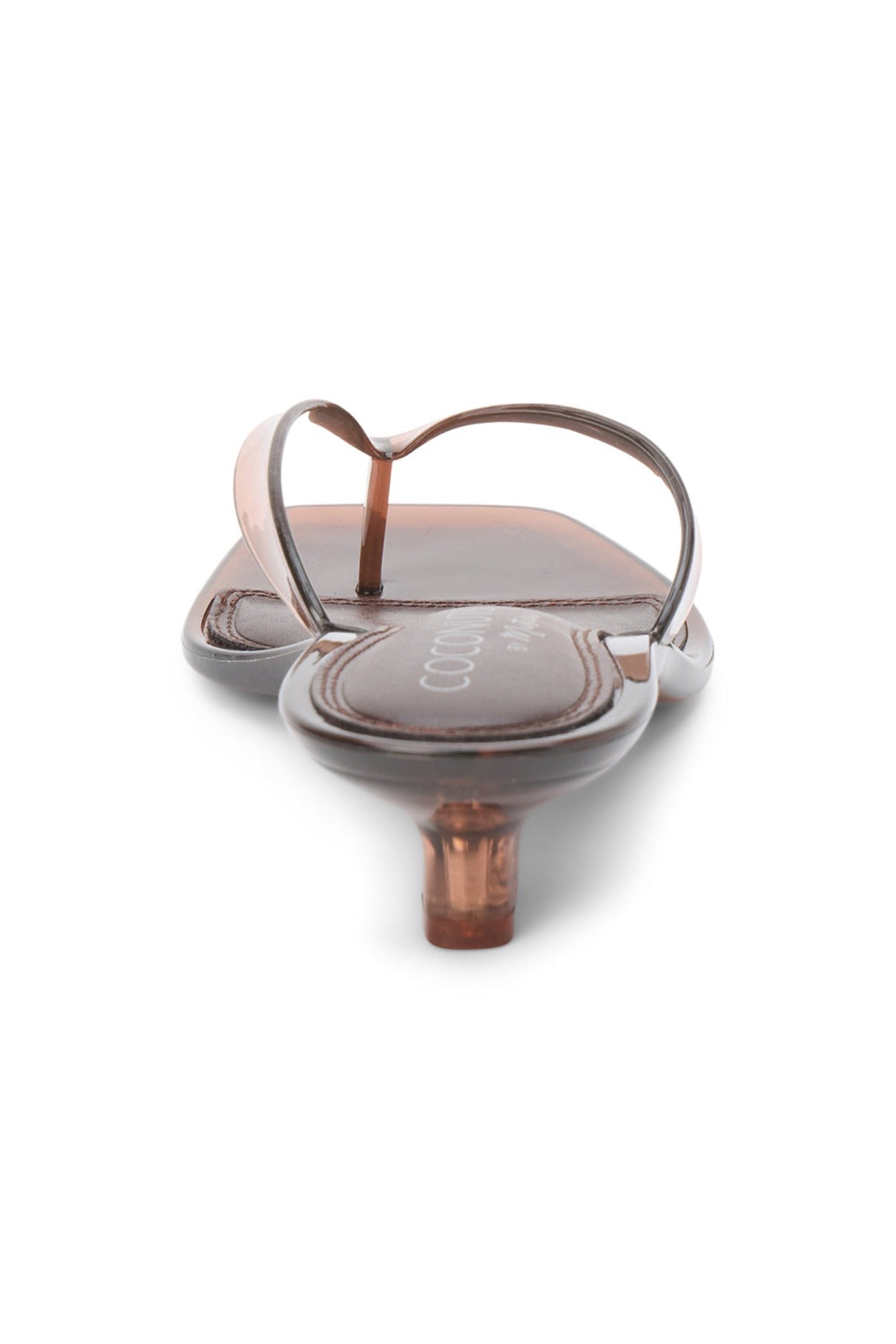 The Margo vegan heeled sandal by Coconuts by Matisse features a translucent brown jelly upper with sleek straps and a low kitten heel for modern, minimalist appeal.