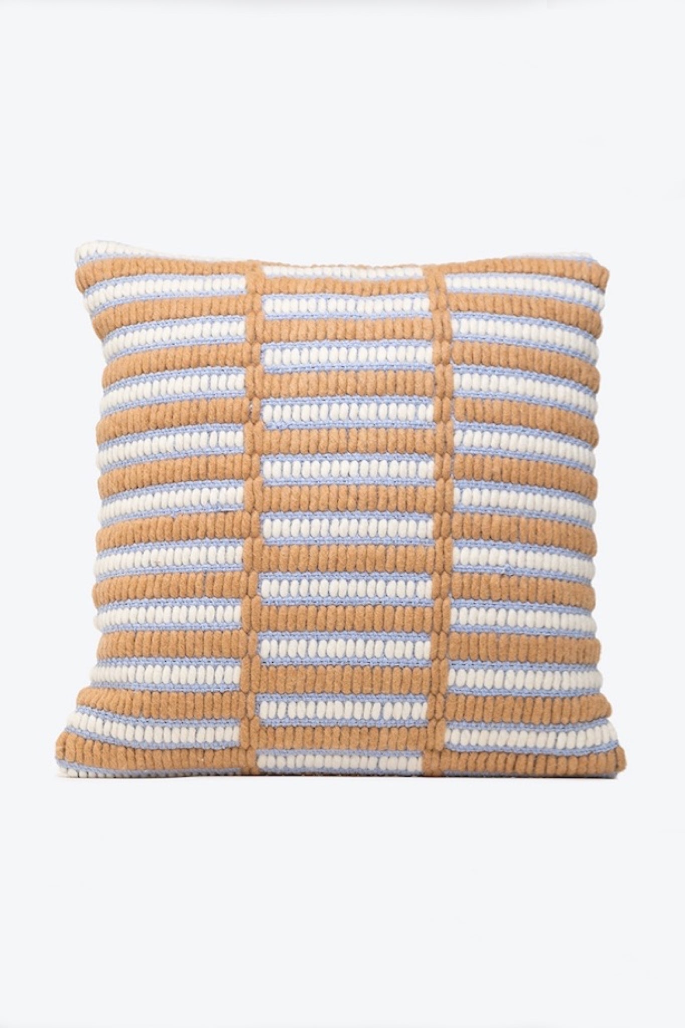 New Zealand wool yarns create a contrasting ladder stripe on this vintage inspired pillow.