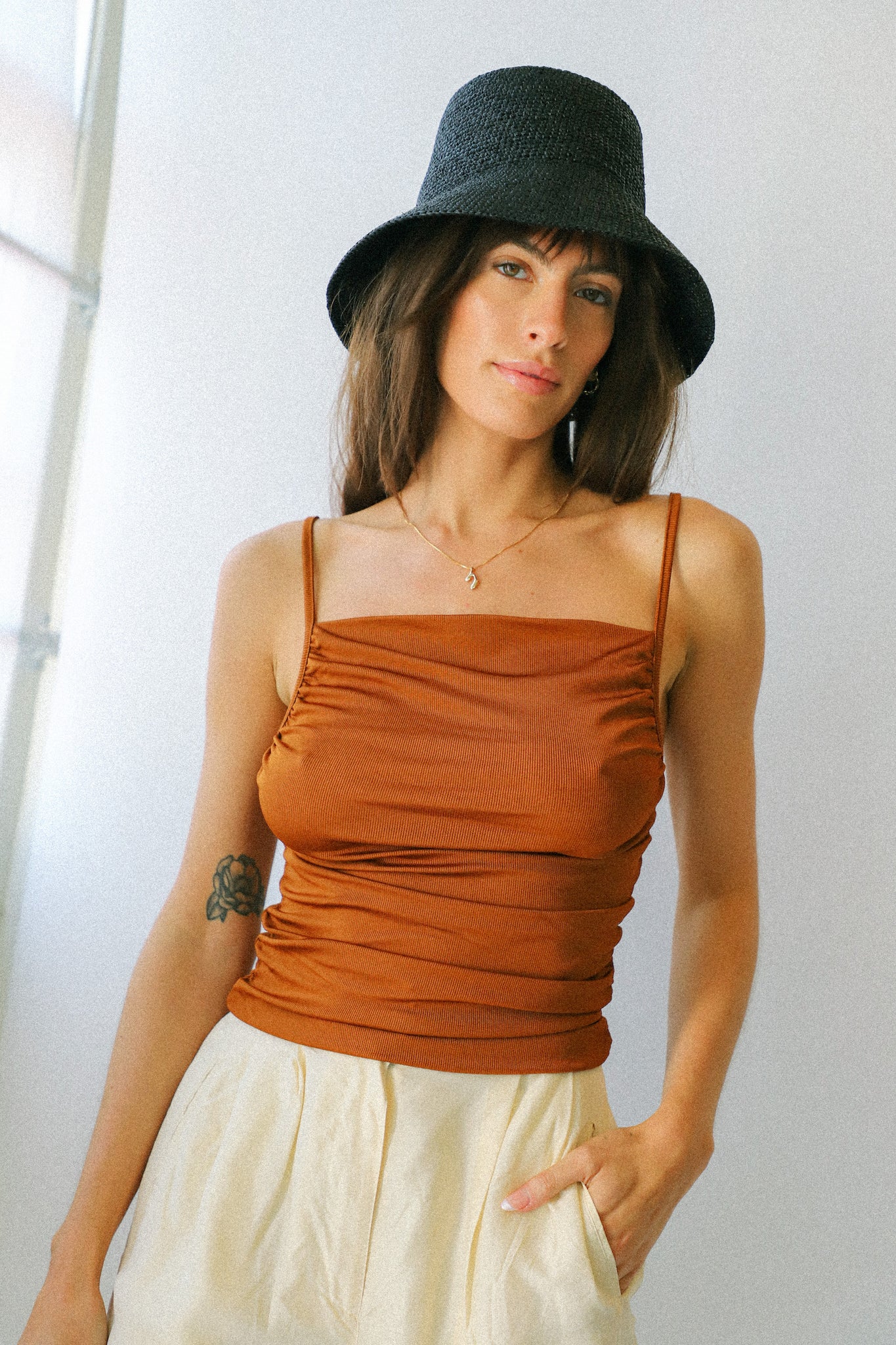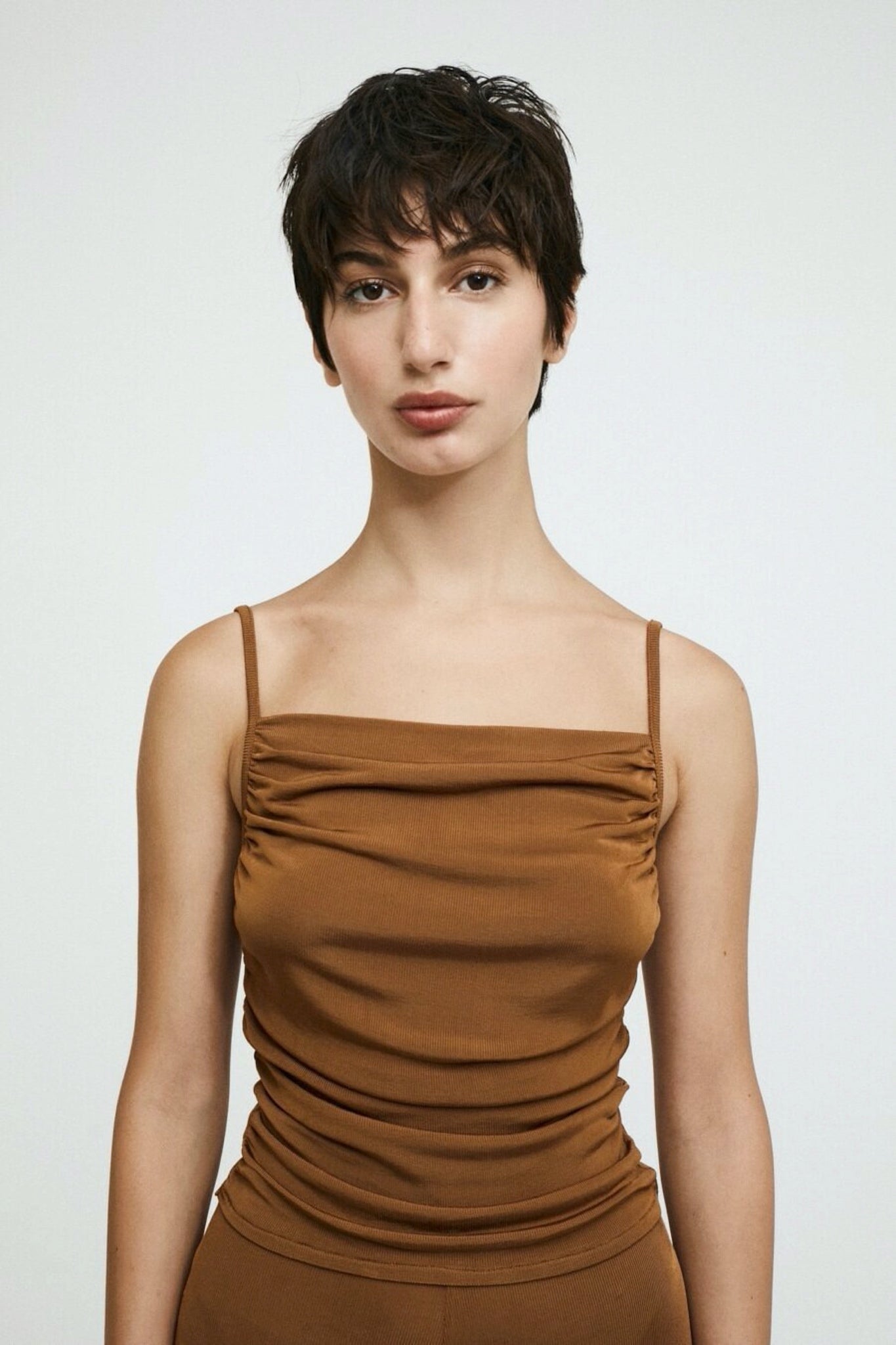 Silky tank top featuring a ruched body and a straight cut neck and back. Ethically made in Portugal.