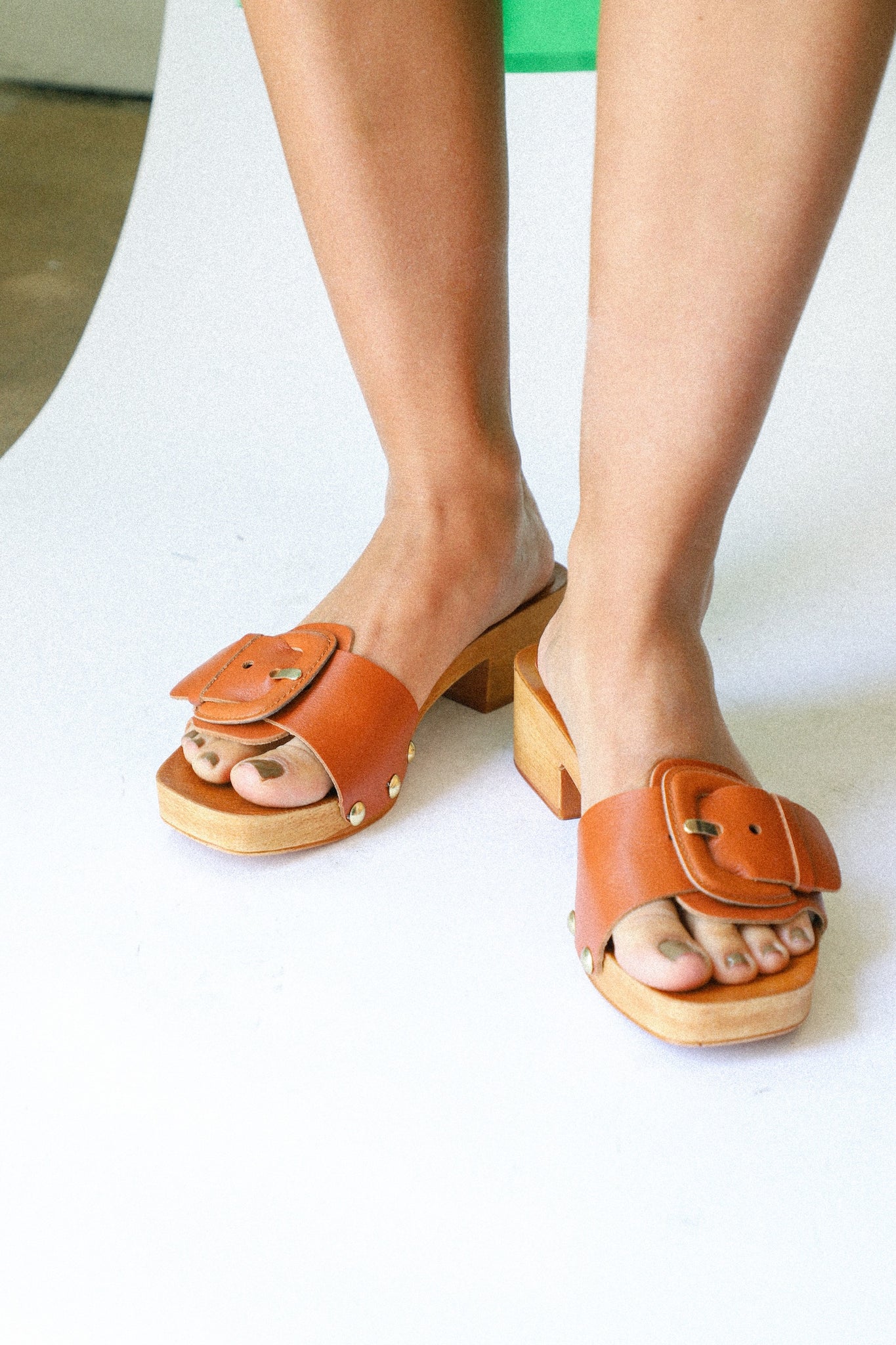 Lightweight and classic, we love this wood finish low rise mule. Classic belt inspired upper with rivet detail and matching heel pad. The man-made flex base adds extra comfort on this made in Spain cutie with leather upper. Heel 1.75 inches