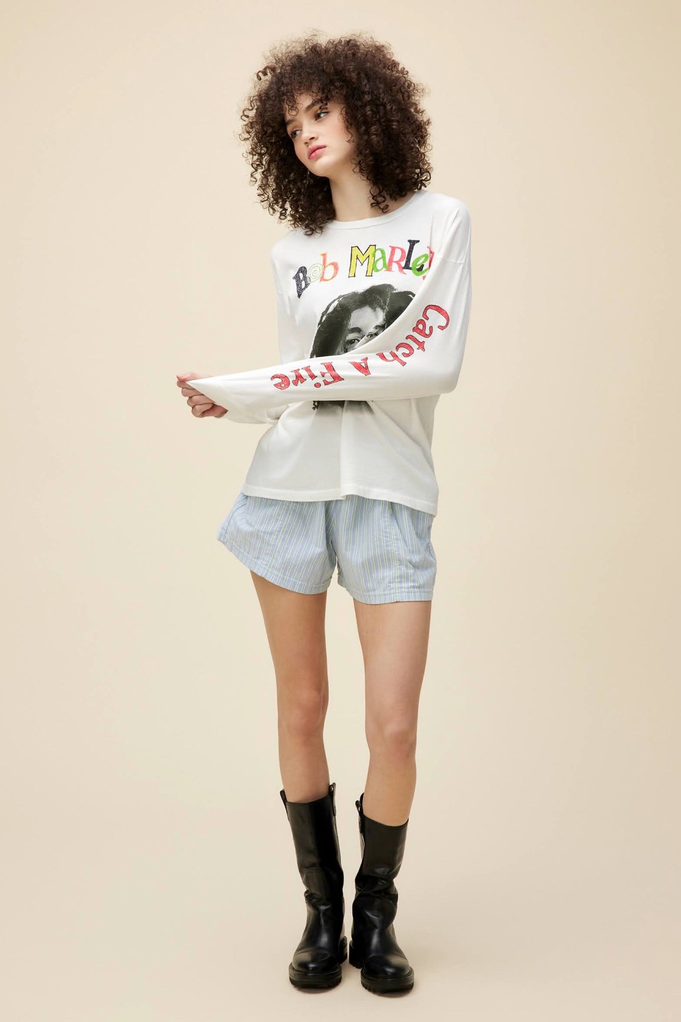 Bob Marley on a Relaxed Long Sleeve, fitting. Inspiring generations through music that transcends borders, cultures and languages, a portrait of the reggae icon hits center chest with his name and album “Catch a Fire” designed with a colored-in effect. Offering with a roomy fit throughout the sleeves and body.