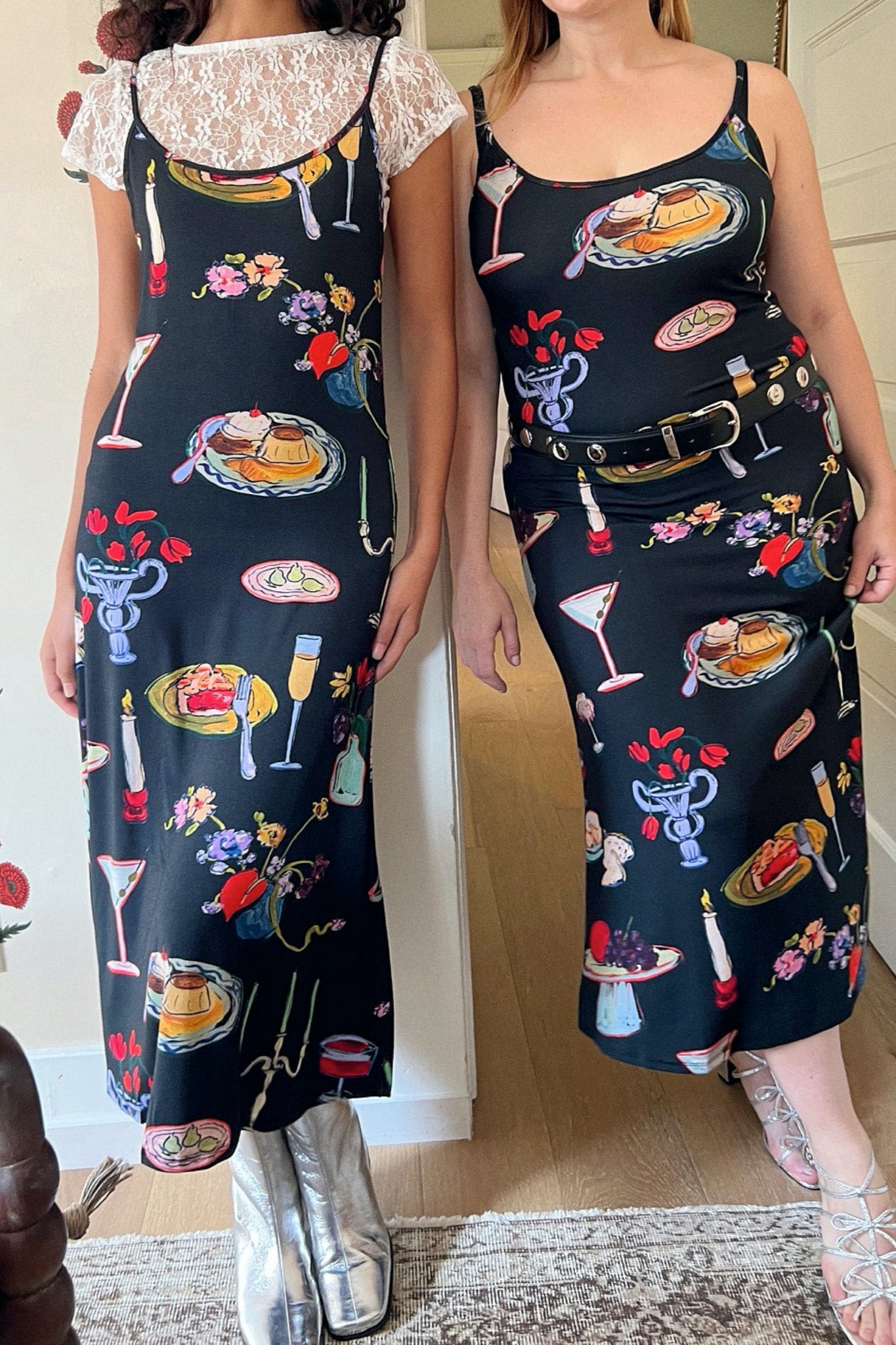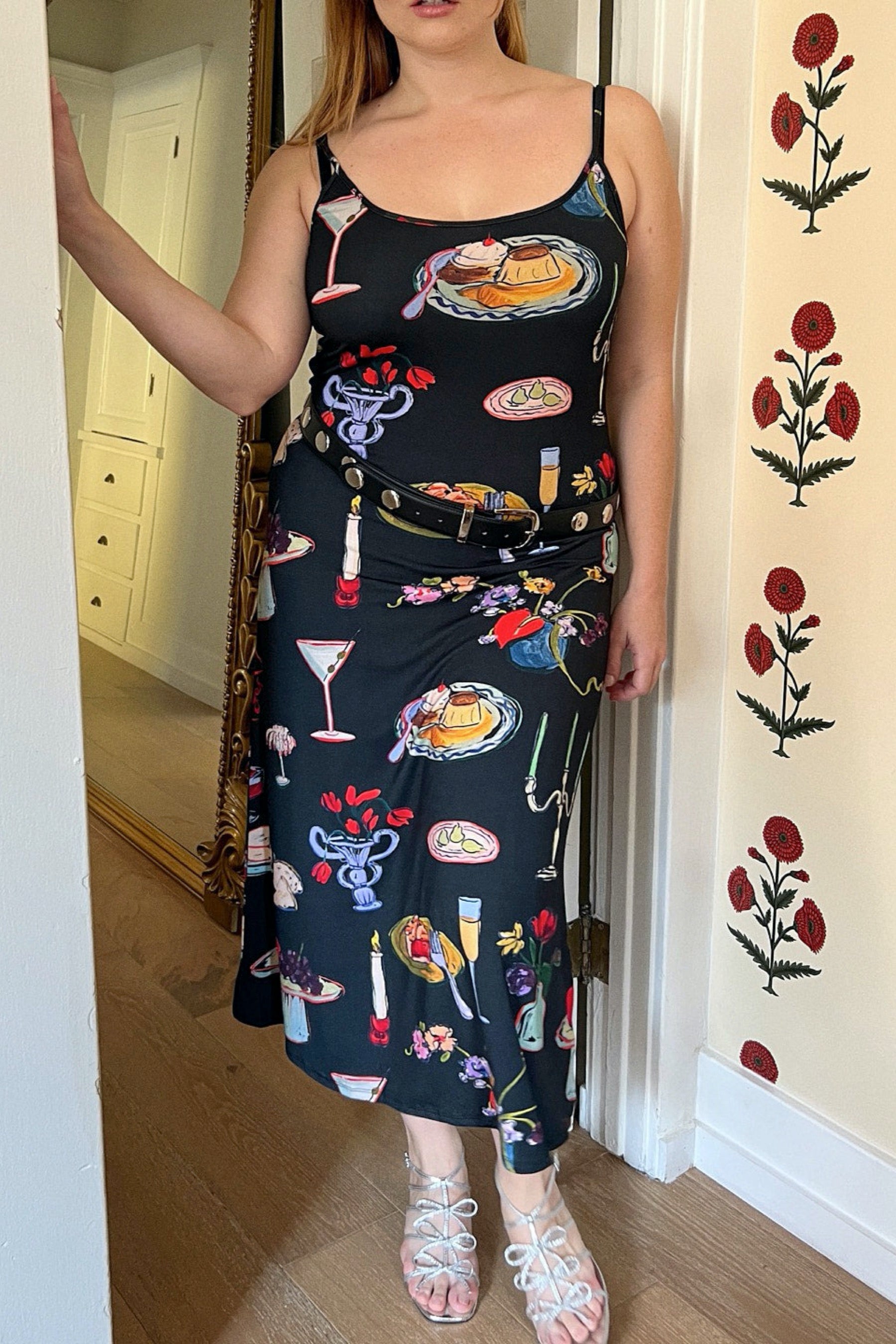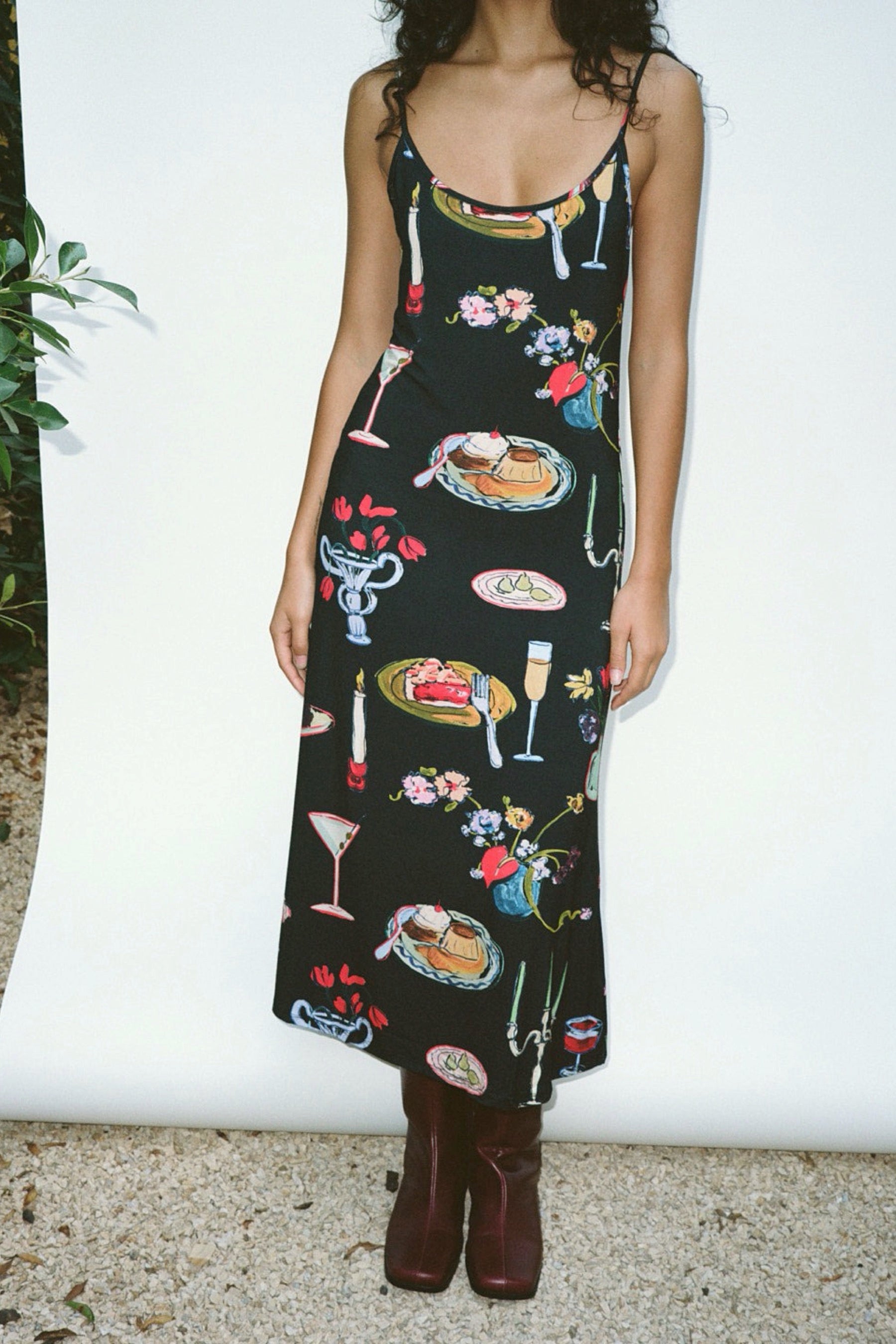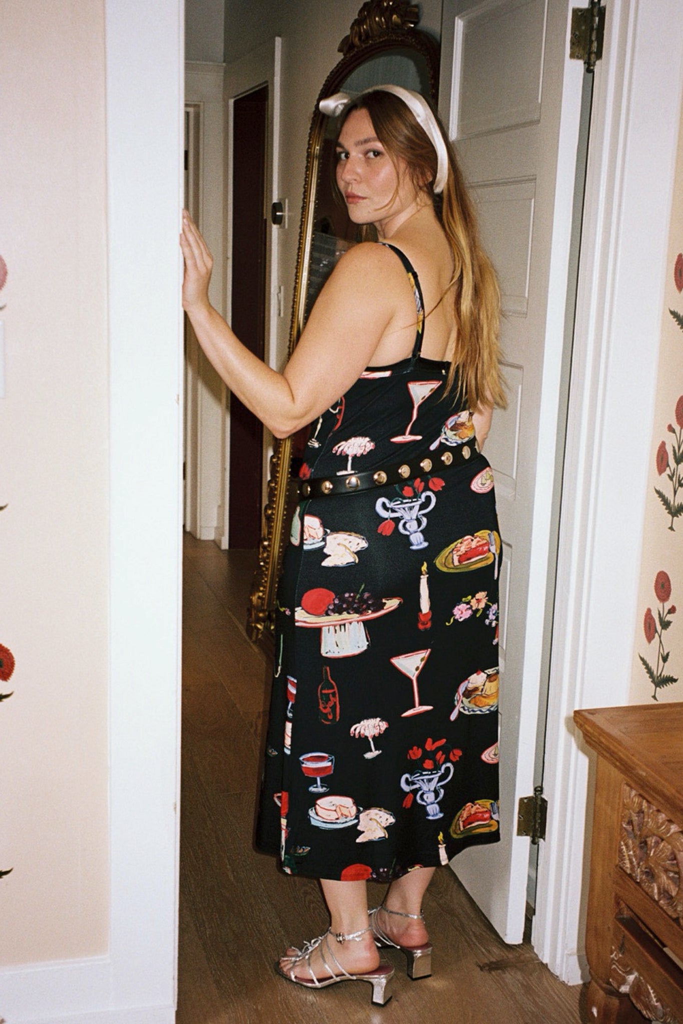 Time for dinner! Slip into the Sofia Slip Dress for a meal to remember. This midi-length dress with a flowy hem and linen blend fabric will have you feeling breezy – plus, the Set the Table Collection print keeps it fun and flavorful!
