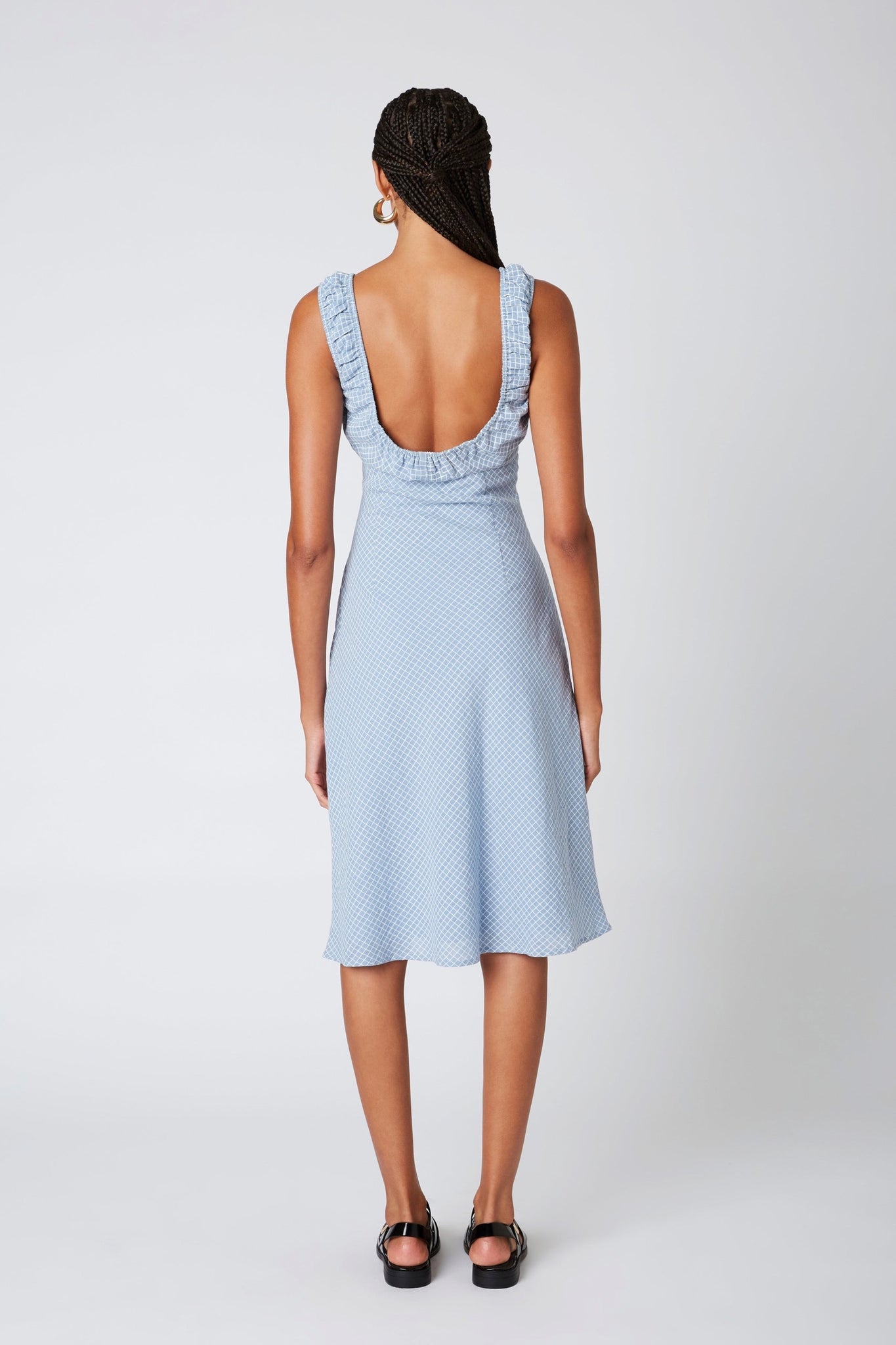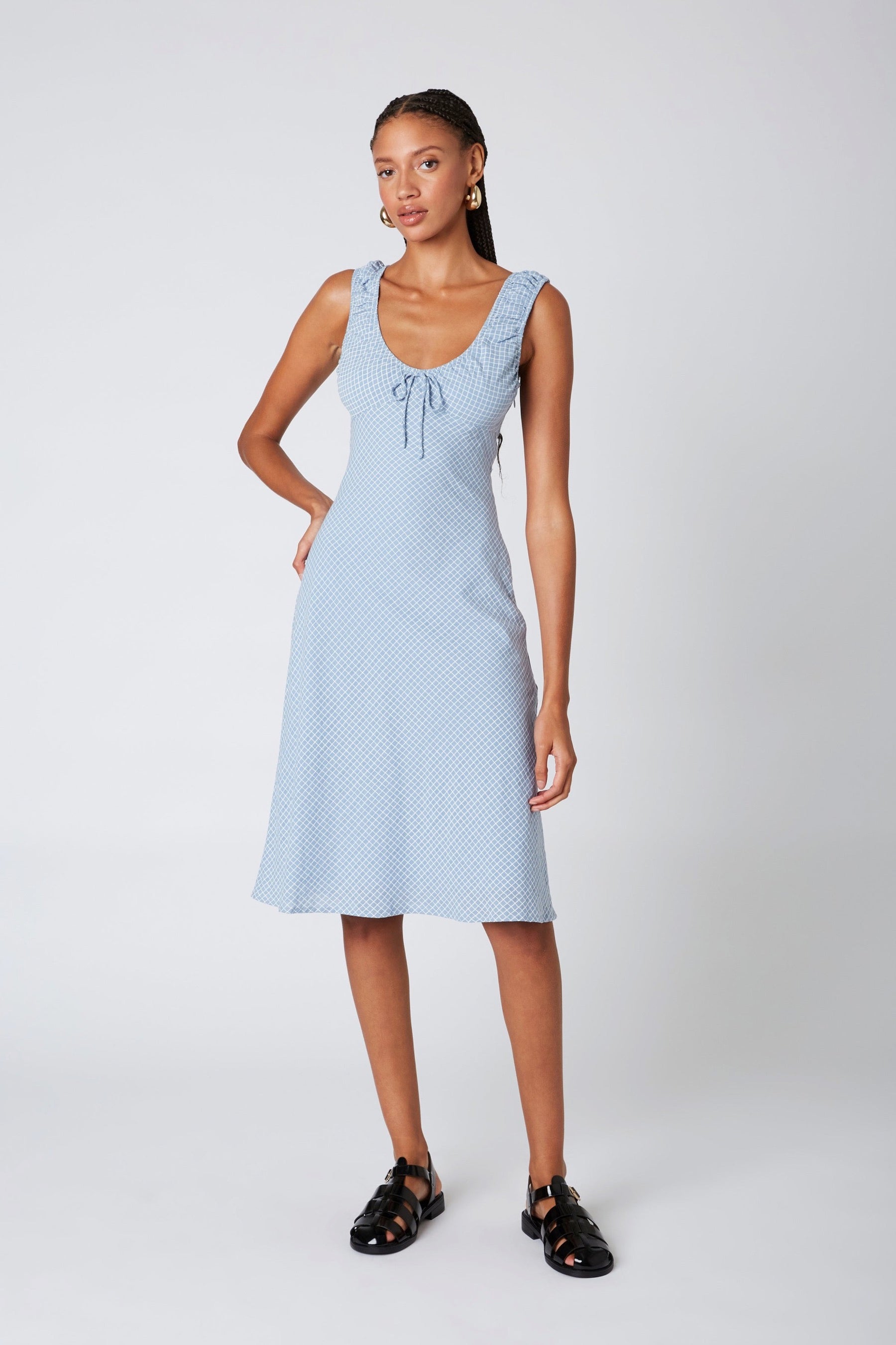 Knee-length bias dress featuring a windowpane print and bow-tie detail at front. Fully lined.