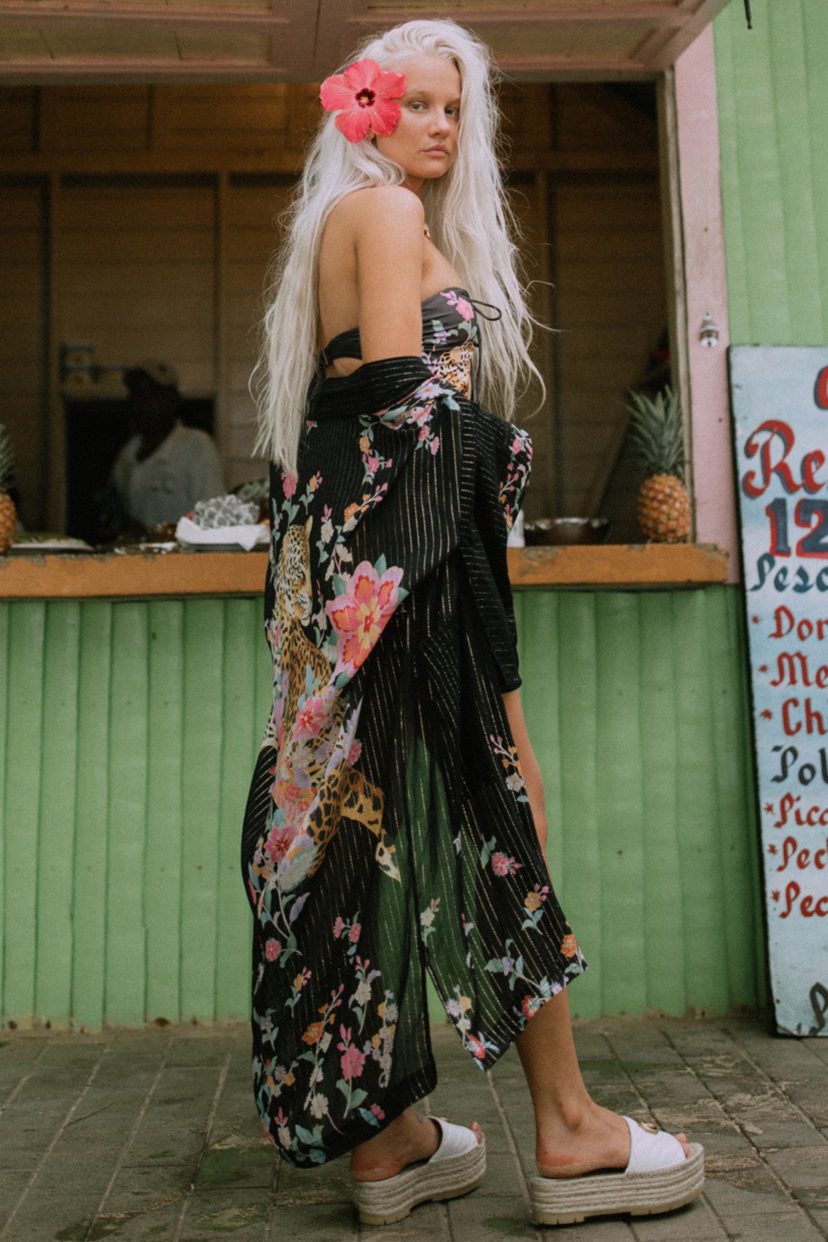 Nostalgic and bold with a breezy feminine charm, this robe is an instant Spell classic. Featuring classic kimono-inspired sleeves, patch pockets and a detachable tie belt.
