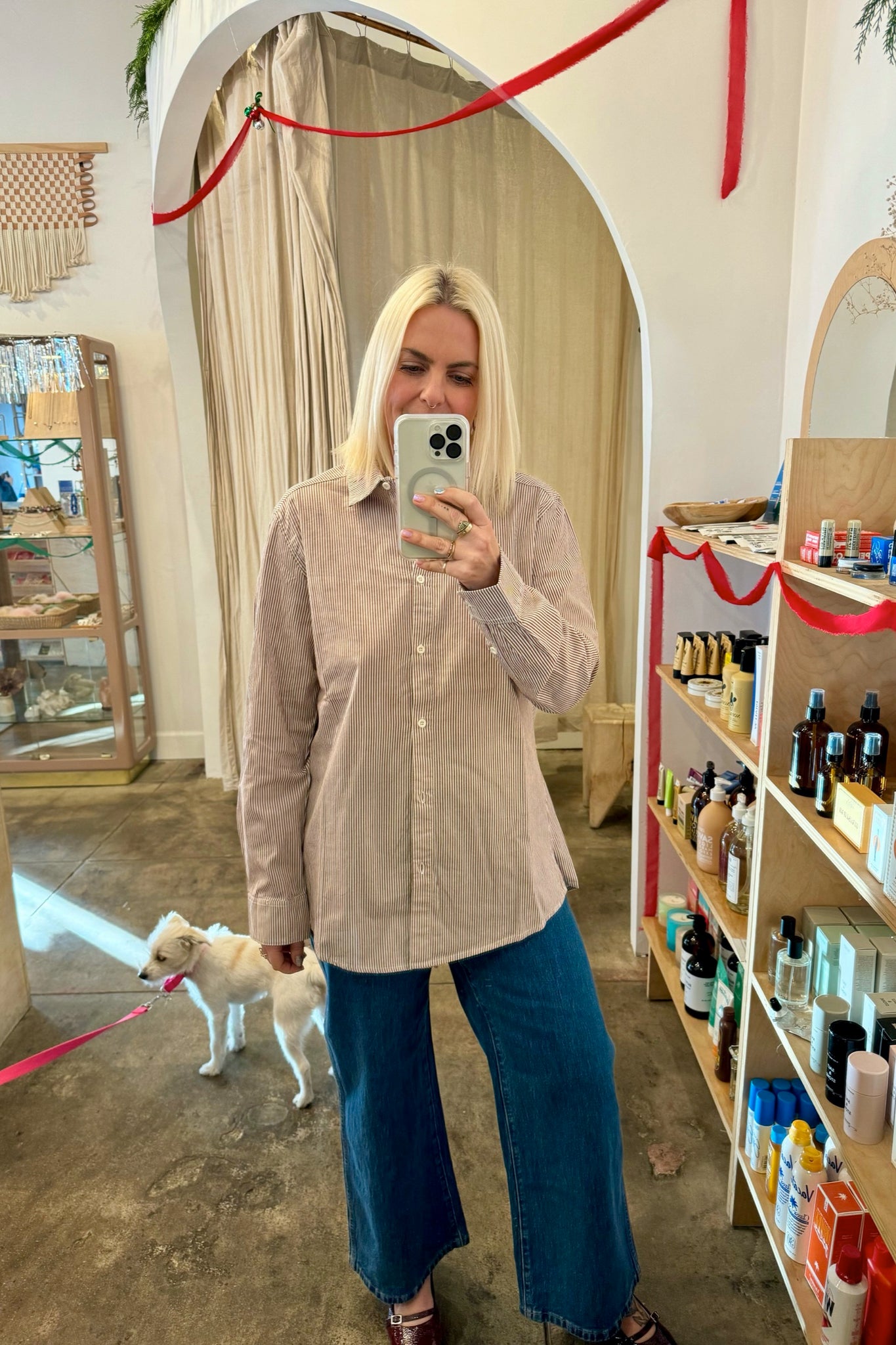 A relaxed button shirt made popular through it's versatile placement on vacationers throughout Europe. With a vertical stripe pattern, this shirts feature side split details and an oversized, relaxed look.