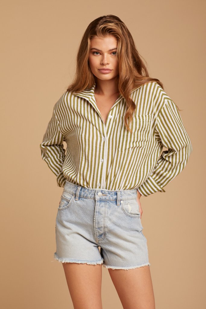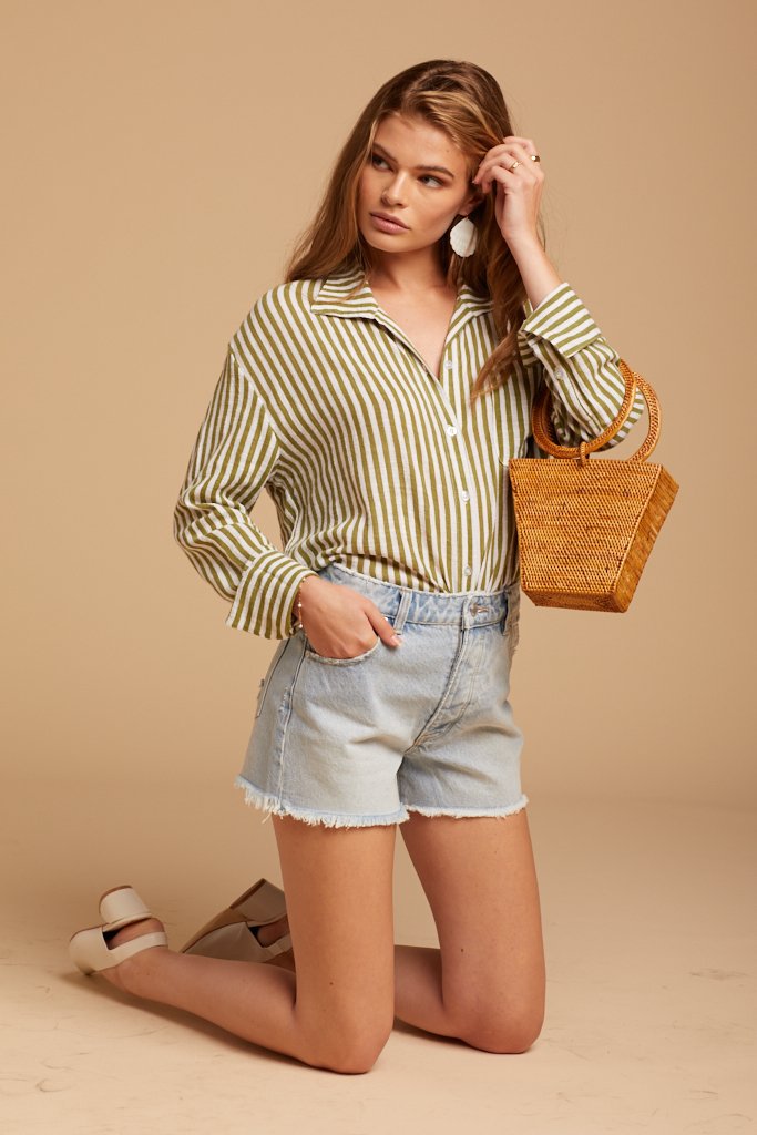 High rise denim shorts with a slim fit at mid thigh length. Inspired by vintage cut-offs, the original is in non stretch denim and will soften and shape to the body with wear.