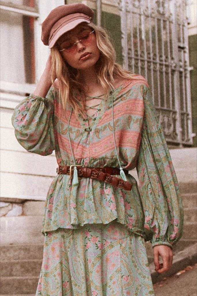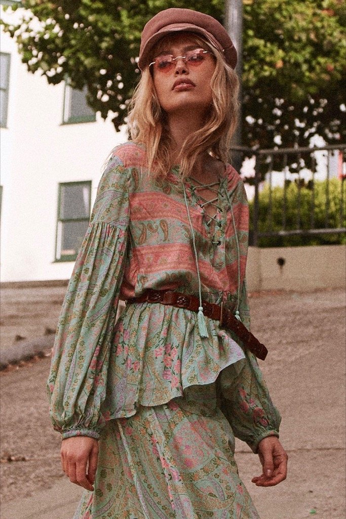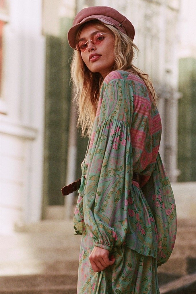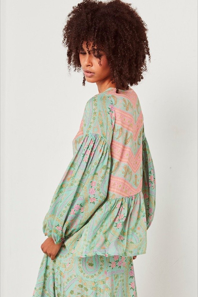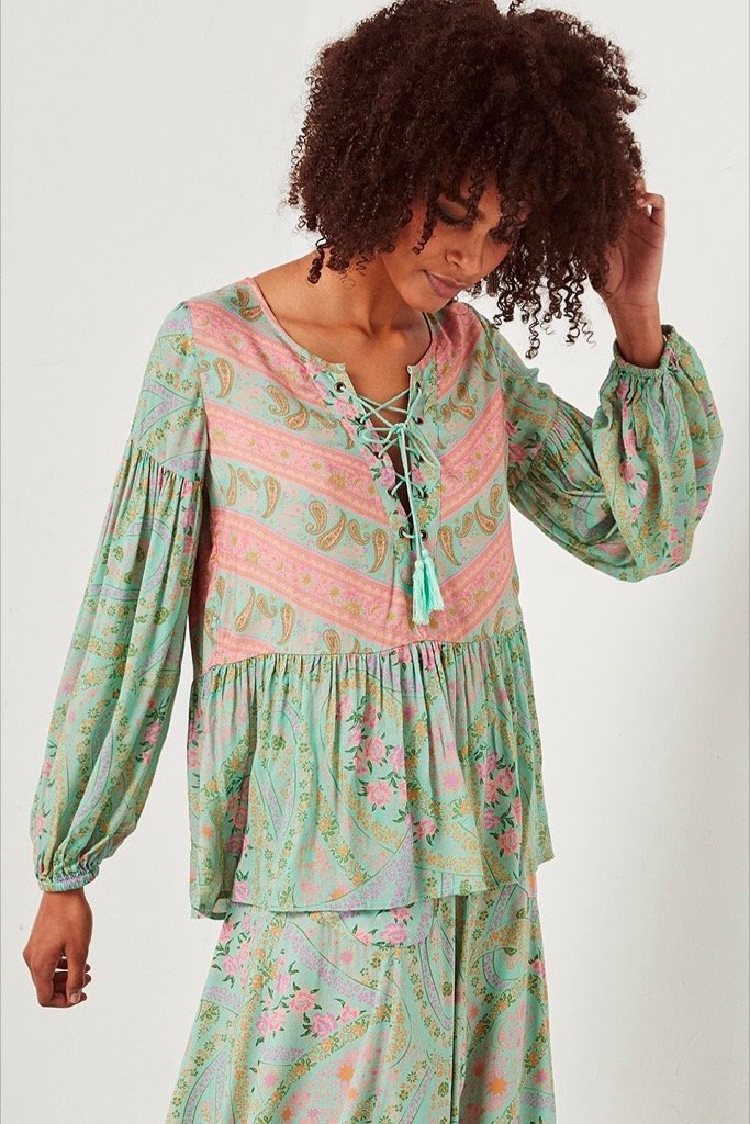 Seventies nostalgia chic defines the City Lights Blouse in softest tones of buttery sage and pastel candy blush, think beautiful accents of paisley intertwined with hints of starry nights and cosmic vibes. In a cut that flatters and a vibrant sage print that will turn heads, the City Lights Blouse encompasses all the trends of 2018 - think plunged necklines, eyelet lace up detailing and sultry colourways. This seamless piece features elastic cuffed billowing sleeves in a luxuriously soft fine rayon.