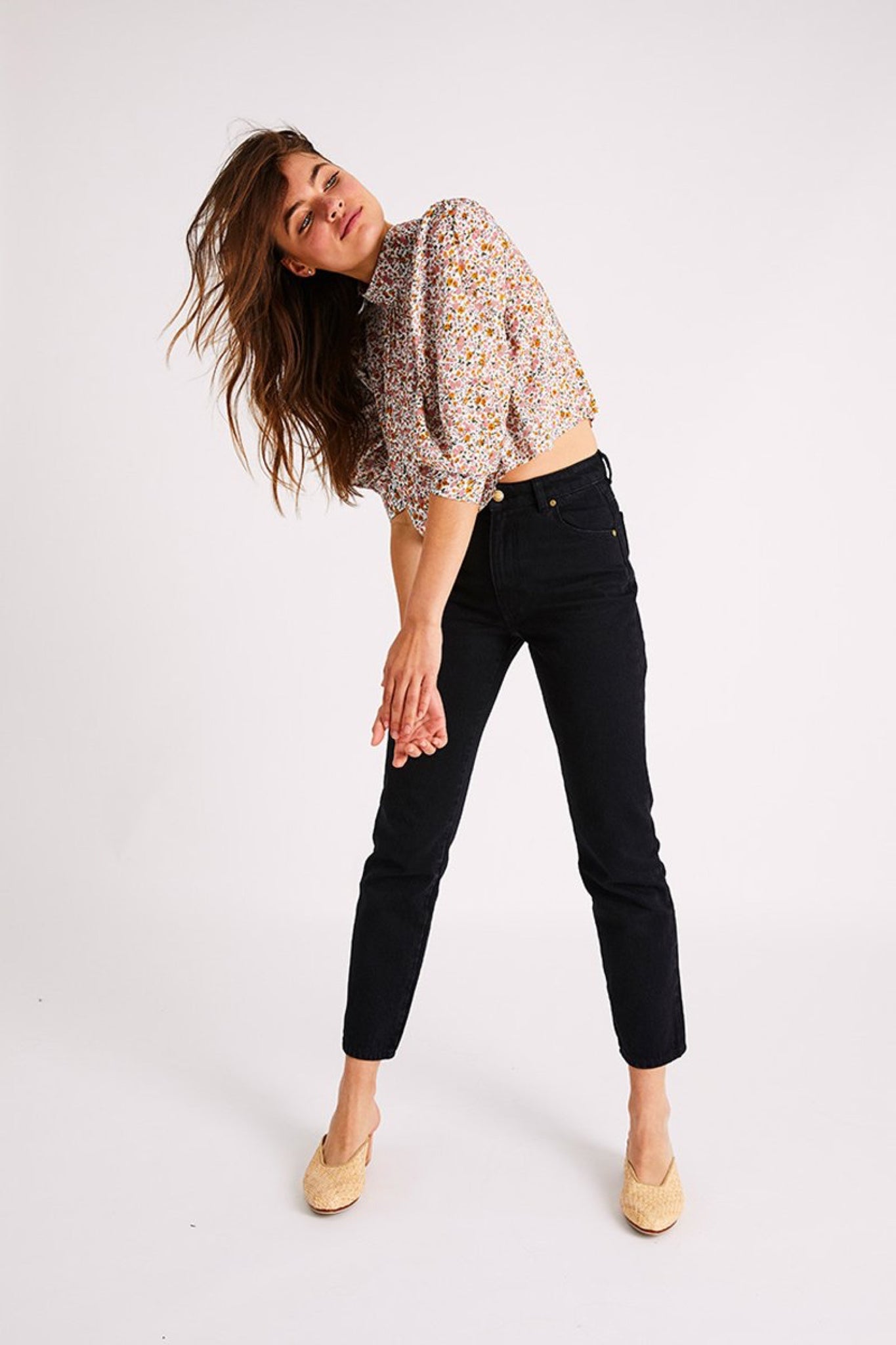 Cut from a soft touch fabrication featuring a high collar neckline and a stunning button back detail perfect to pair with you favorite high-rise denim.