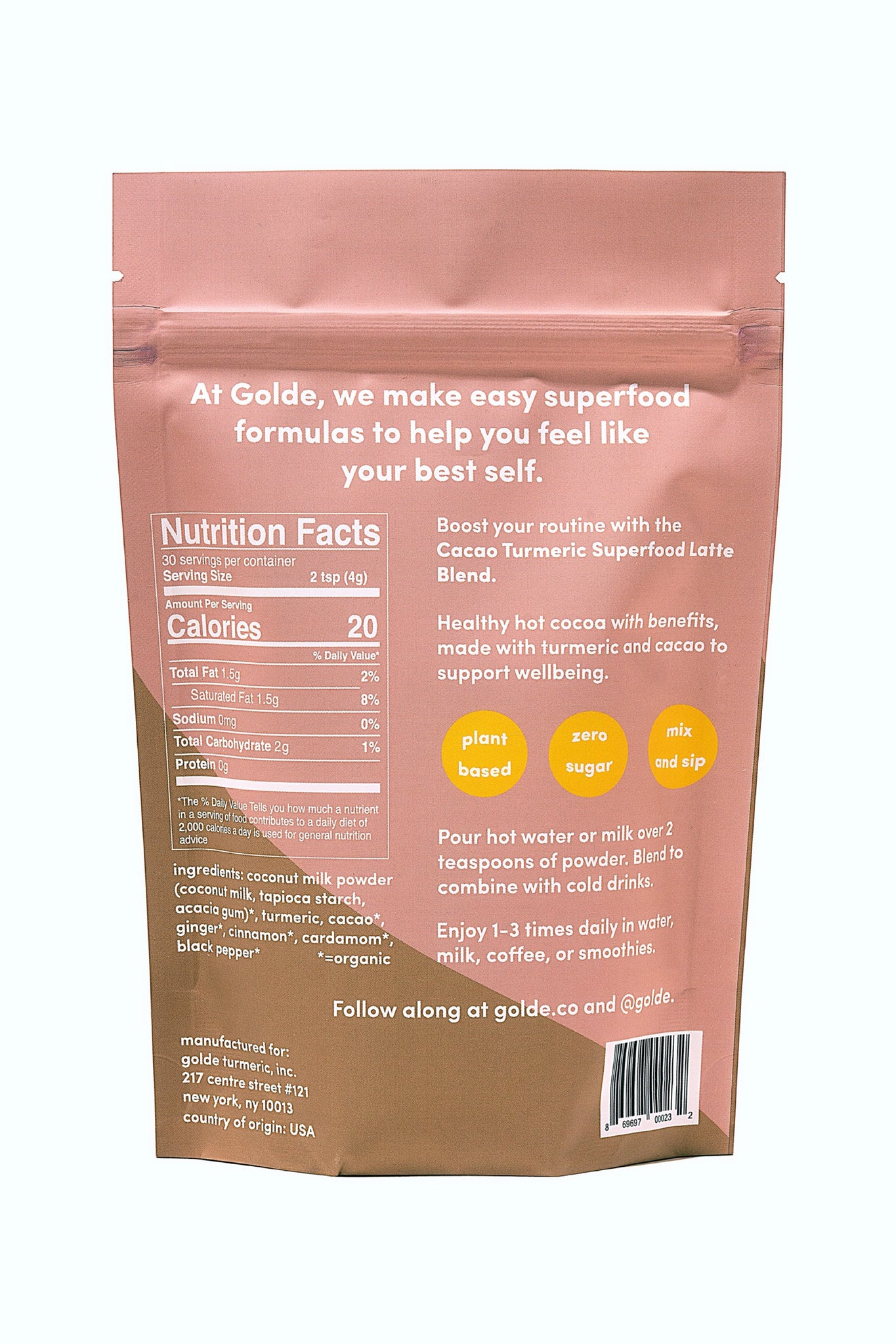 Ingredients: coconut milk powder (coconut milk, tapioca starch, acacia gum)*, turmeric**, cacao*, ginger*, cinnamon*, cardamom*, black pepper*