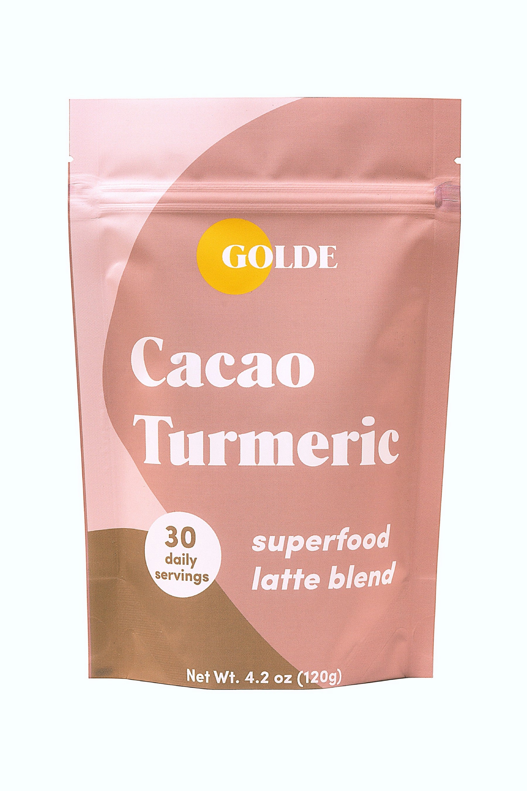 Like a hot cocoa with benefits, the Cacao Turmeric Superfood Latte is a powder blend of 7 essential superfoods to support skin glow, debloating, and stress balance. 30 servings.