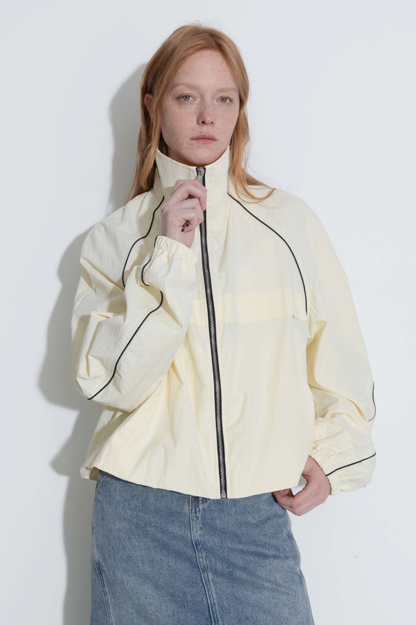 Color-Block zipper short jacket in coffee/beige. Features contrast color design, front zip fastening, drop shoulders, two side welt pockets, long sleeves with elasticated cuffs, and an adjustable drawstring hem.
