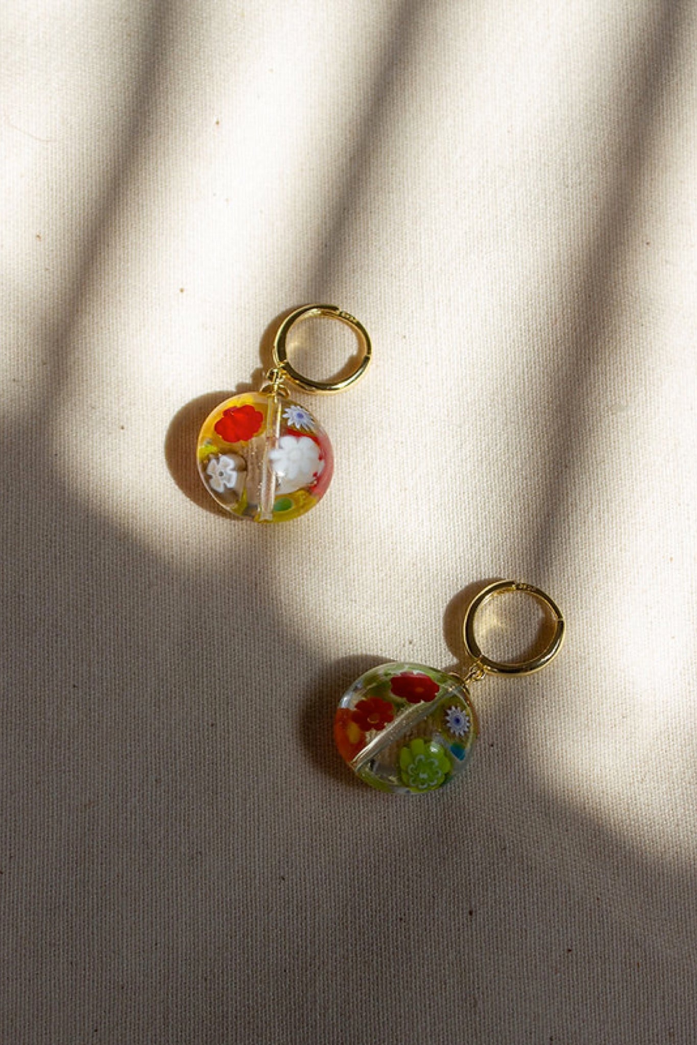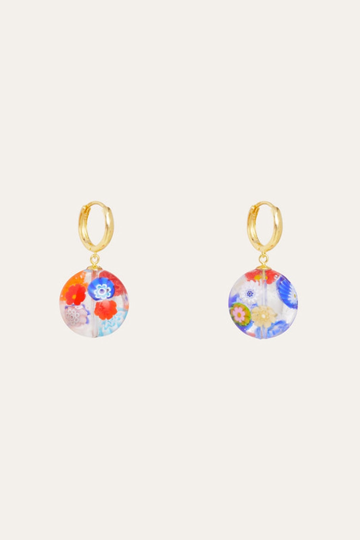 Flower Millefiori bead made in Murano, Italy on a simple gold hoop.