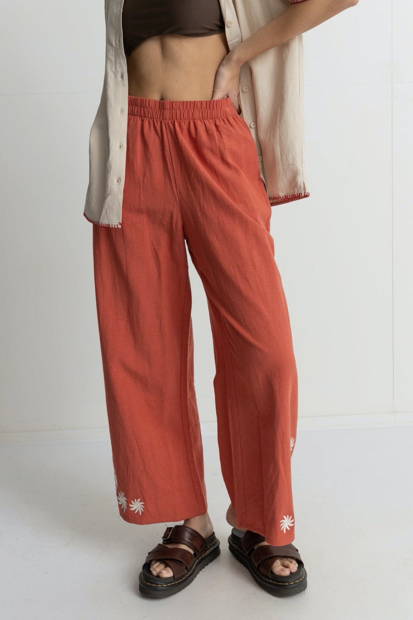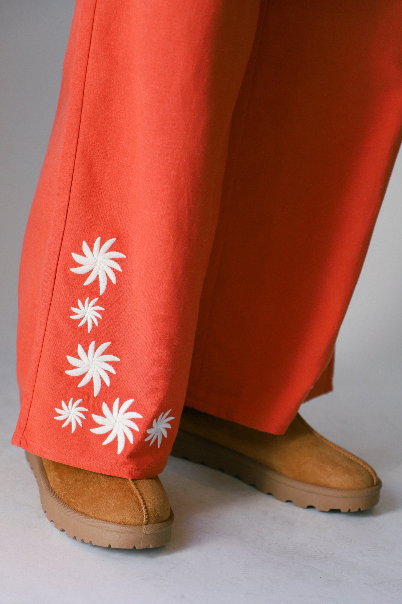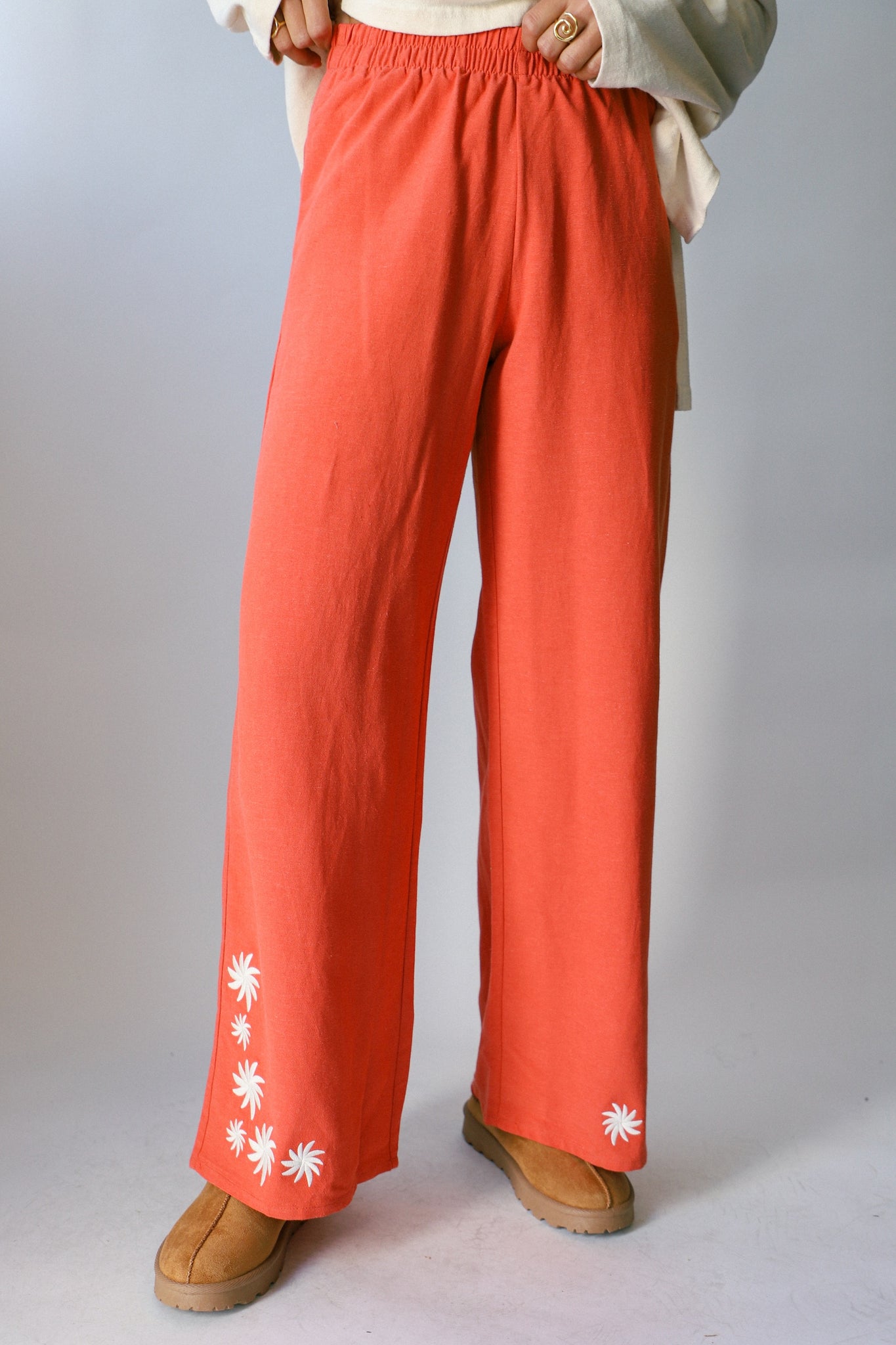 These pants feature an abstract floral design detail on the ankle cuffs and back pocket, adding a touch of femininity to this relaxed, wide-leg silhouette. The pants have an elastic waistband, ensuring a comfortable fit for all-day wear.