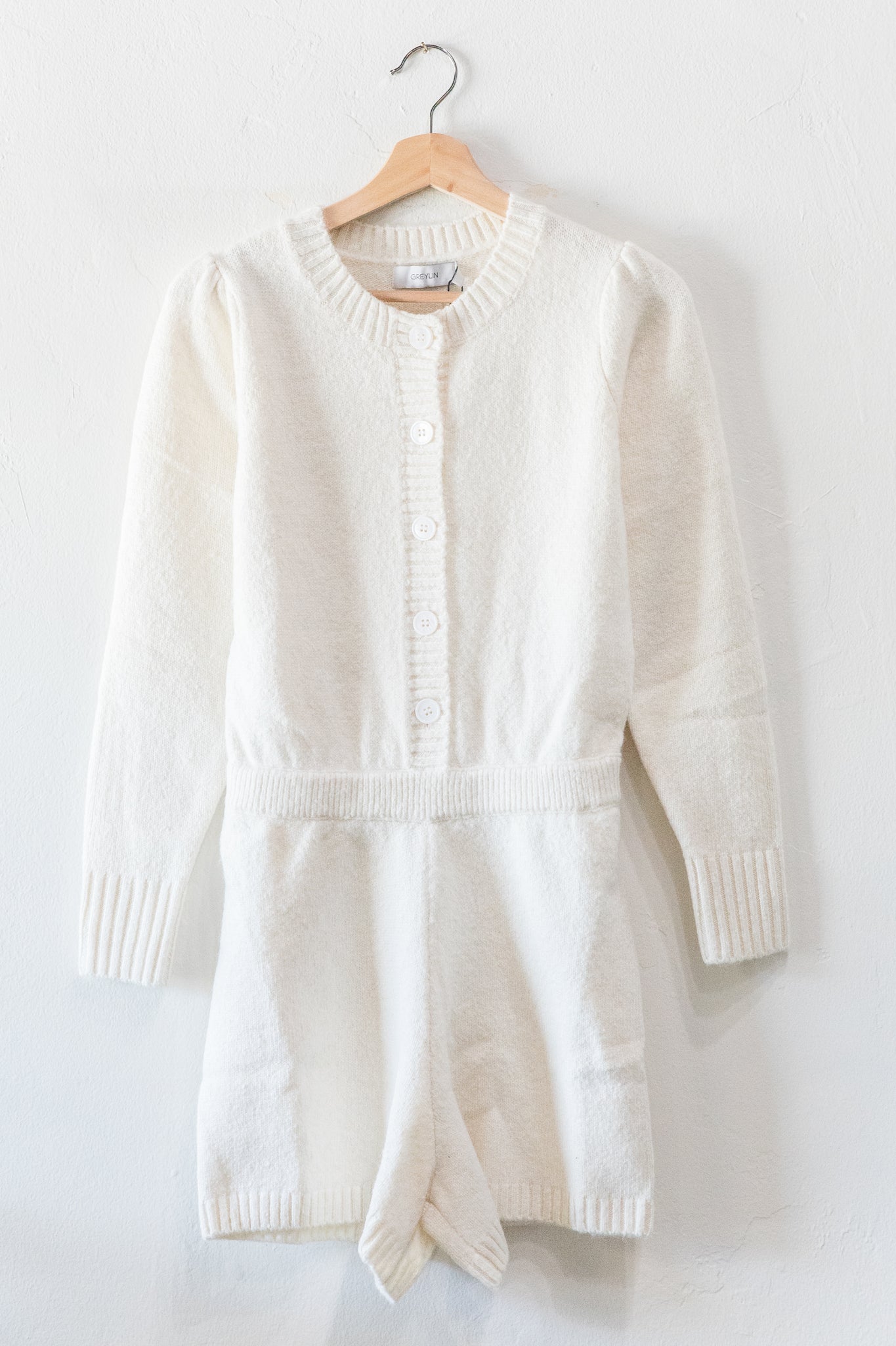 Cozy cream knot romper with 5 buttons. Button colors may vary from pearl to brown.