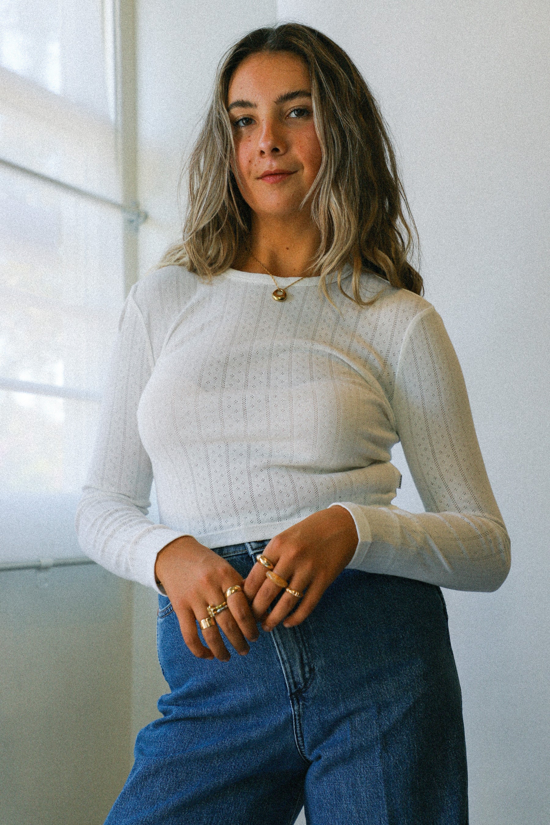 Soft cotton pointelle tee featuring a delicate pattern on the perfect slim fitting shape.