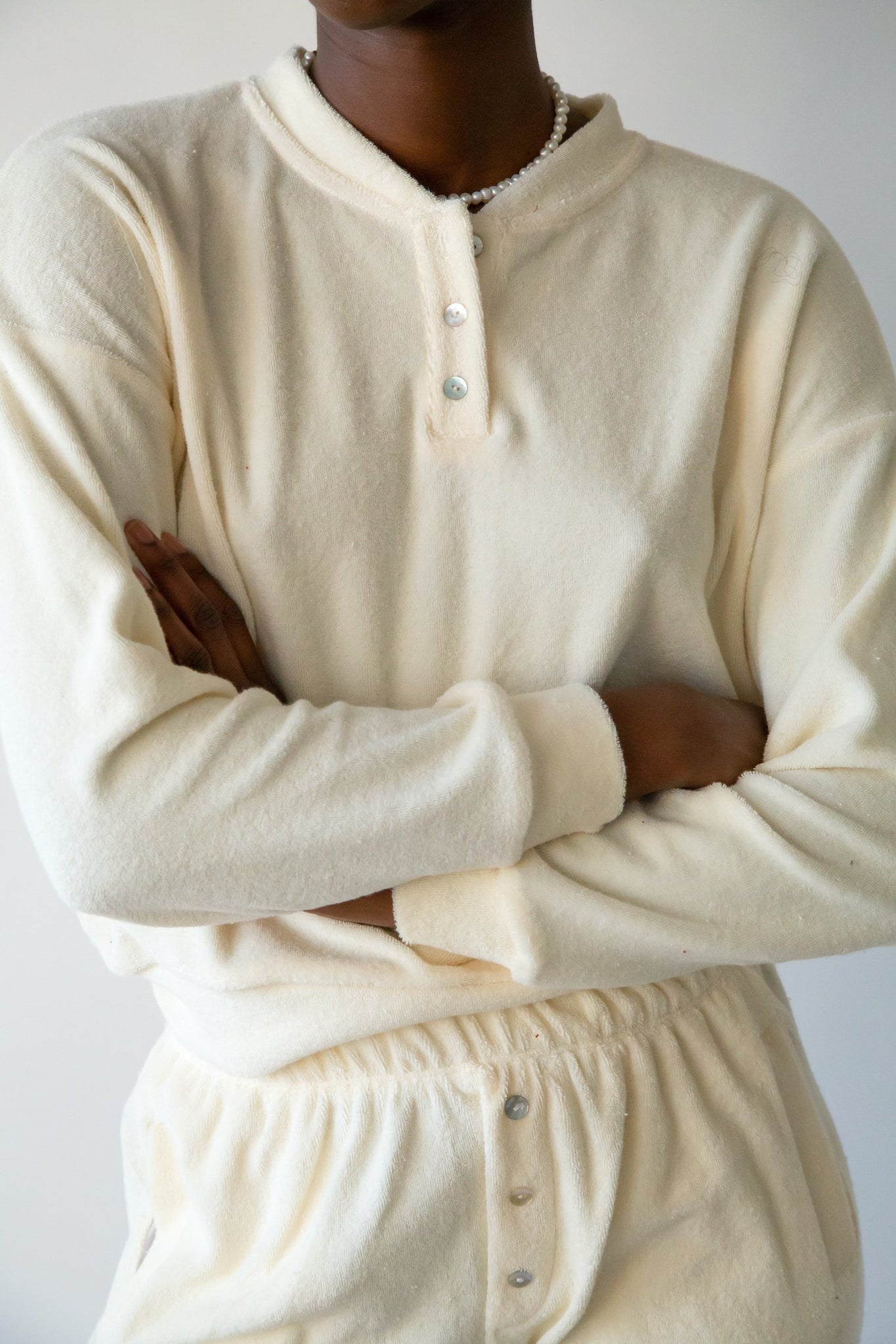 Cozy sweatshirt featuring a vintage inspired terry fabric and mother of pearl buttons. Made in LA.
