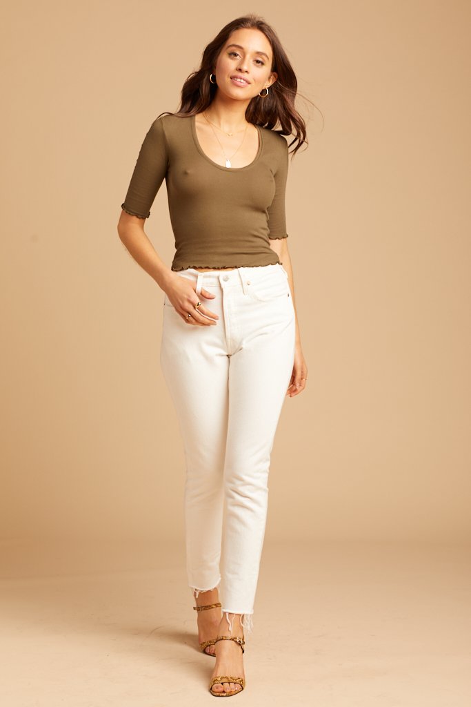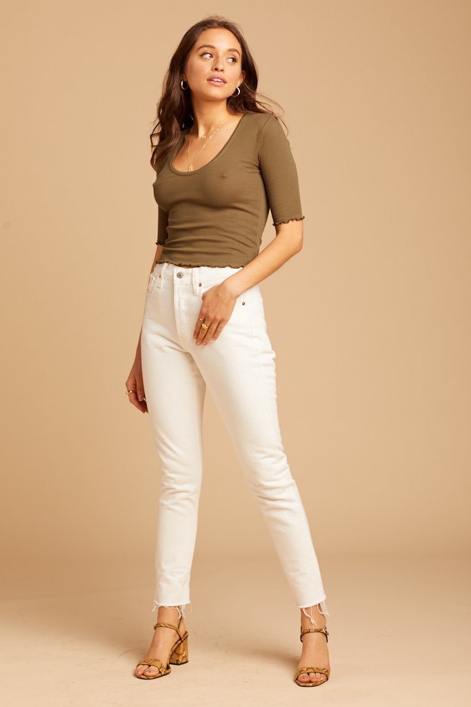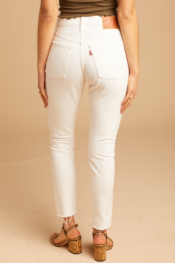 Look so fresh and so clean in these crisp white Levi's. Features a skinny fit with a cut off unfinished hem, a button fly, and subtle distressing on the pocket seams.