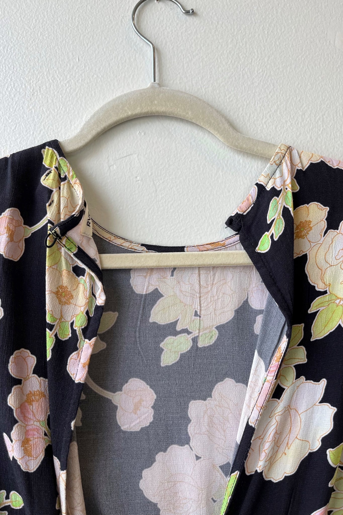 Missing button on the back neck closure.