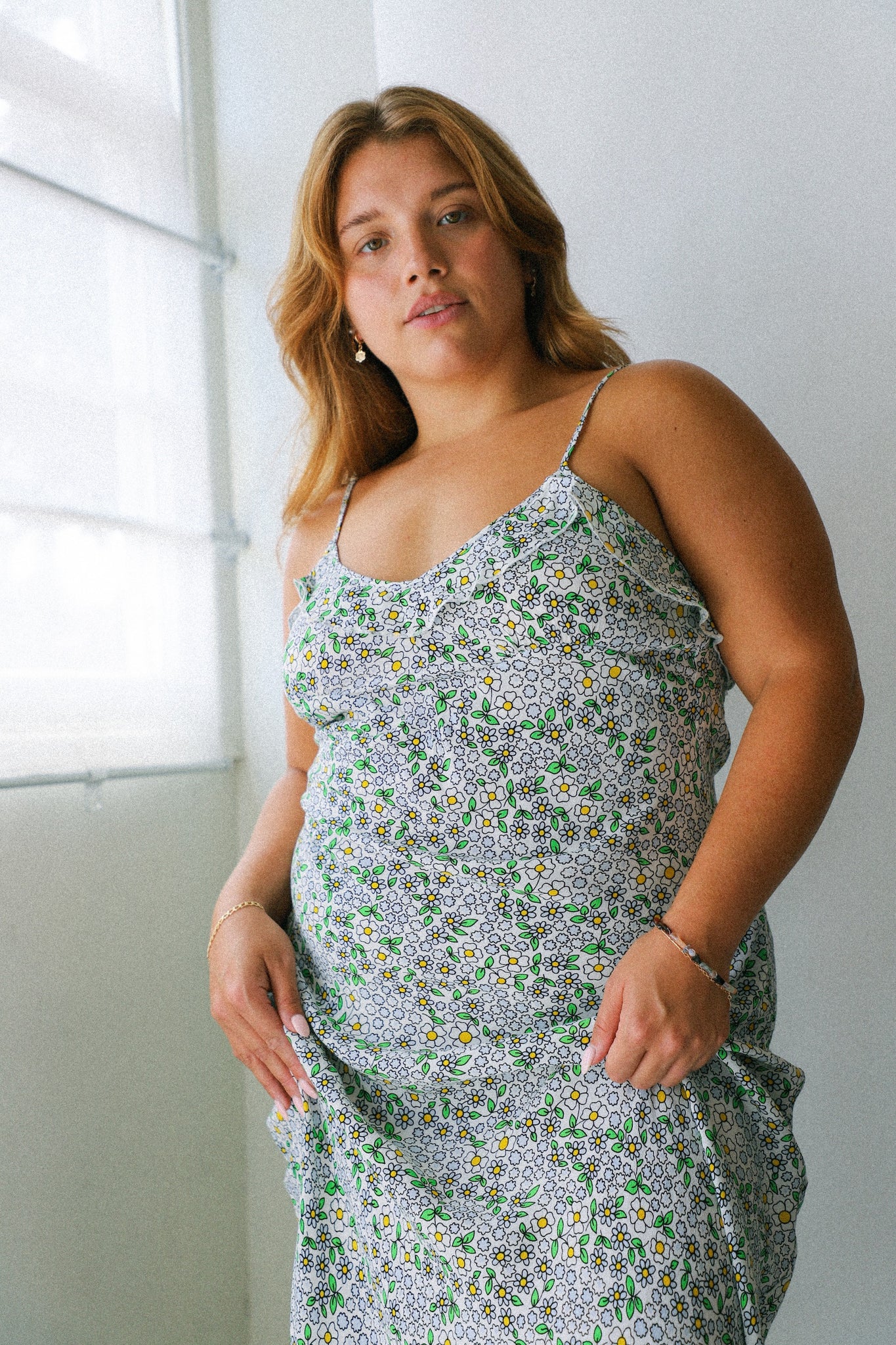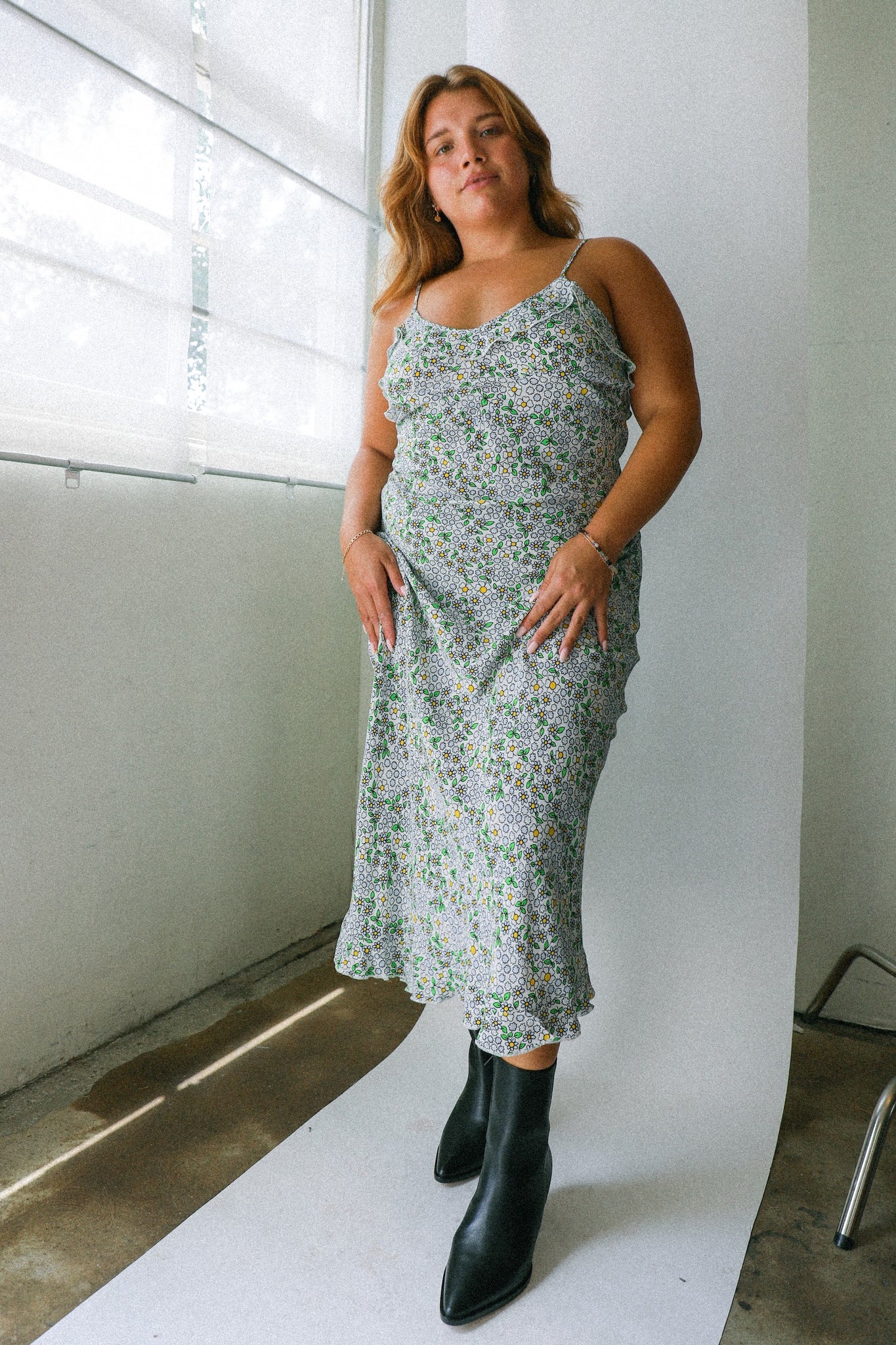 Ruffled midi dress featuring a muted floral pattern with adjustable straps.