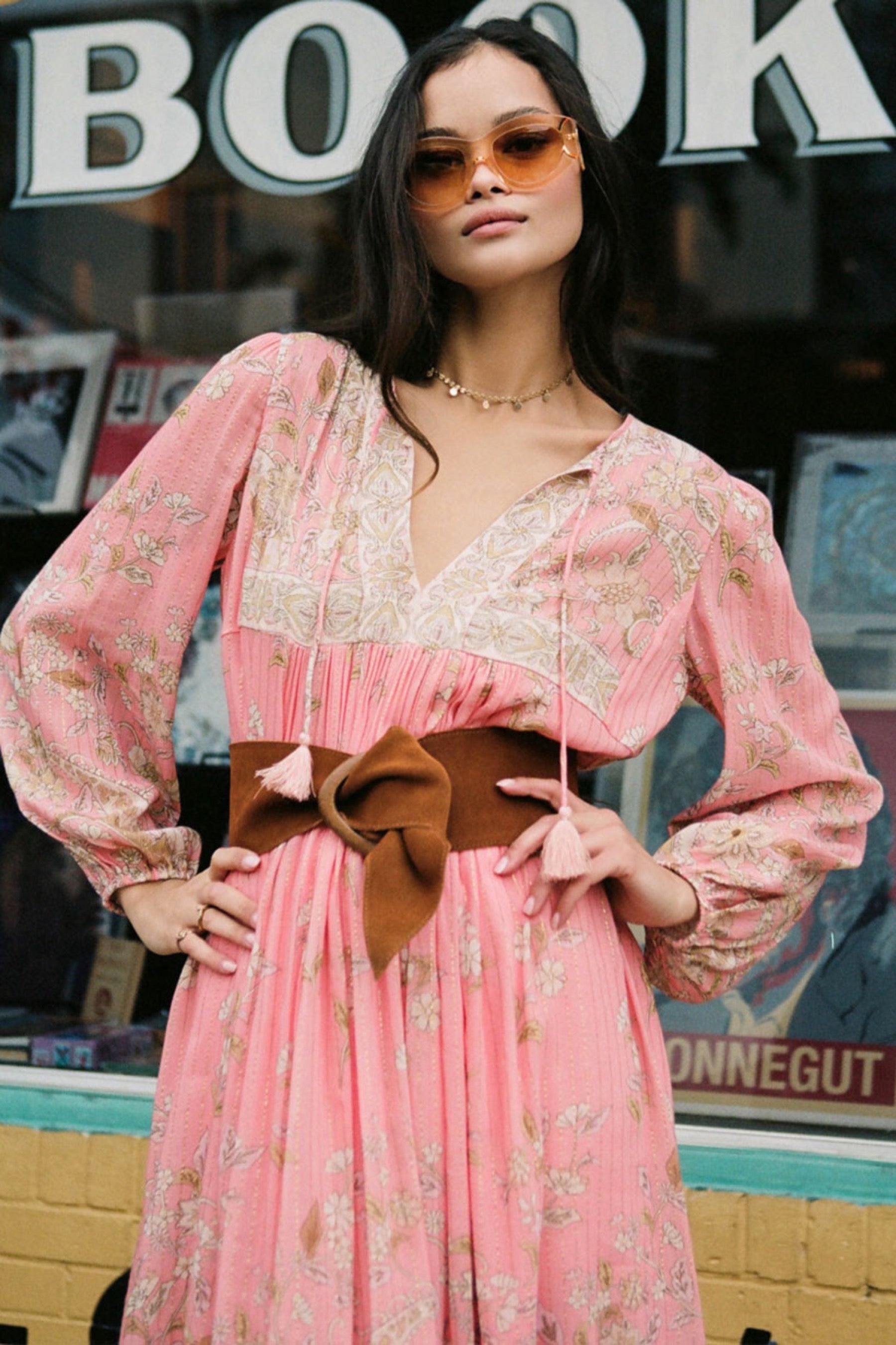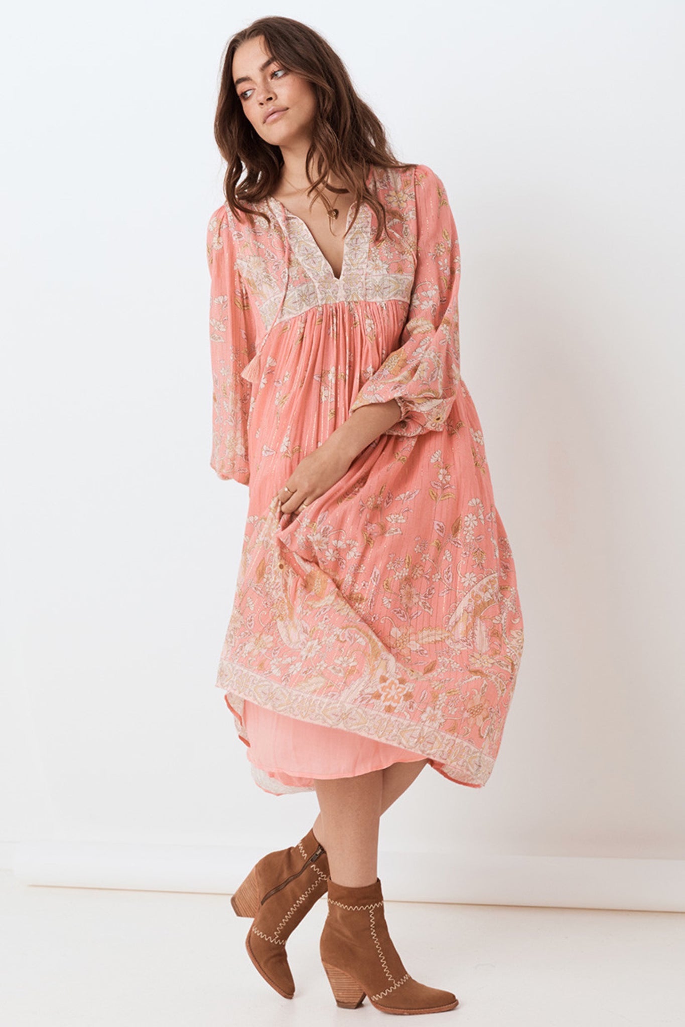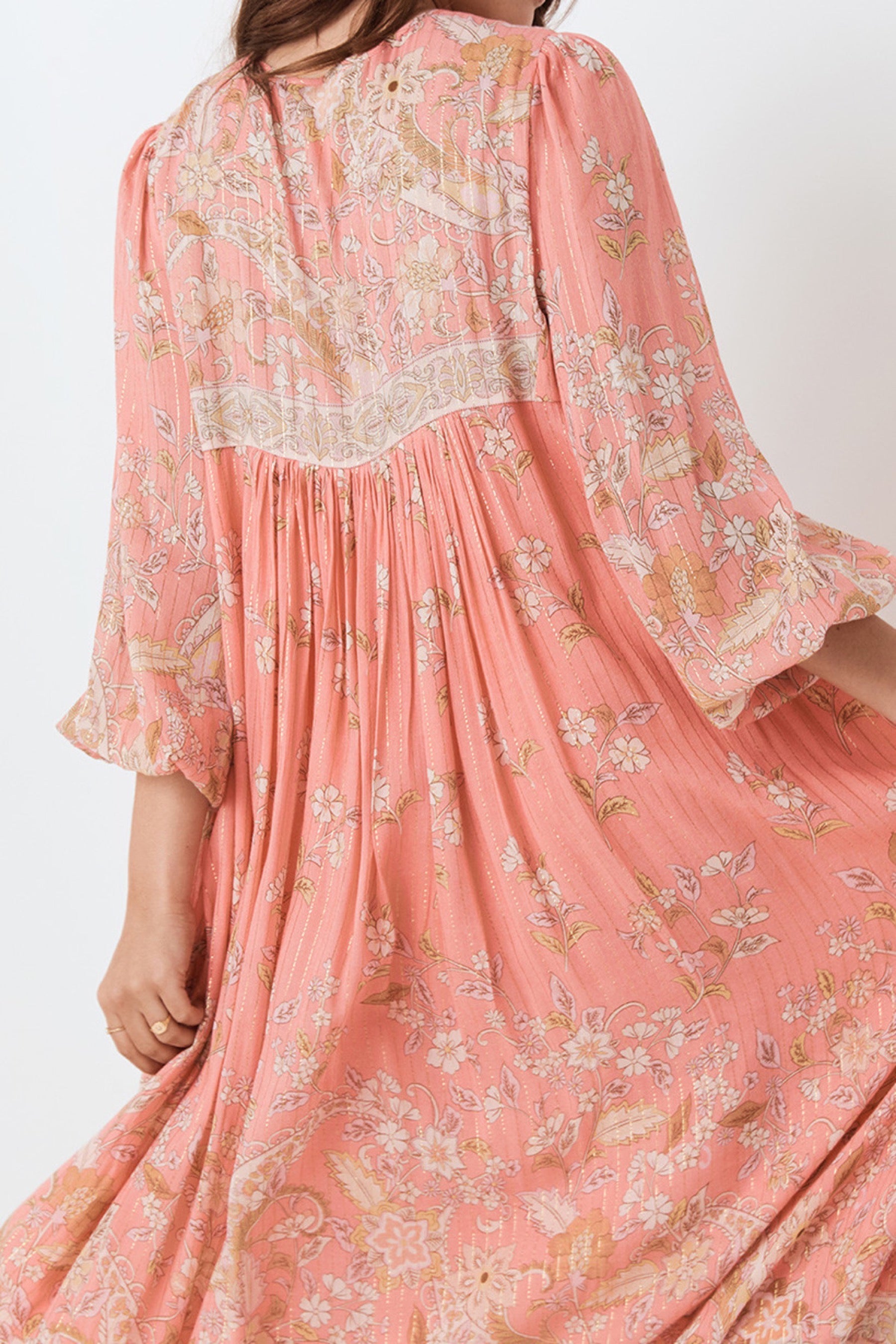 This dreamy dress with its stunning print placement on both the front and back yoke, is one for the dreamers and adds a laid-back, feminine charm to any occasion. Featuring gathers from the yoke, a neck tie with tassel and an elastic sleeve cuff to gently billow the sleeve, this ever-popular style is instantly disarming and easy to love.