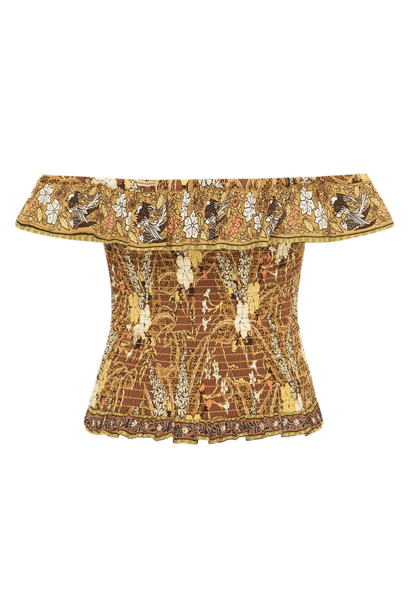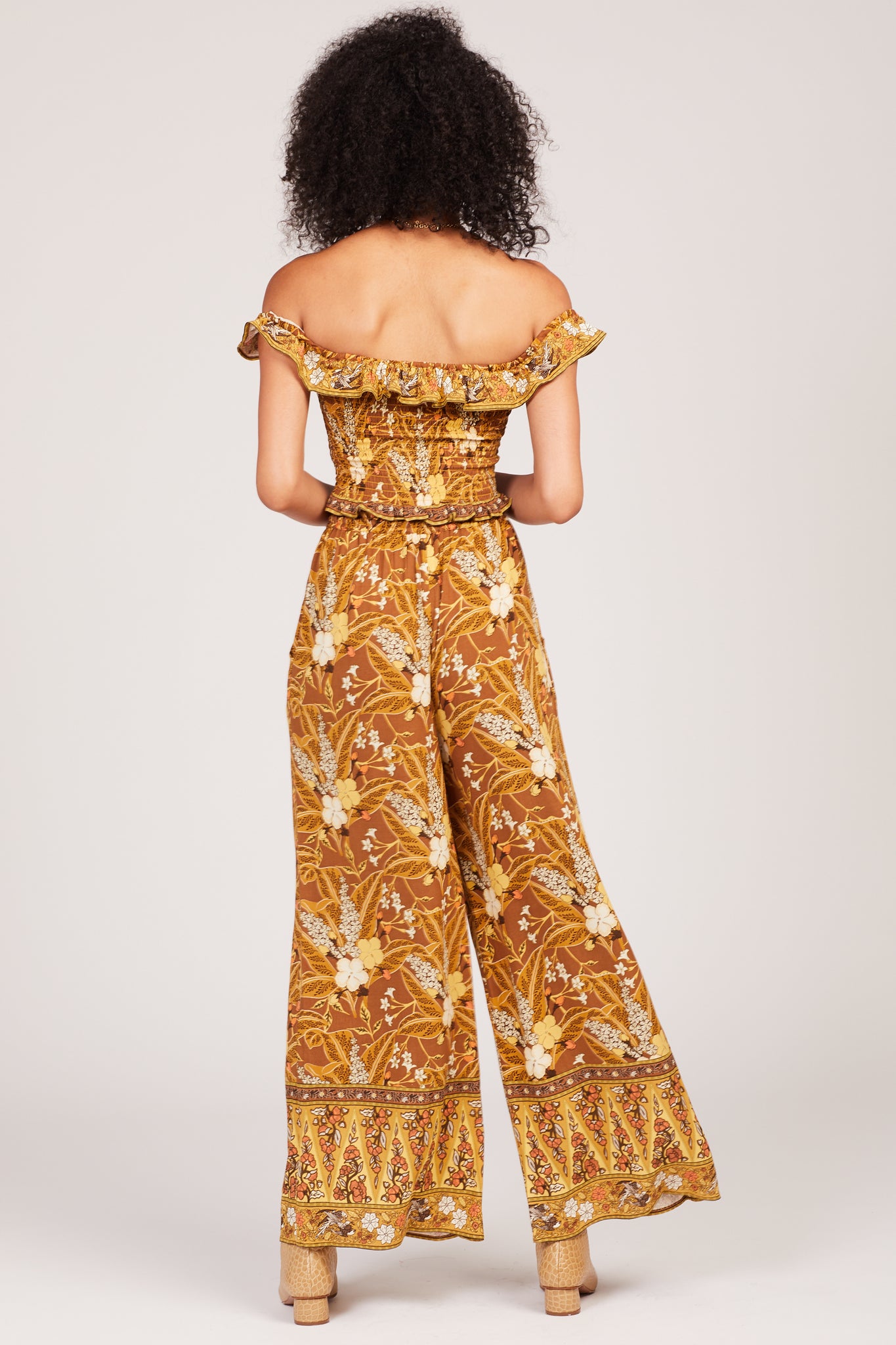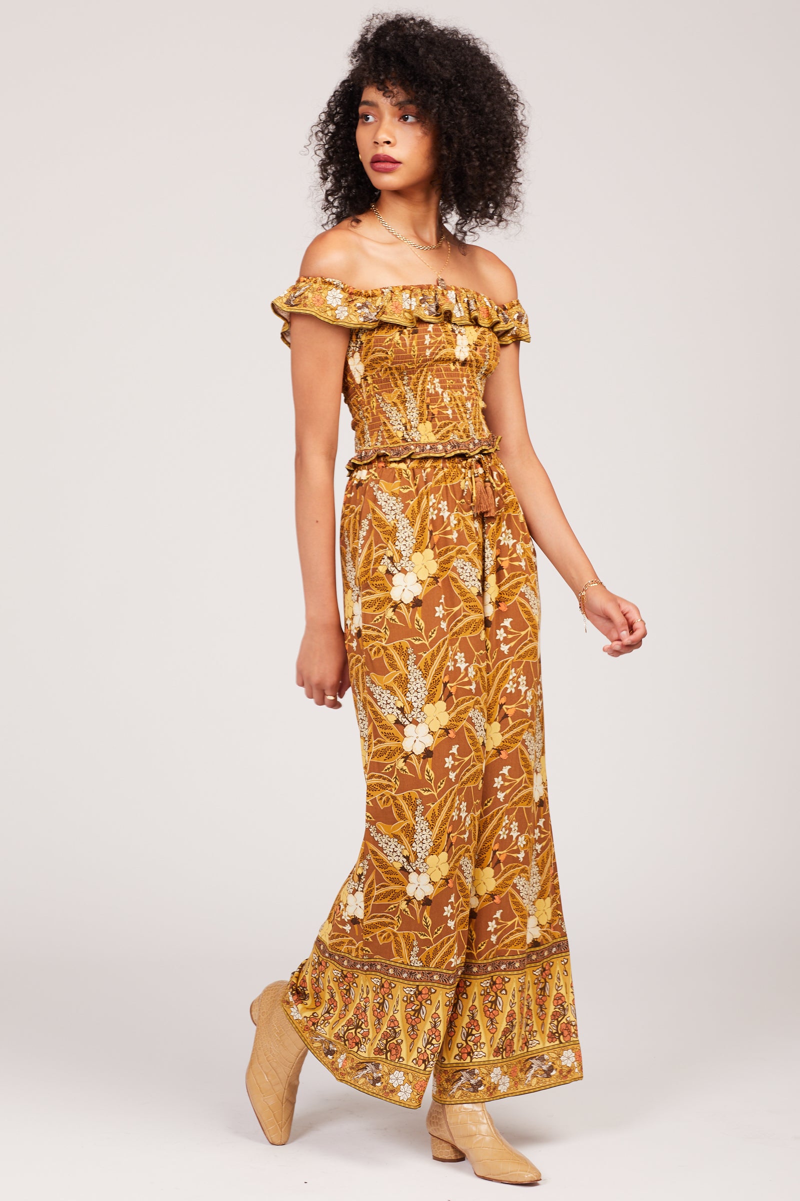 The gorgeous earth tones on this off the shoulder top will spice up your autumn wardrobe! Features a ruched bodice and cropped fit. Pair with the matching wide leg pants for a comfortable, yet effortless look!