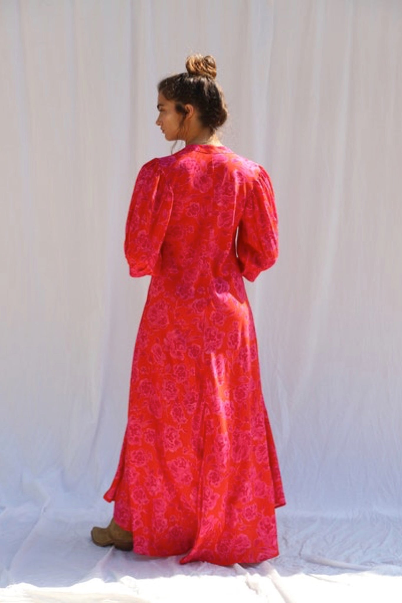 Vibrant maxi dress featuring a button up v-neck, 3/4 length puffy sleeves in a bold floral print.