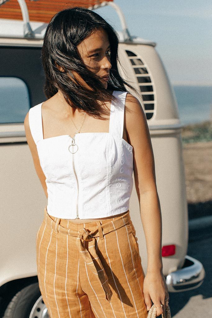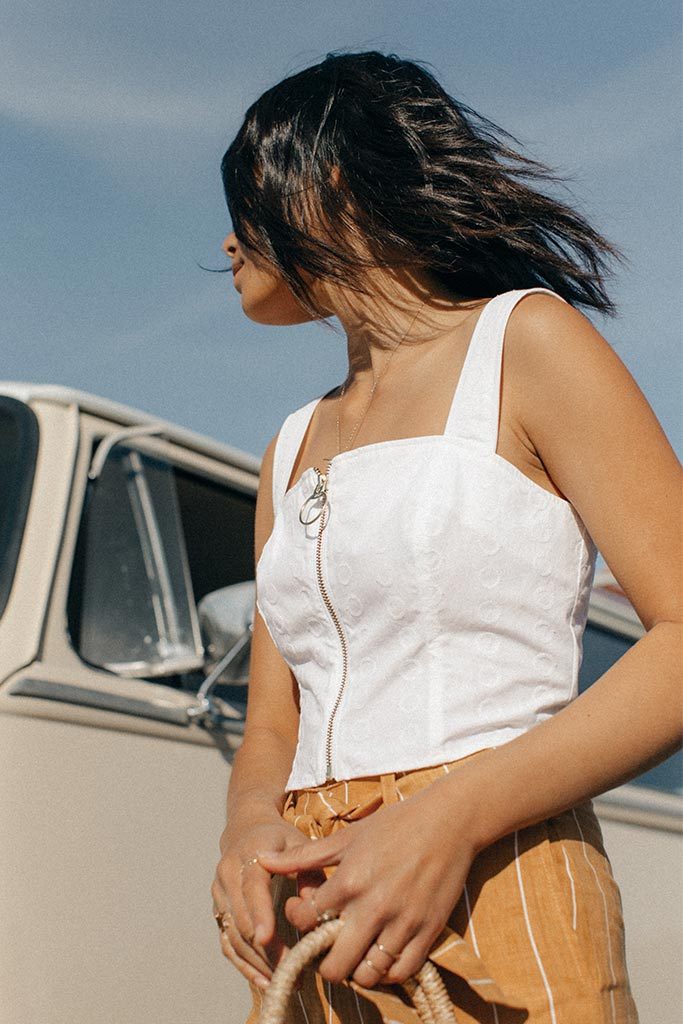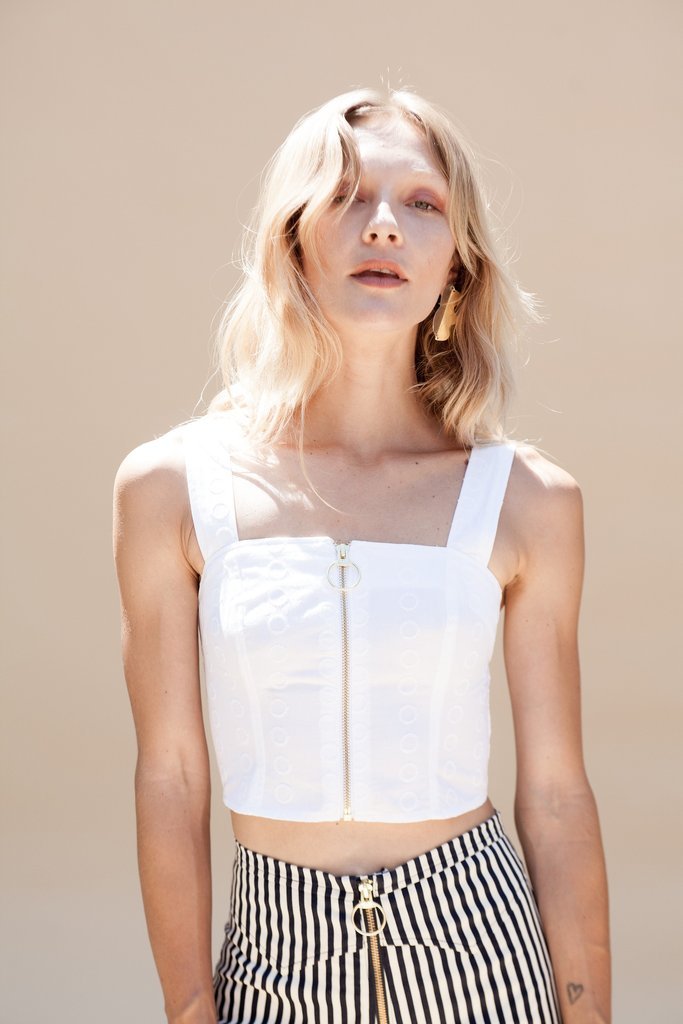 Amazing in every way, this crop top features all-over circle embroidery, a bustier-fit, and a gold zip-up front. Pair with denim or the Jesse Pant.