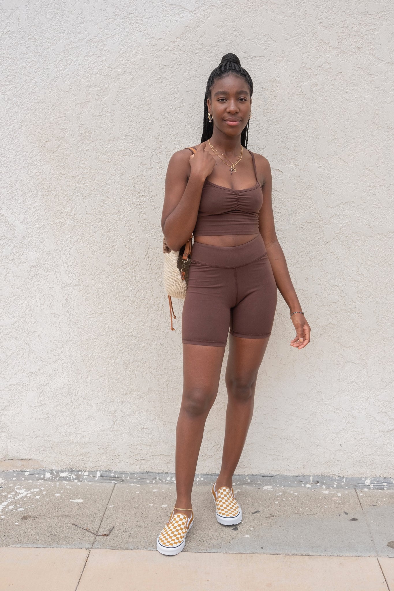 A sweet lil workout tank. Sports bra meets cropped tank, this organic cotton spandex top features spaghetti straps and double layered bust with slight ruching for a feminine touch. Super stretchy and buttery soft to support you throughout your lower impact workouts.