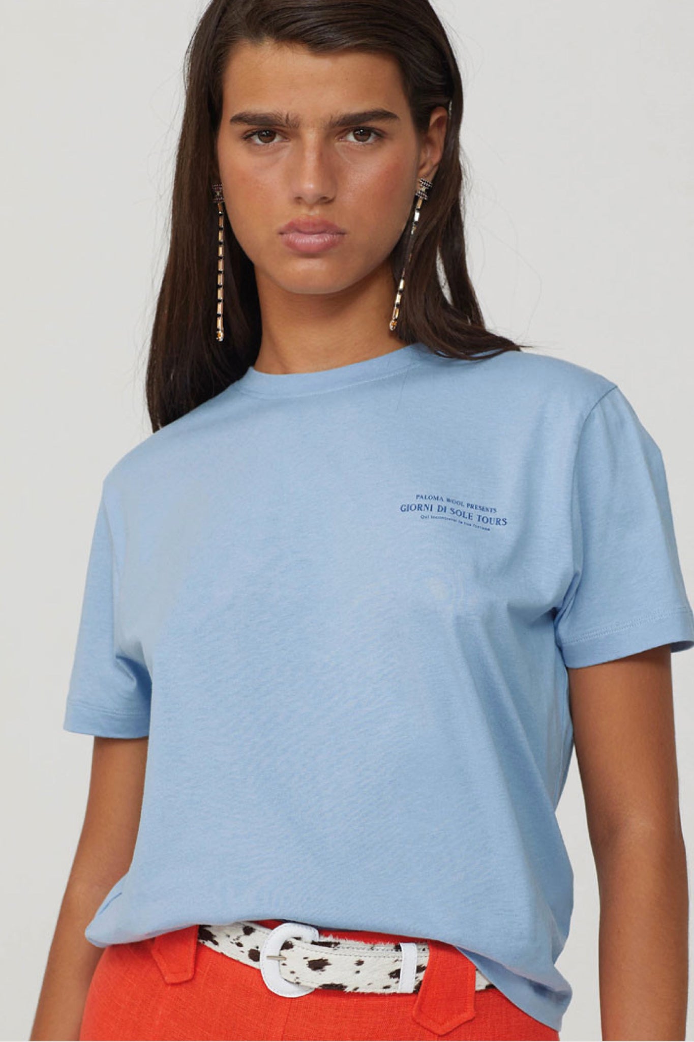 Square-fit organic cotton t-shirt with 'PW Tours' print.