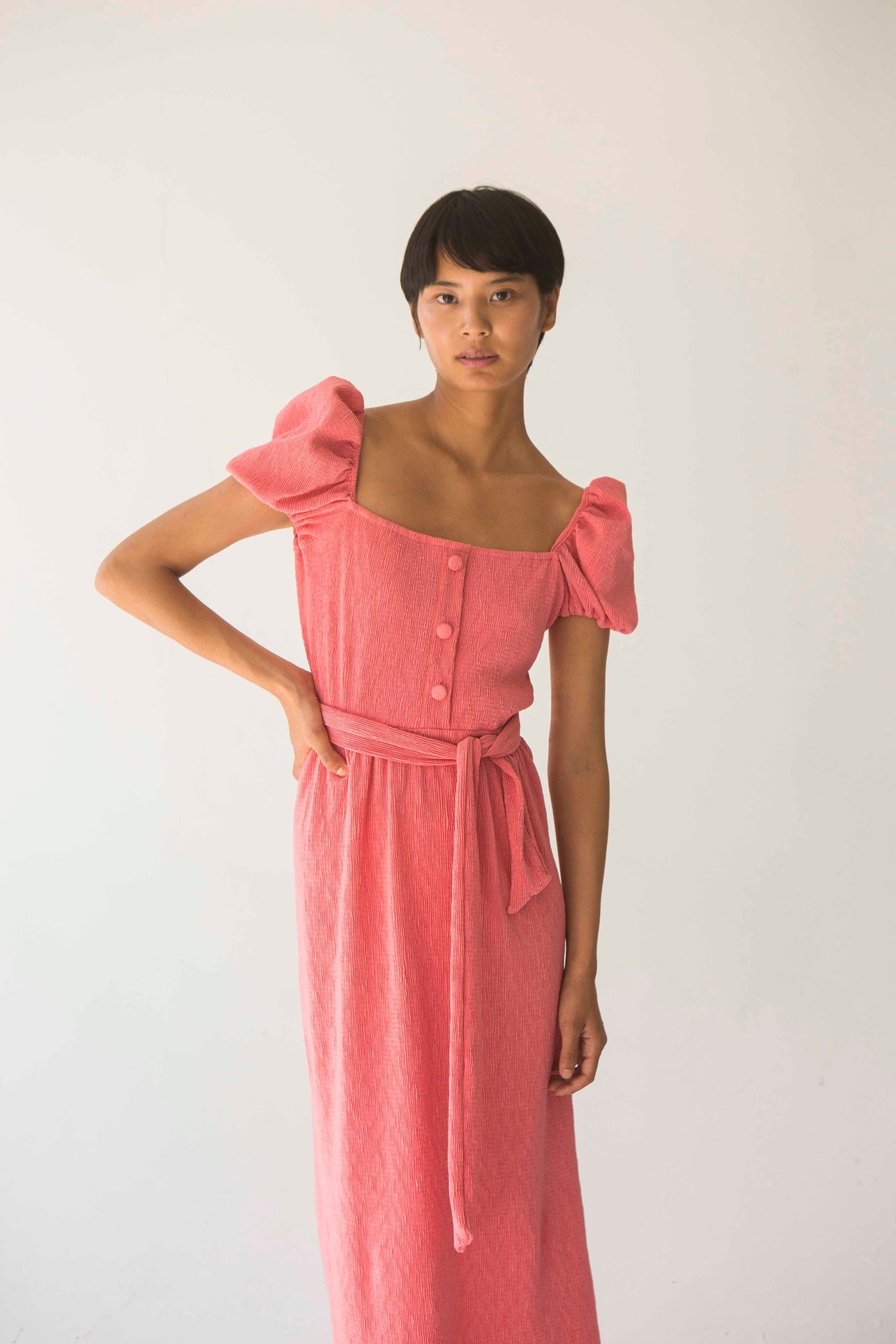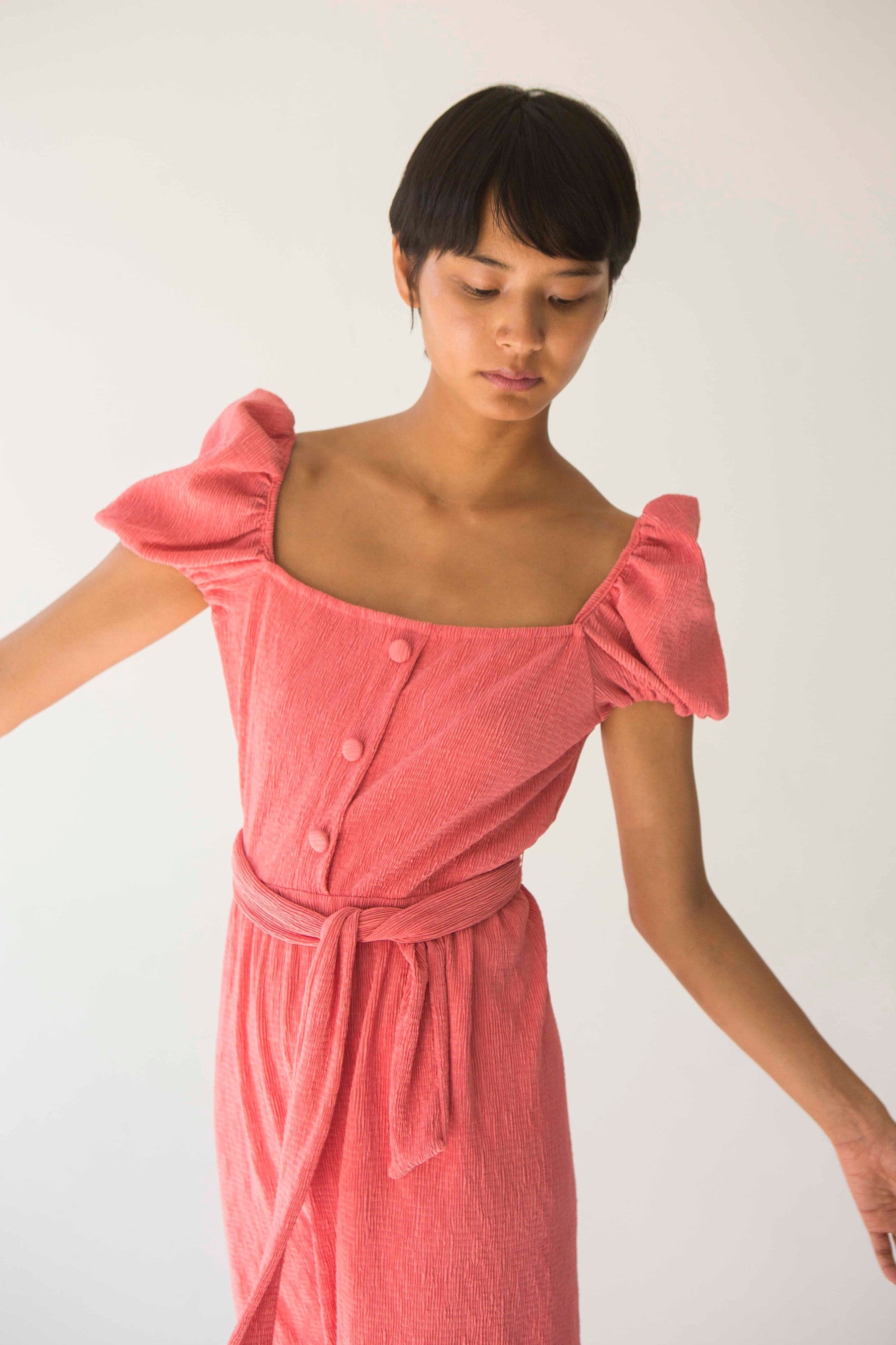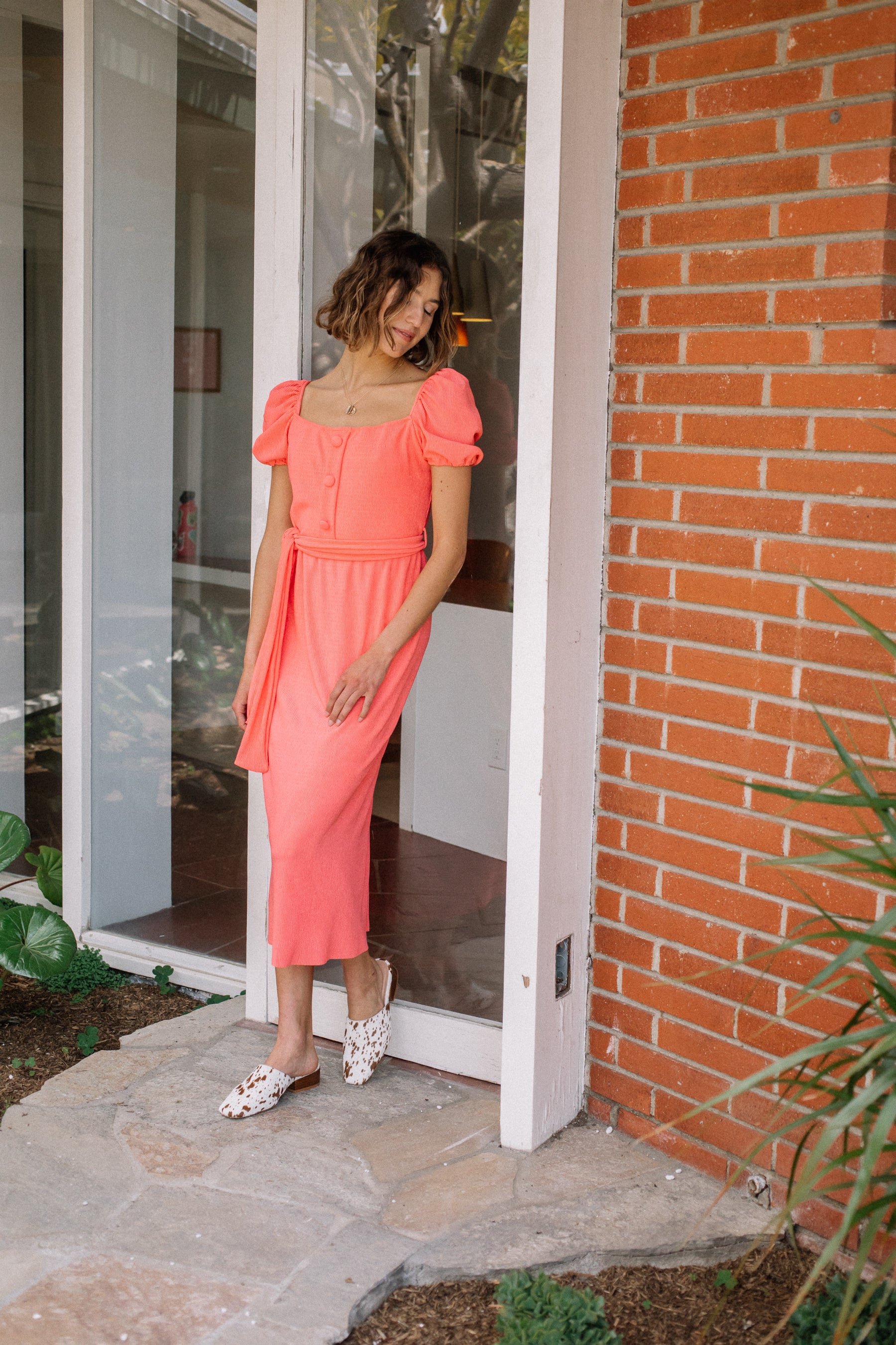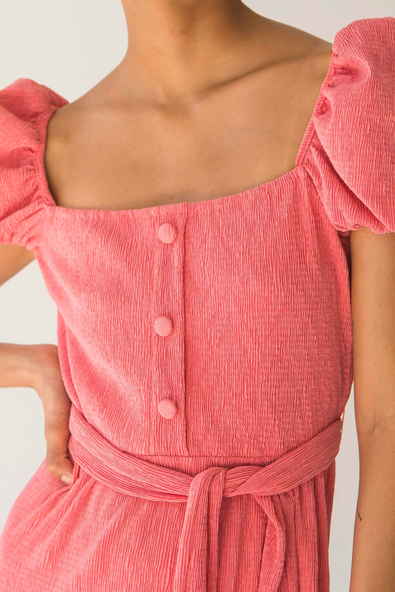 Beautiful coral pink textured dress with cute puff sleeves. Features a waist tie to accentuate that waist and faux buttons.