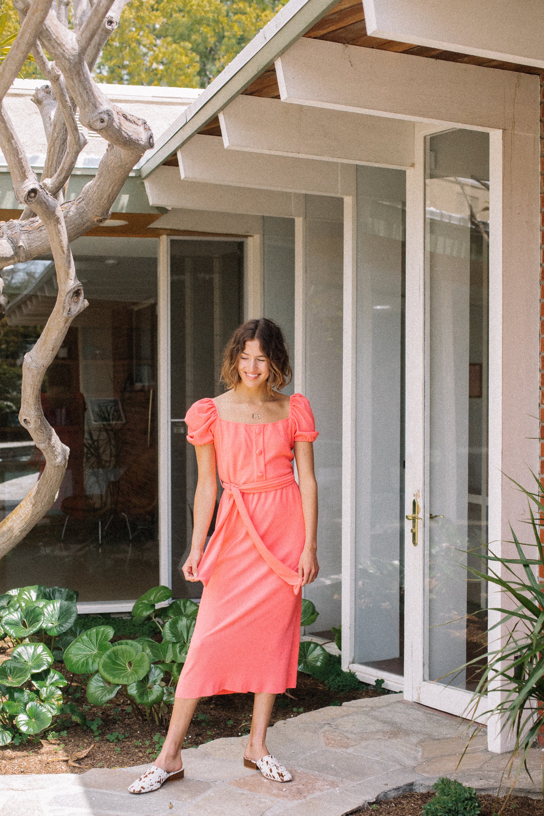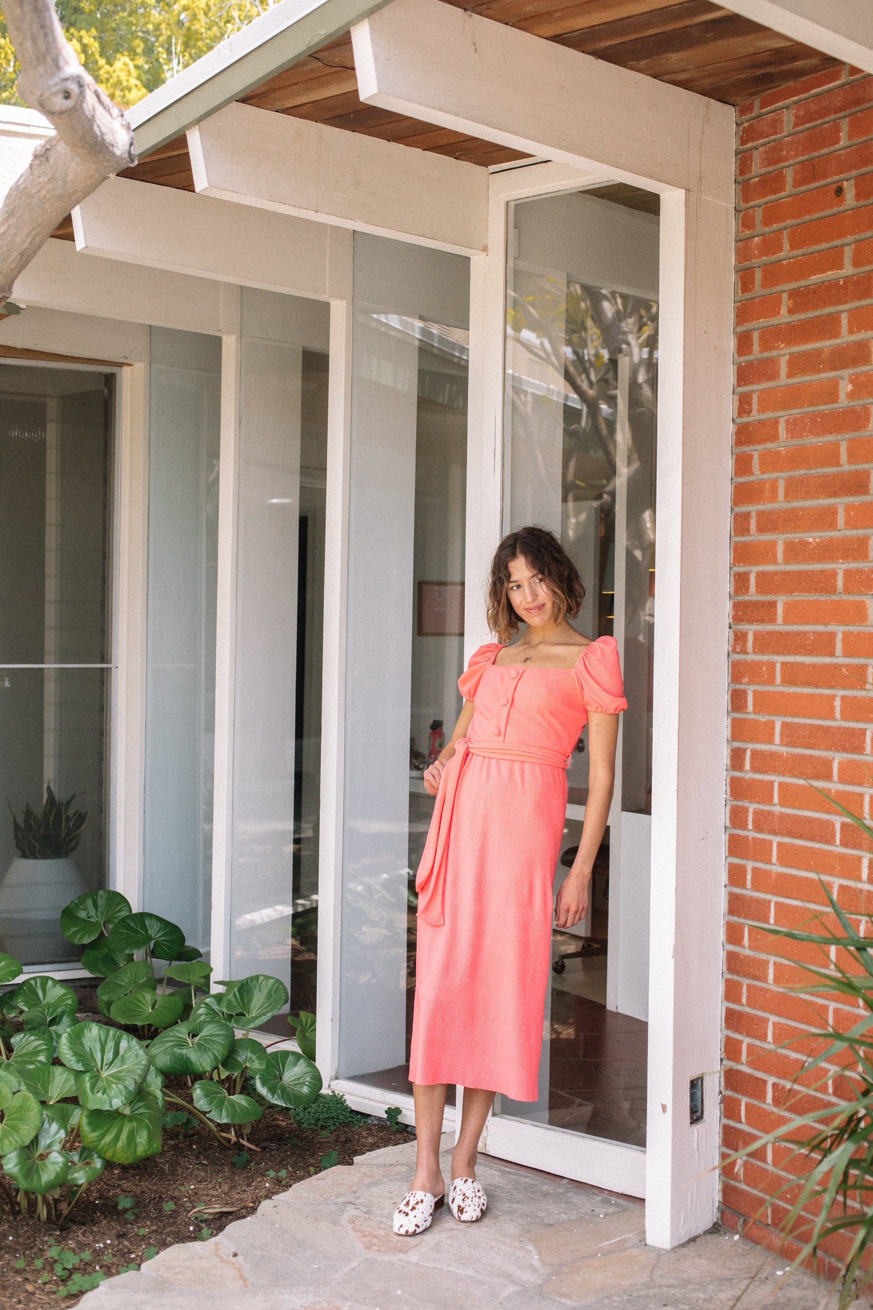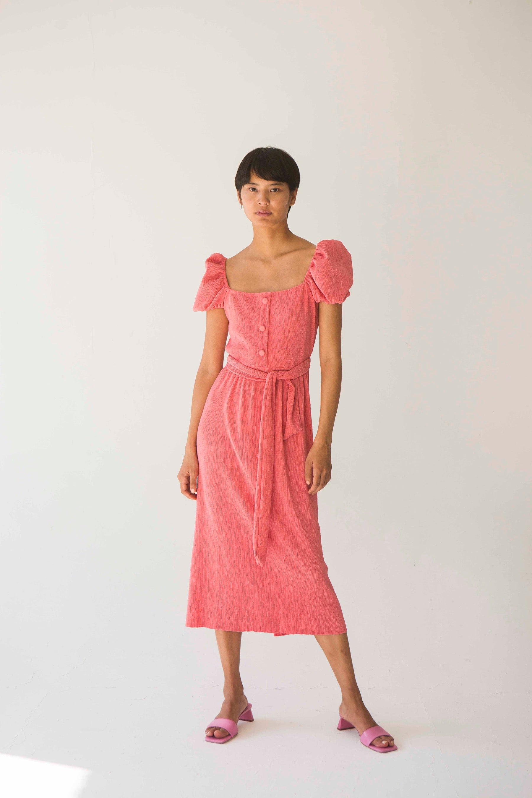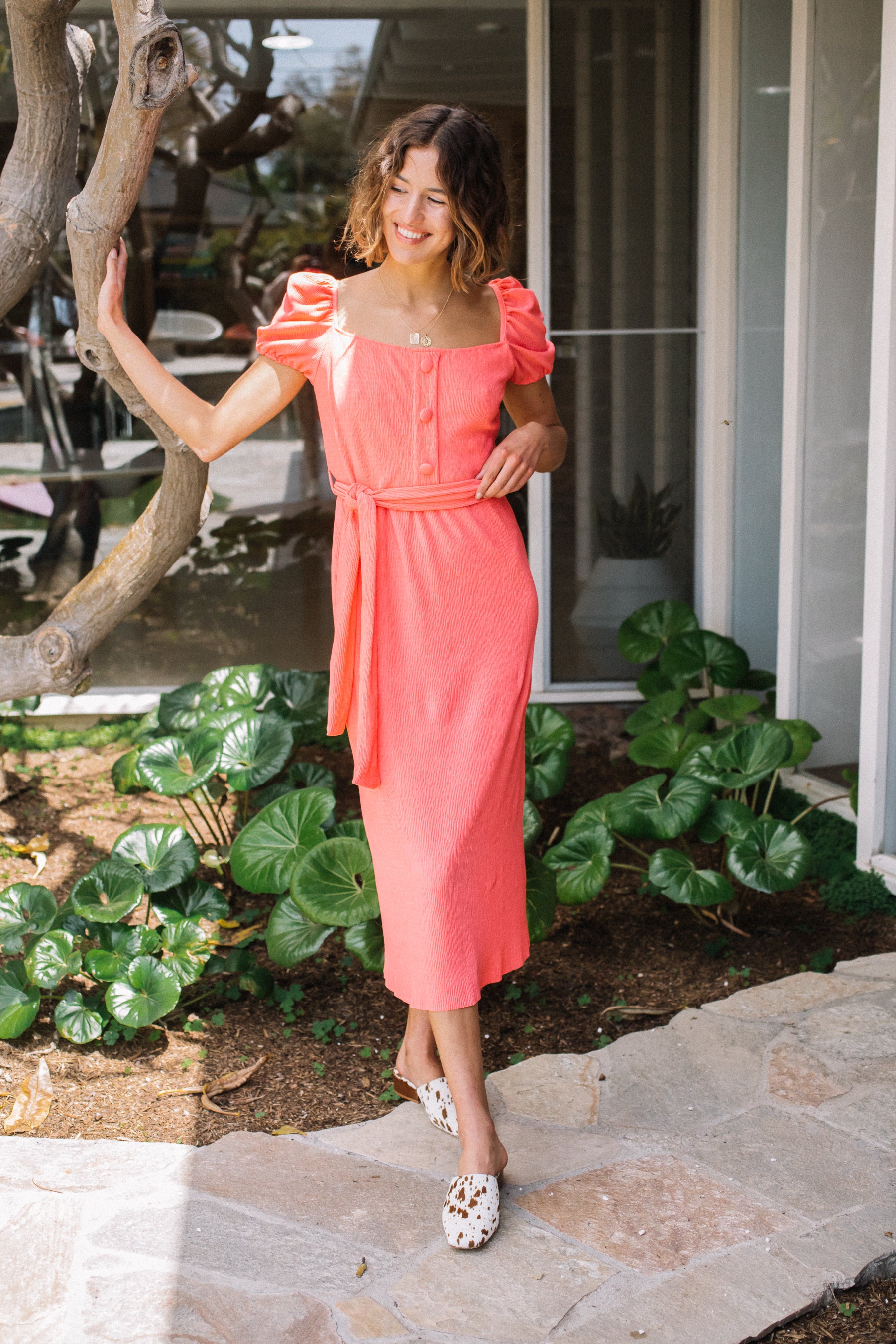 Beautiful coral pink textured dress with cute puff sleeves. Features a waist tie to accentuate that waist and faux buttons.