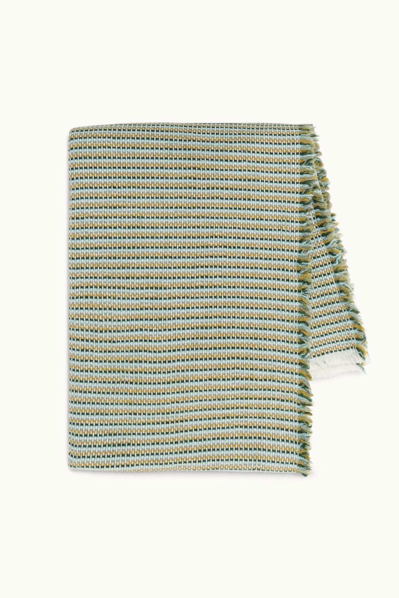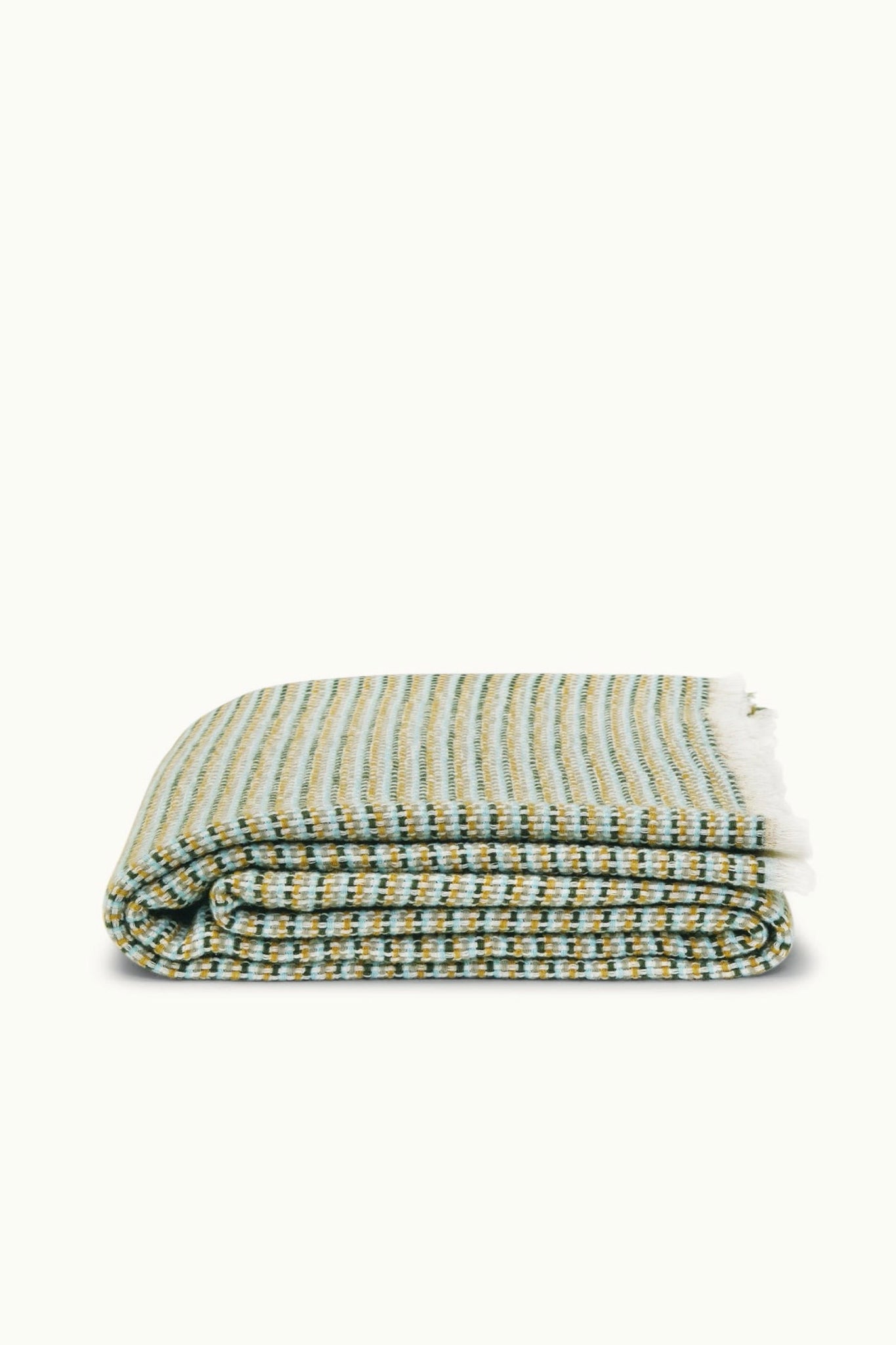Woven from luxe Italian yarns, Feliz is a beautiful wool/cotton blend blanket featuring a subtle woven stripe in a mix of golden yellow, blue, and green hues.