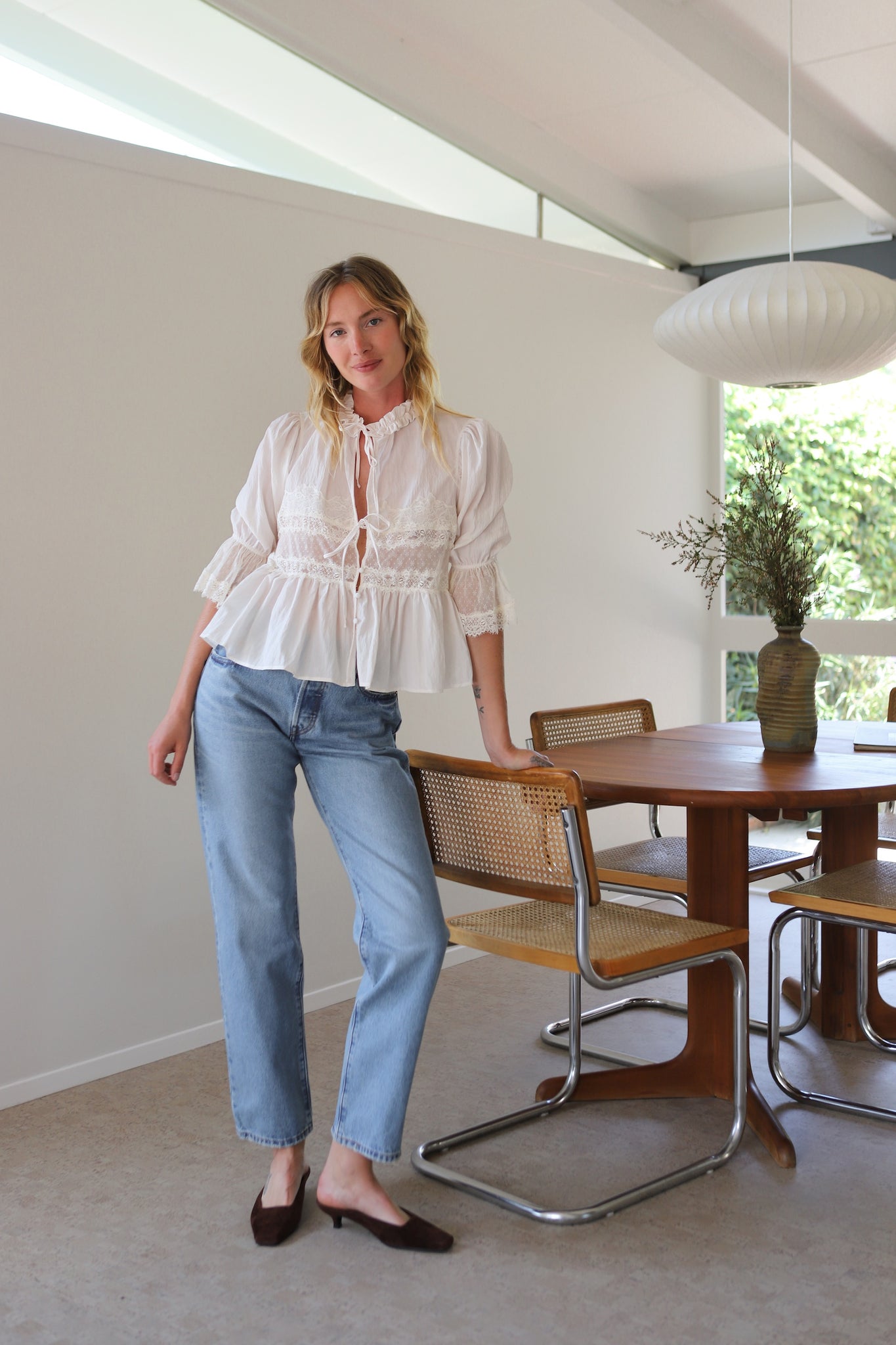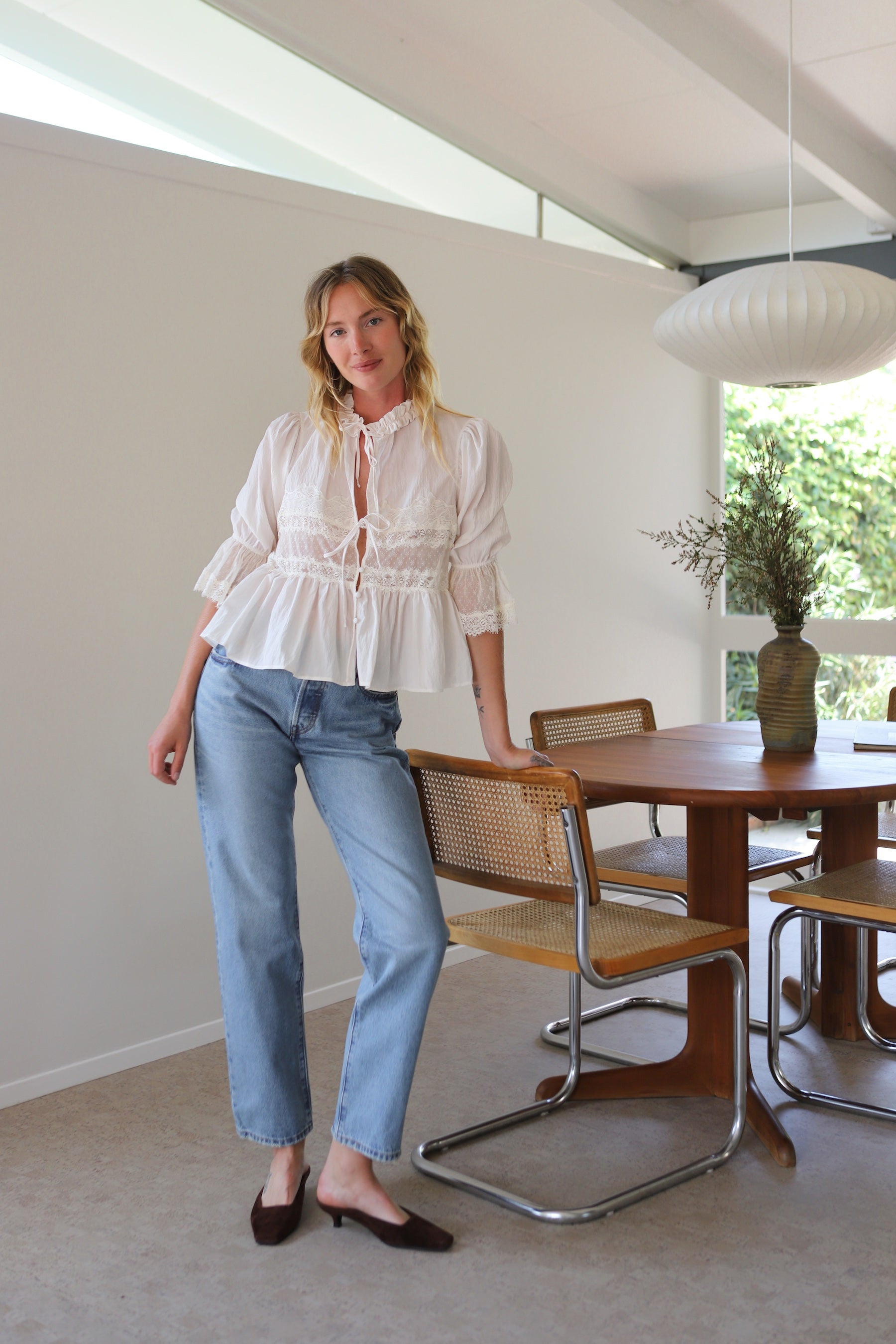 Effortlessly femme, this lace-adorned top features a soft fabrication and flattering silhouette with slightly puffy sleeves and a deep V-neckline.