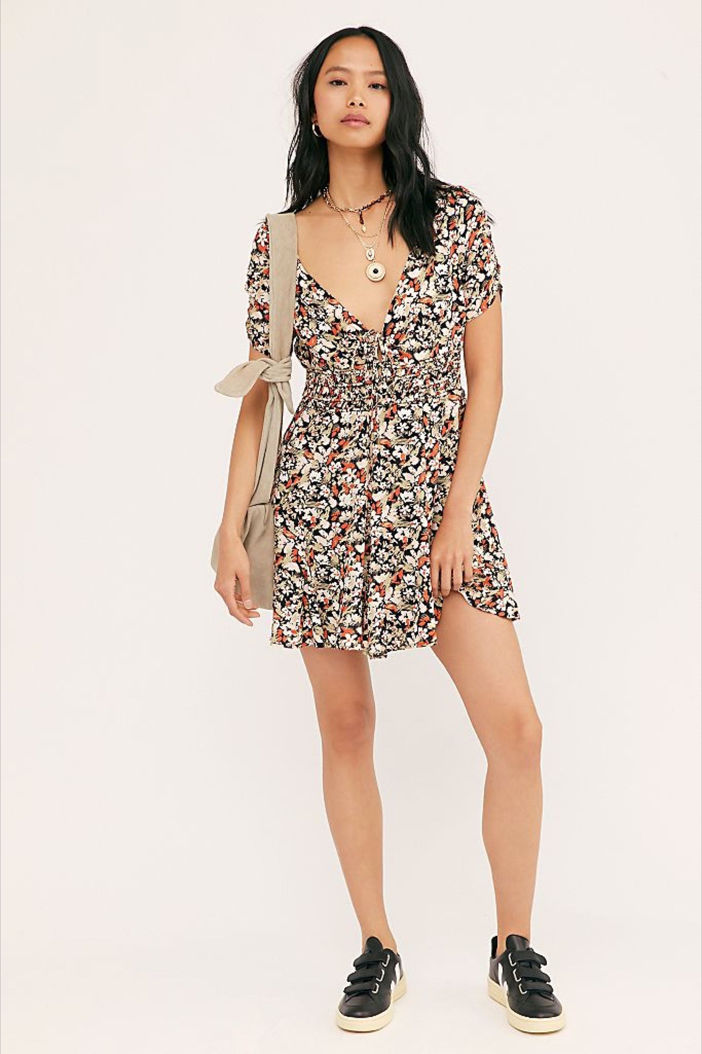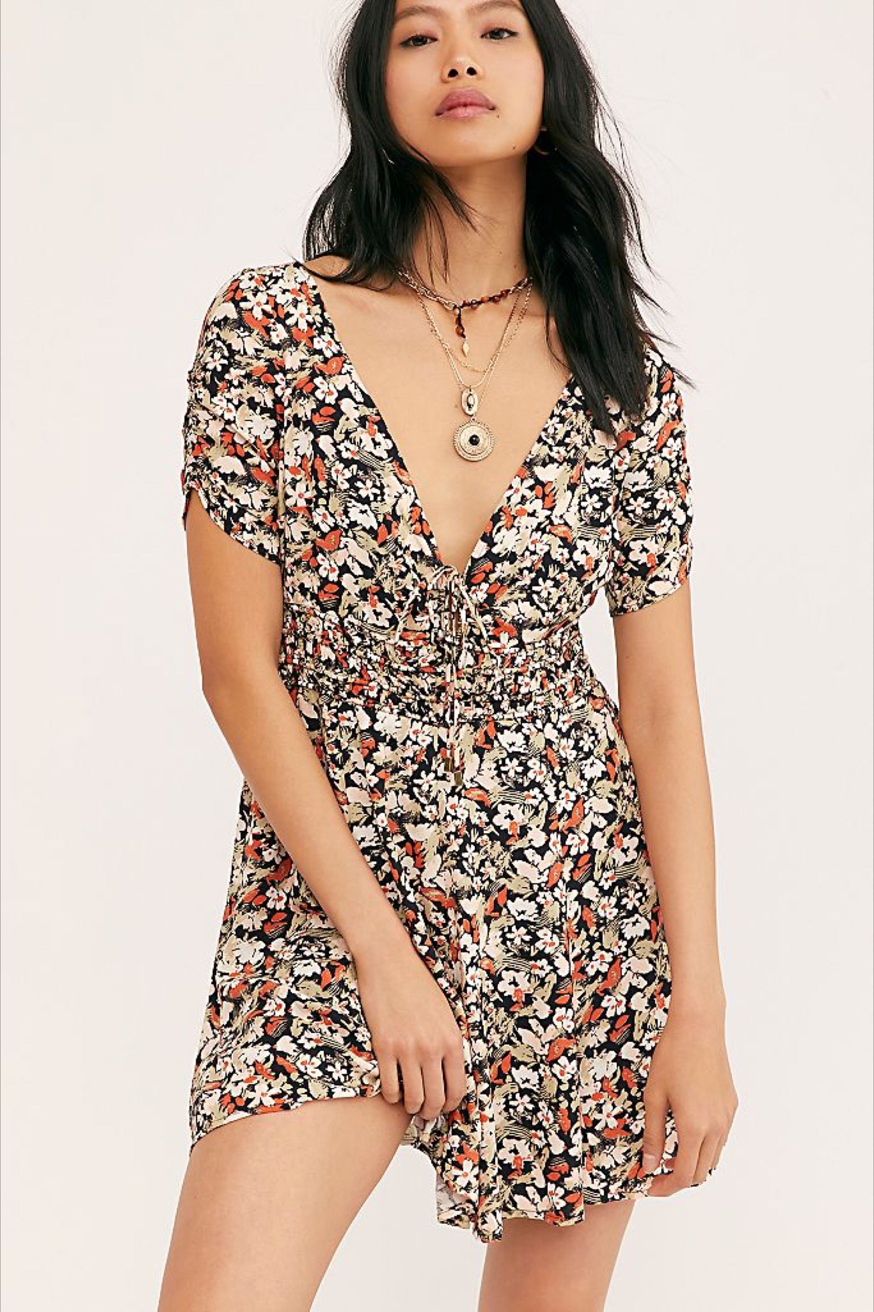 Femme and floral mini dress featuring V-neckline and front tie feature with defined waist for added shape.