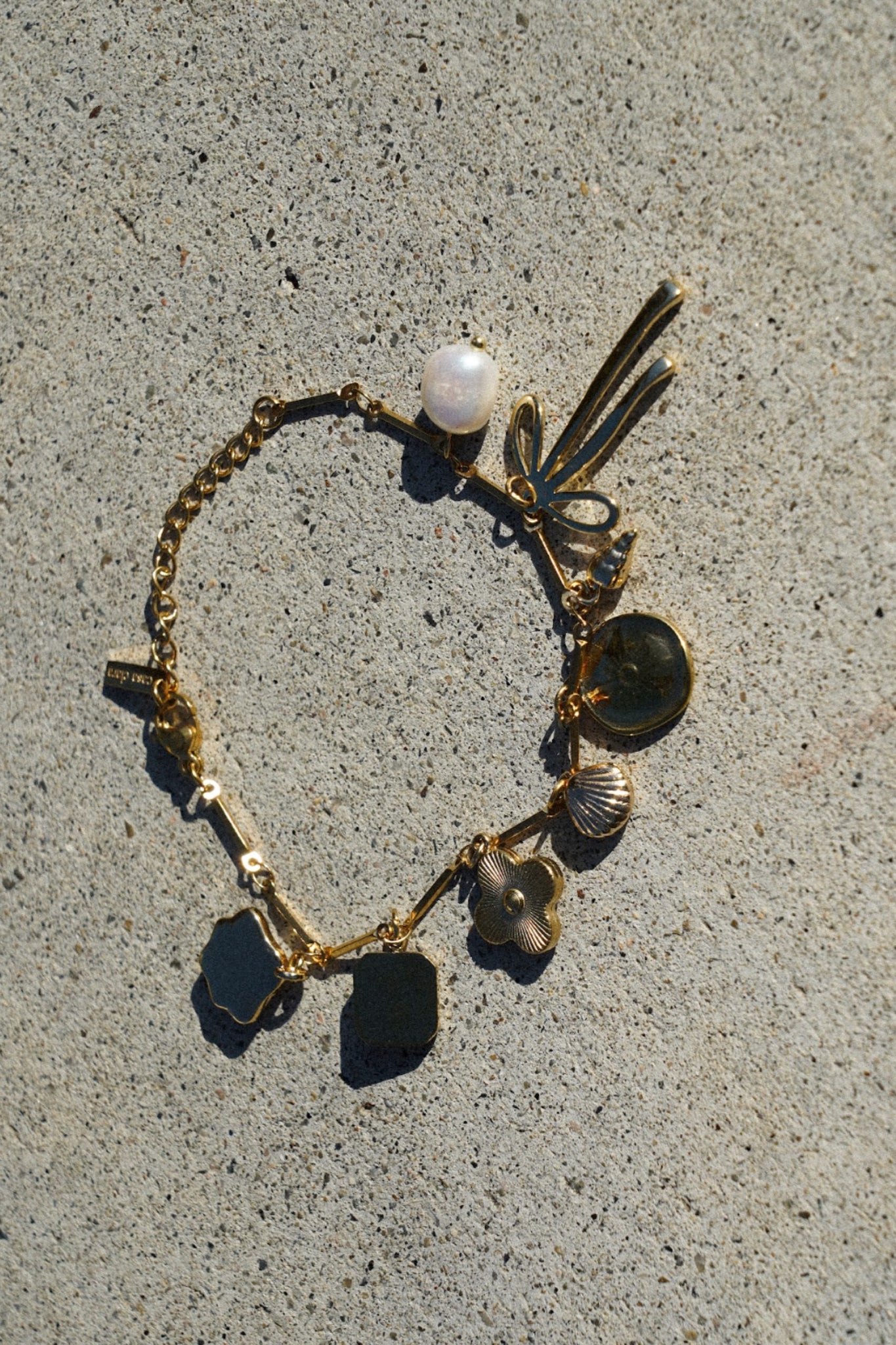Gold bracelet featuring vintage inspired charms and an adjustable closure.