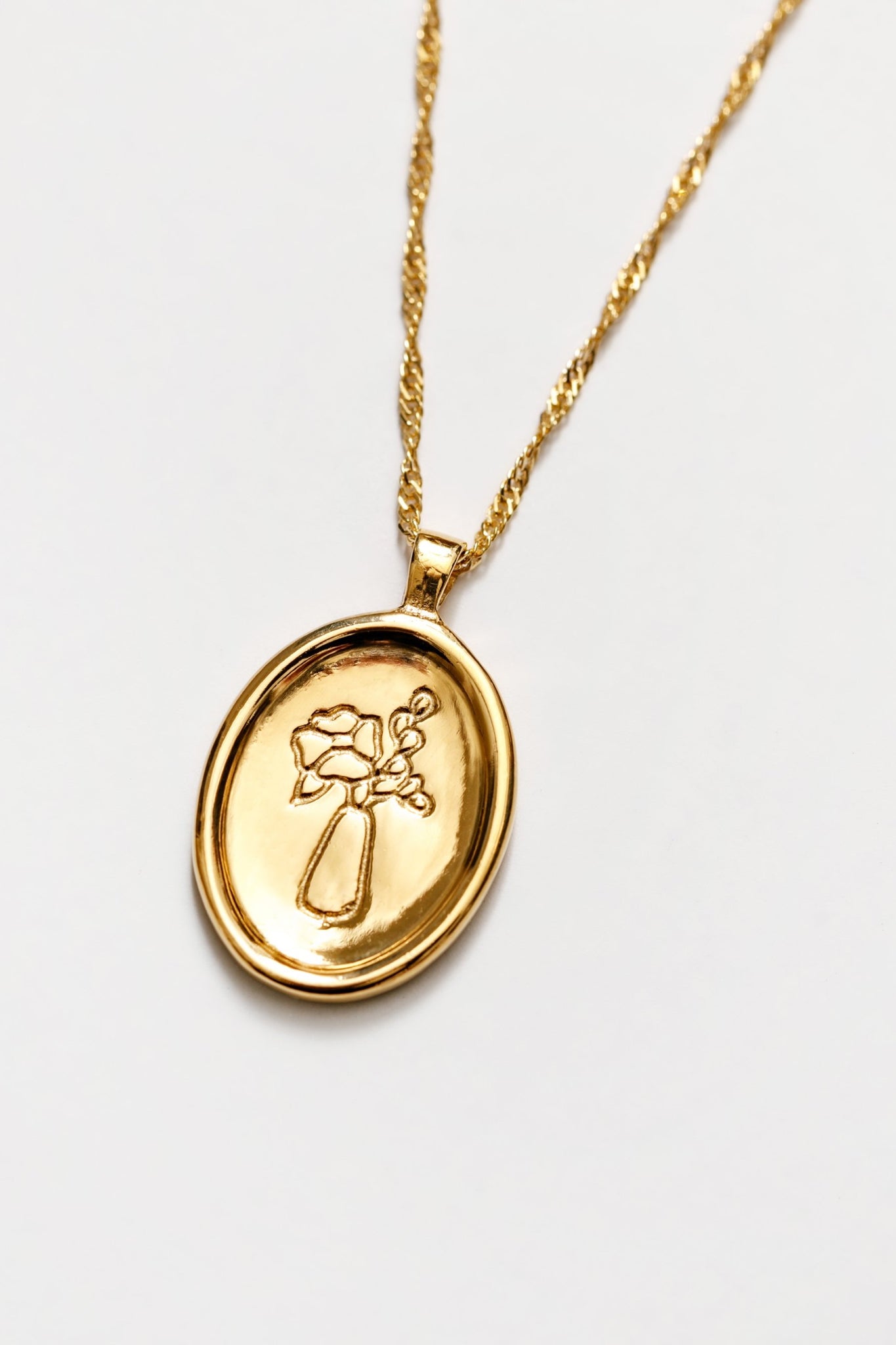 Gold cable chain necklace featuring a stamped bouquet oval charm. Made with recycled metals in Canada.