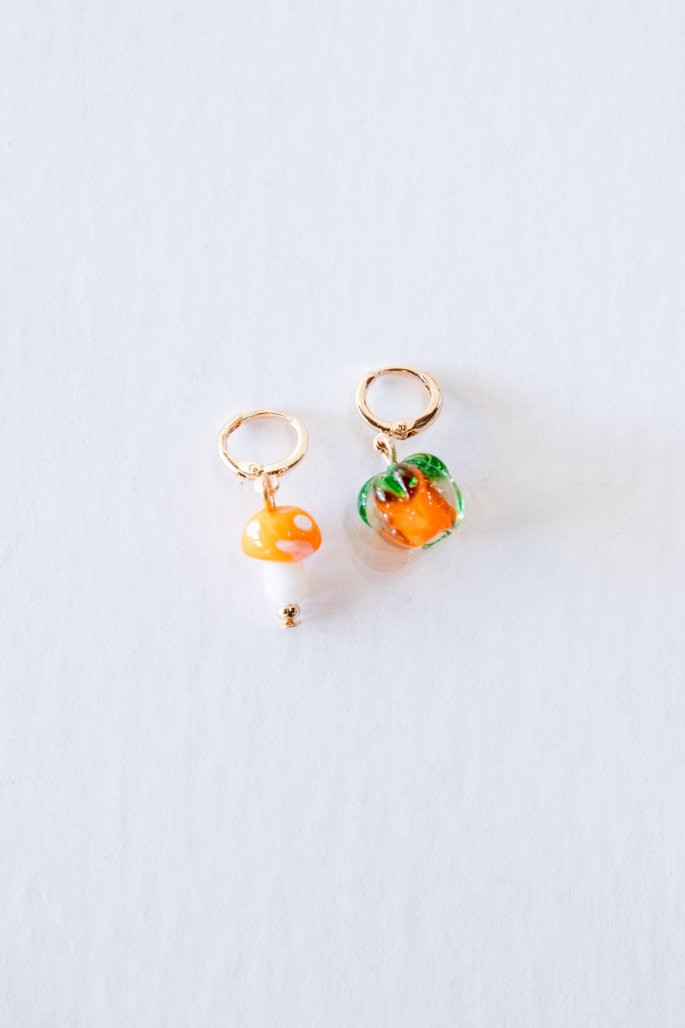 Multi rhinestone ear-cuff. Hoop with orange bead. Hoop with mushroom bead. Rhinestone stud.