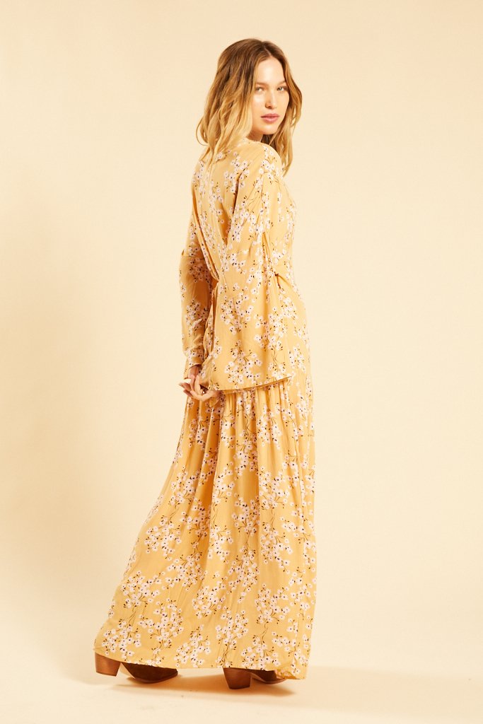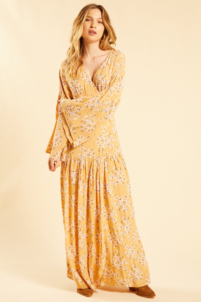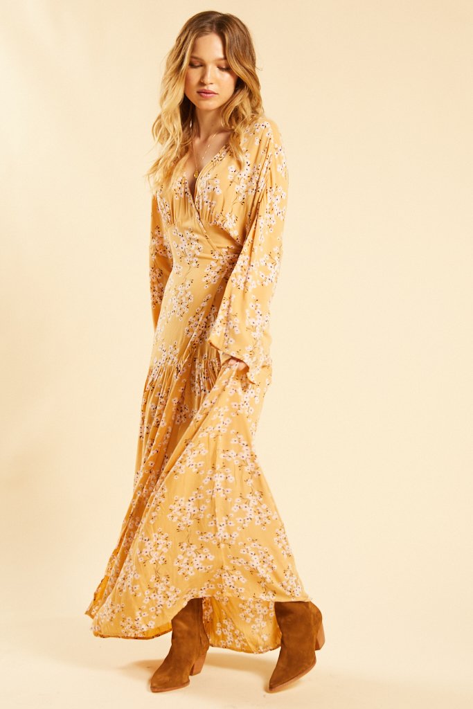 Drift into a golden state of mind with a flower field print and gypsy lines. The carefree wrap dress features a maxi length and long, flowy sleeves to match.