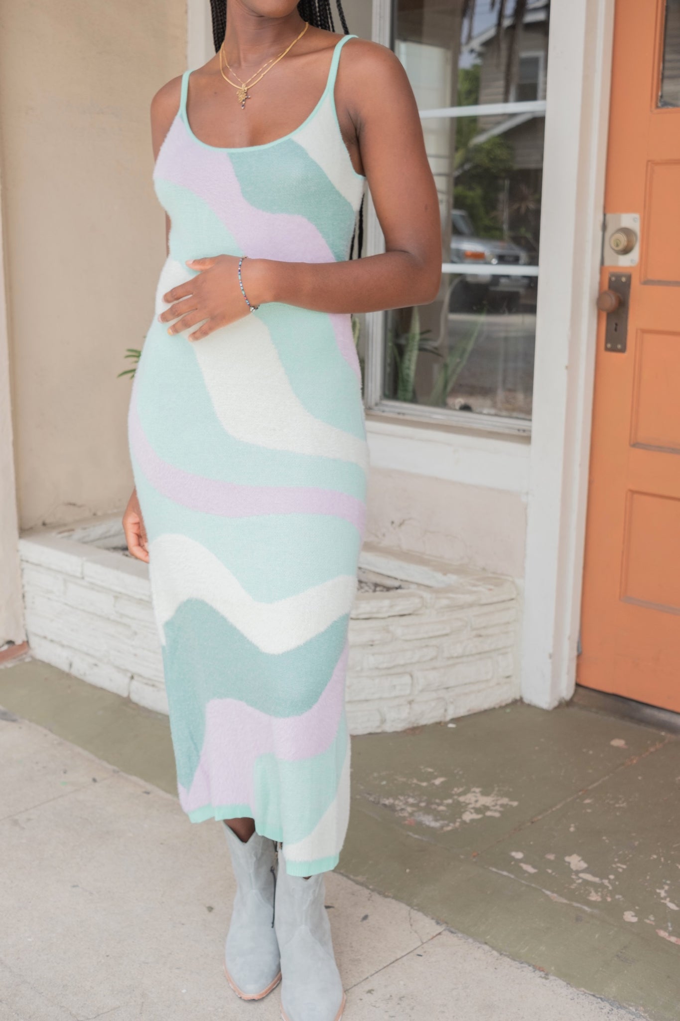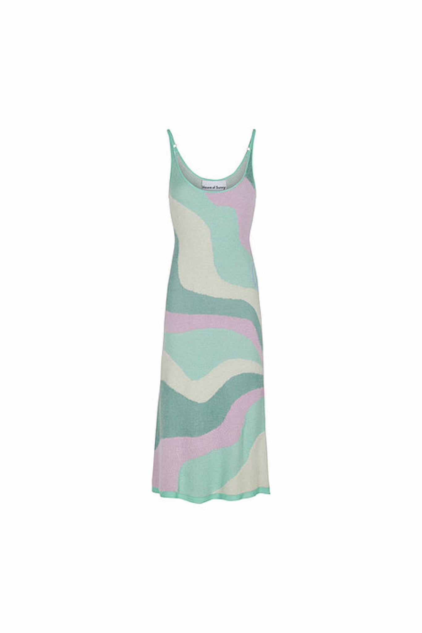 Knit midi length dress with back cut out detail and adjustable straps in an exclusive House of Sunny print.