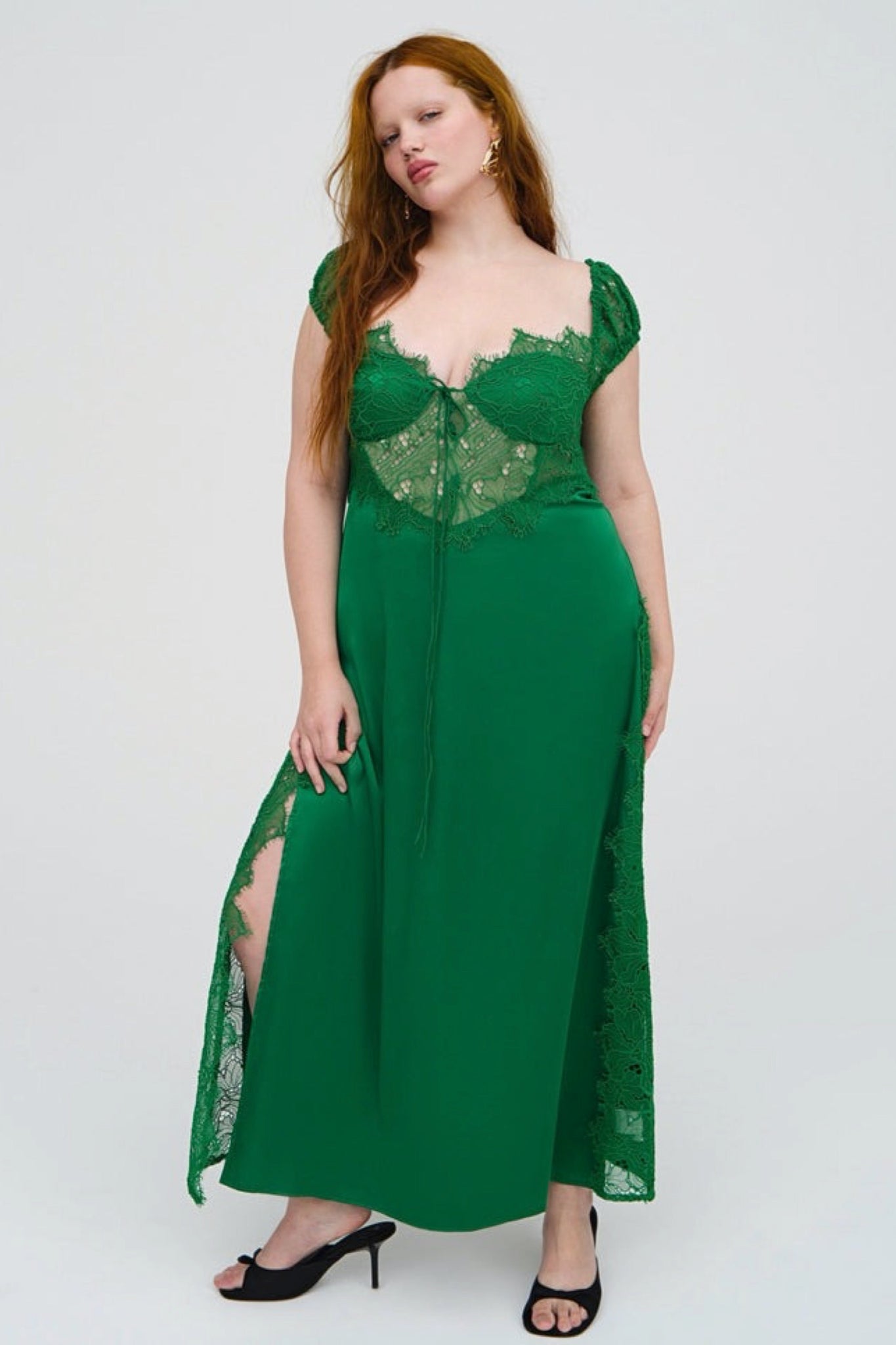 Pairs well with champagne. Corded lace V-neck dress with lined cups a sheer lace bodice and cap sleeves.