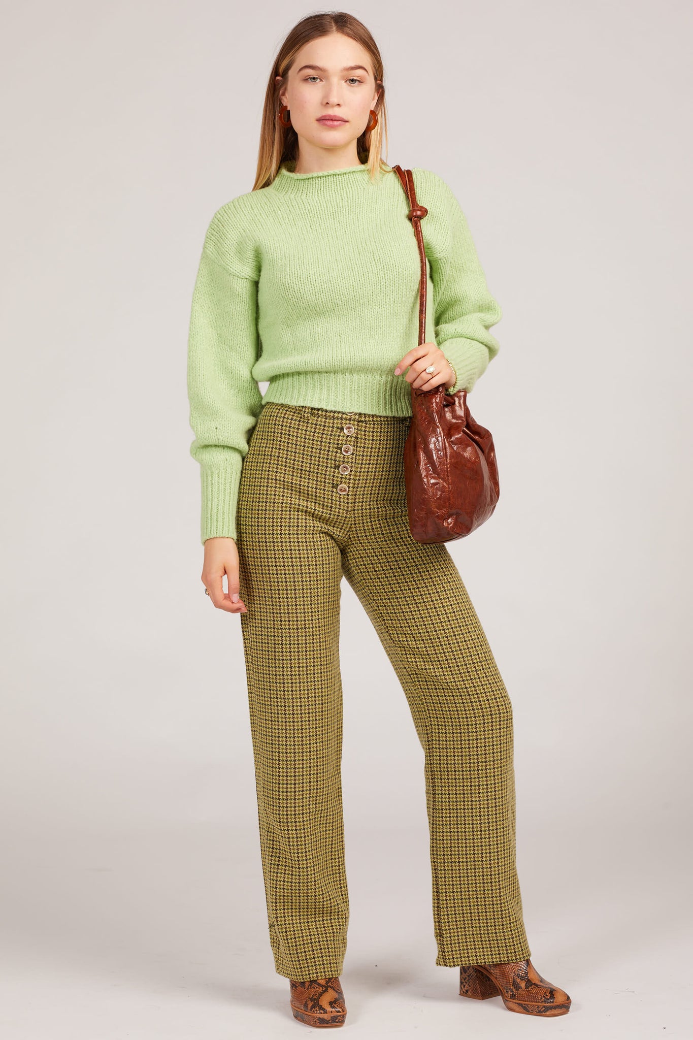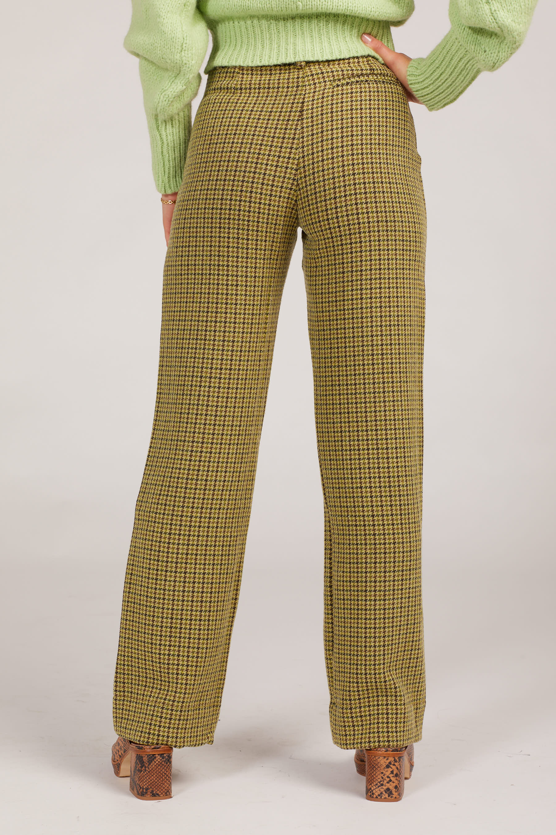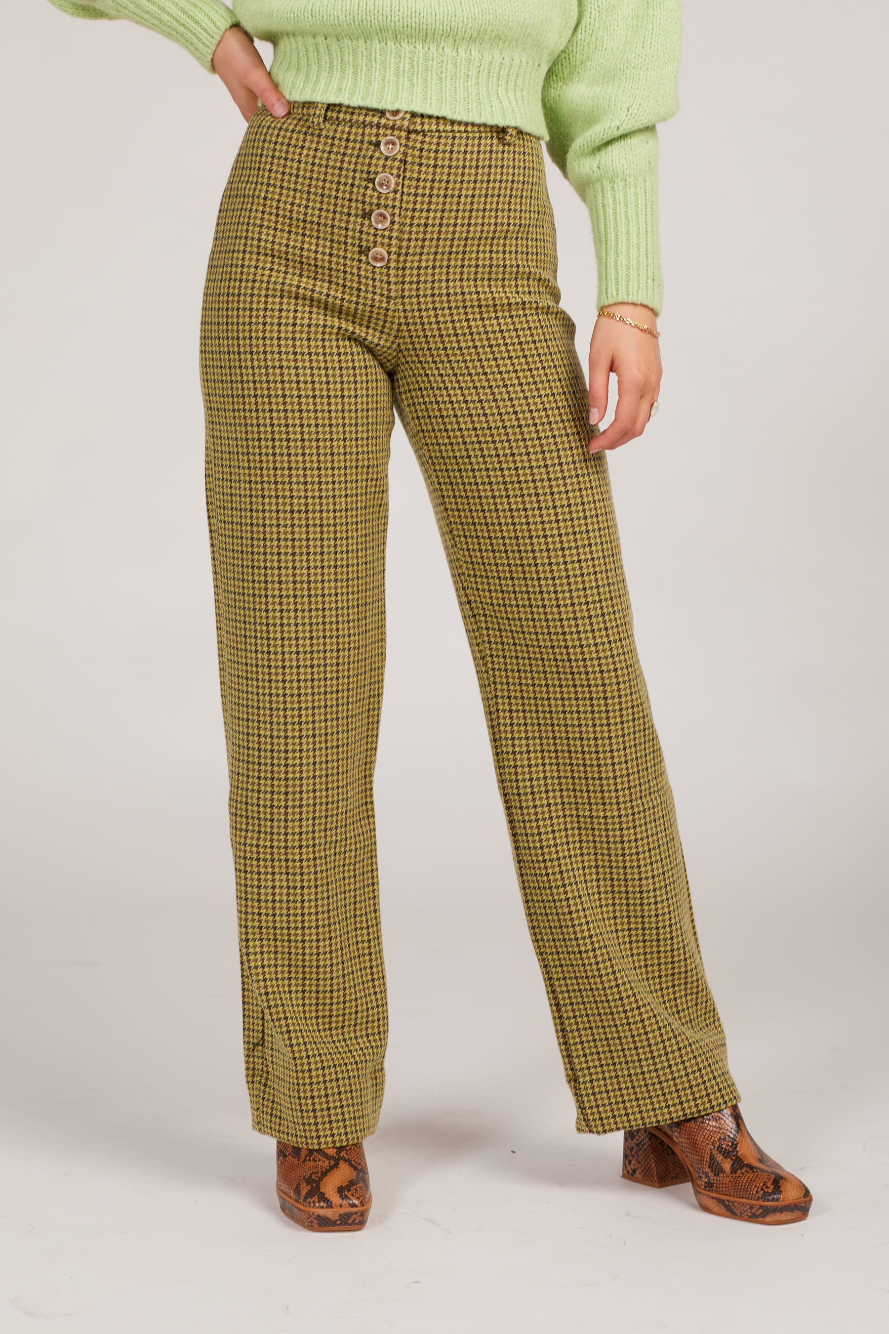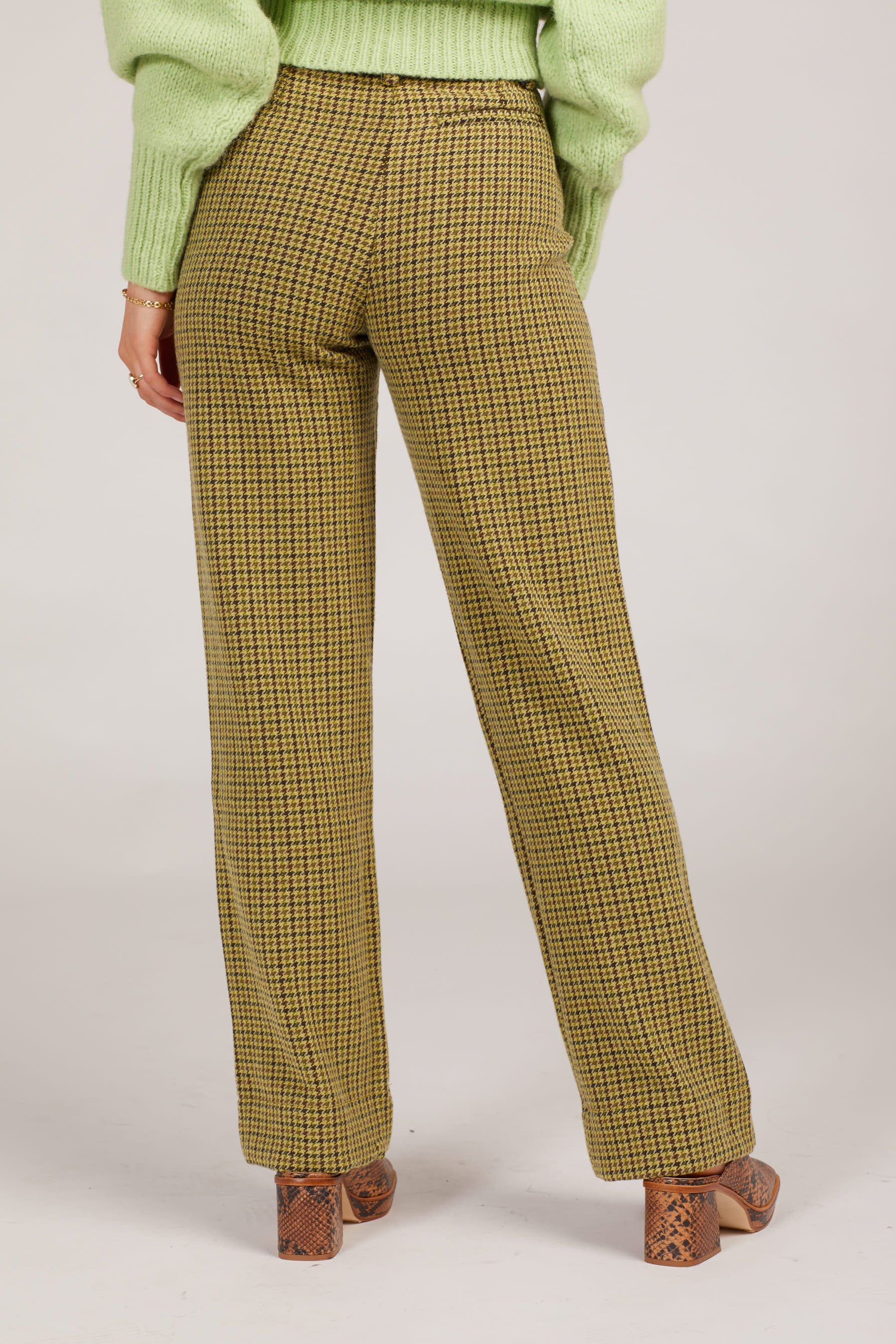 Green tweed houndstooth pants? Say no more. A high rise with a button up closure and the perfect lime tweed make for a piece that can be styled upscale or comfy and casual. Features belt loops and a single slip back pocket.